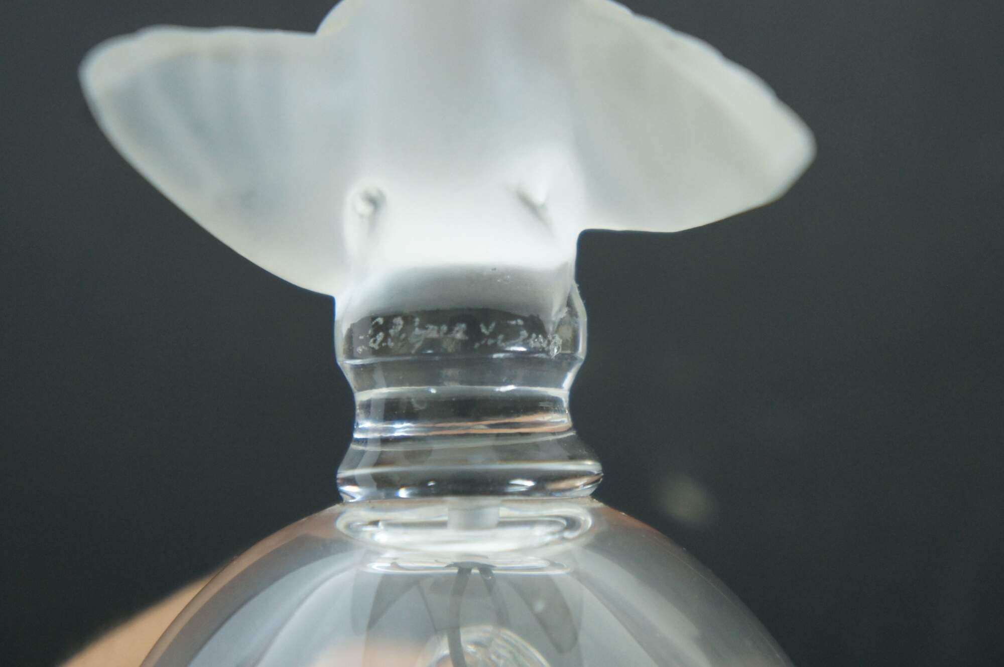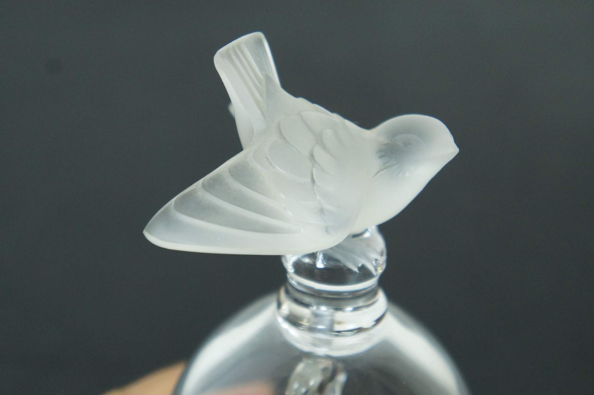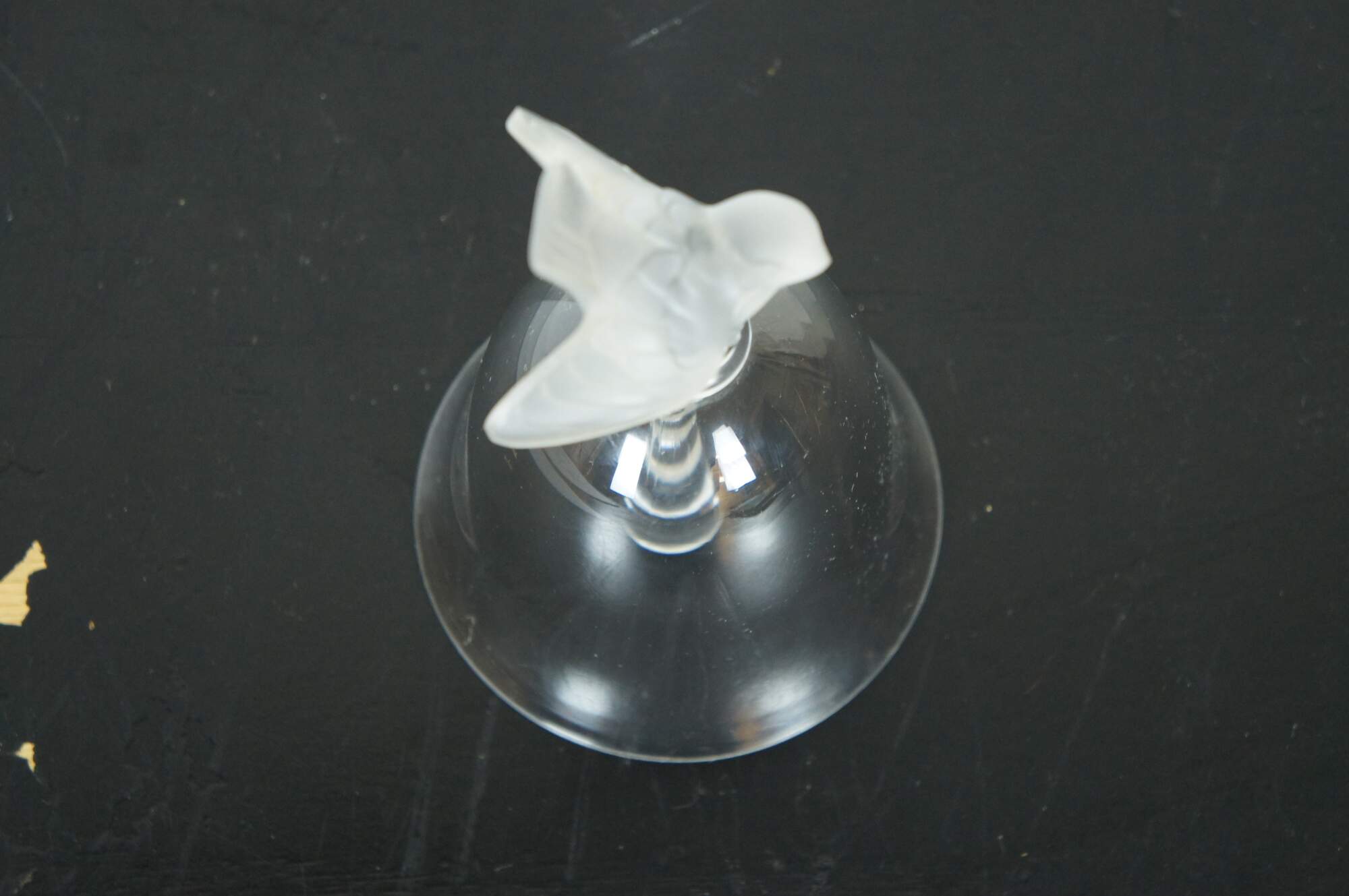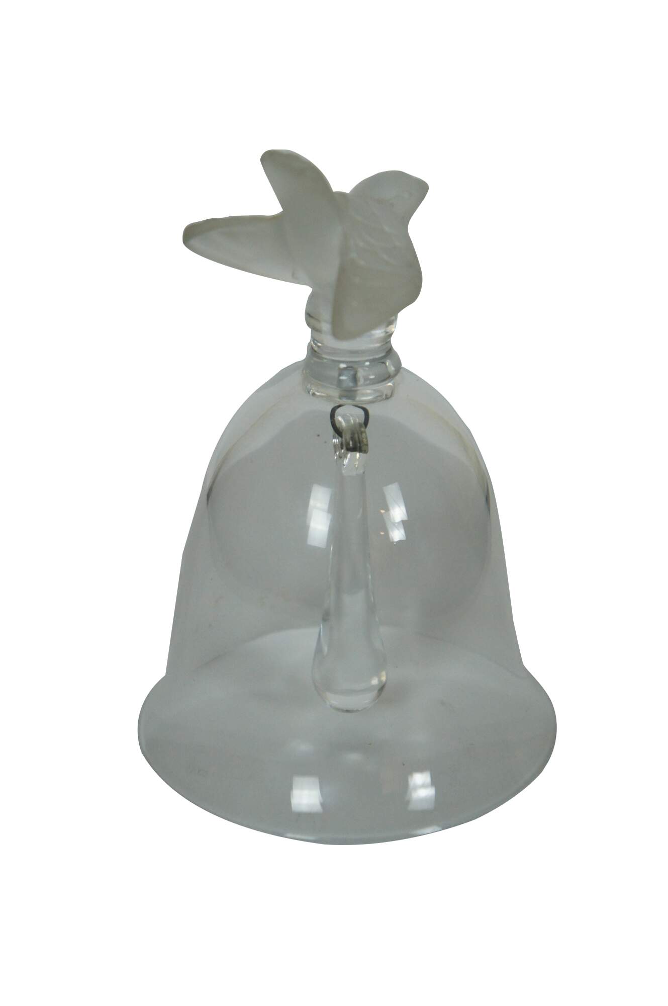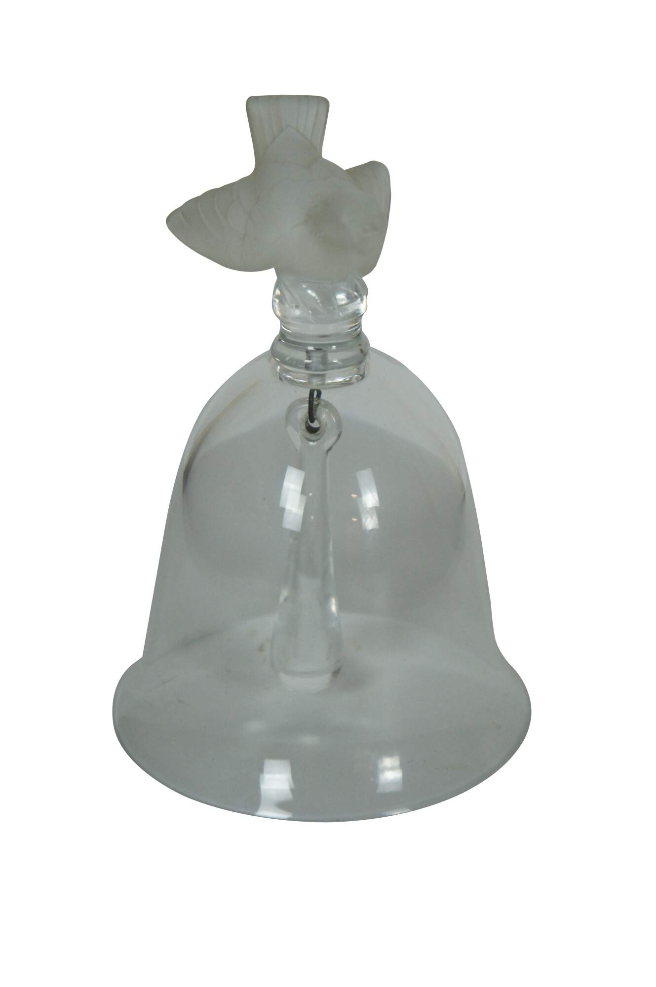 Late 20th century Lalique clear crystal hand bell with tear drop shaded clapper and frosted handle / finial in the shape of a small bird / sparrow with open wings. Signed at base of bird.