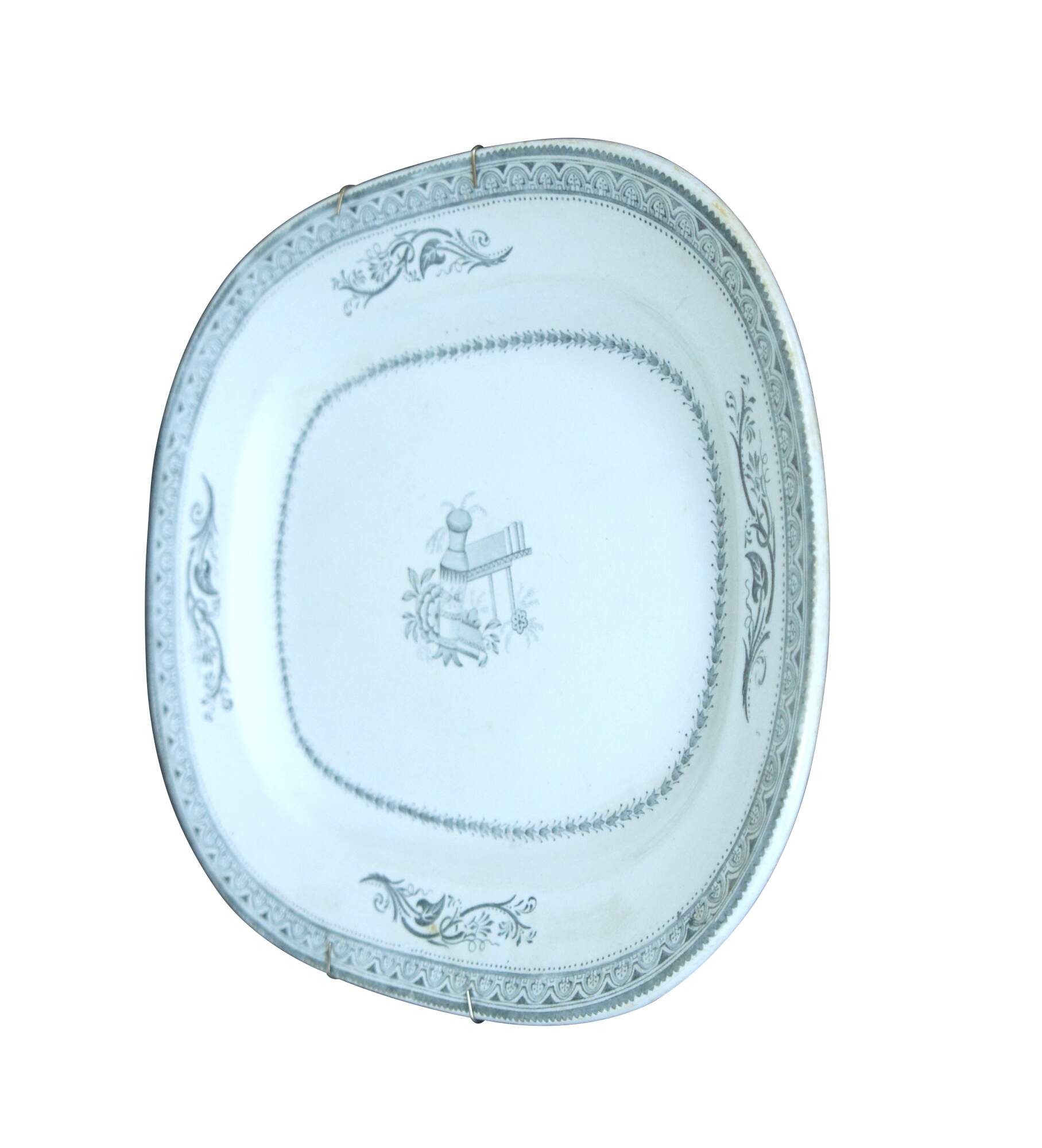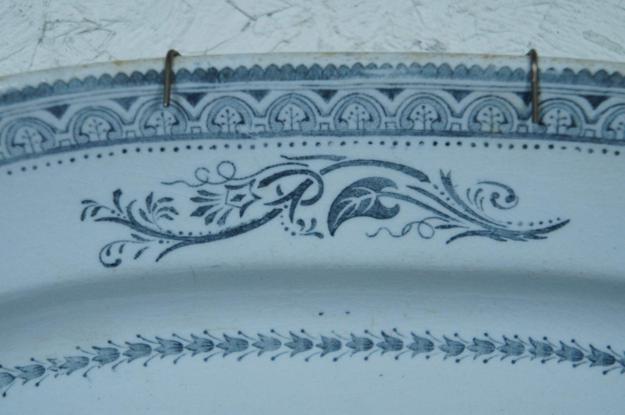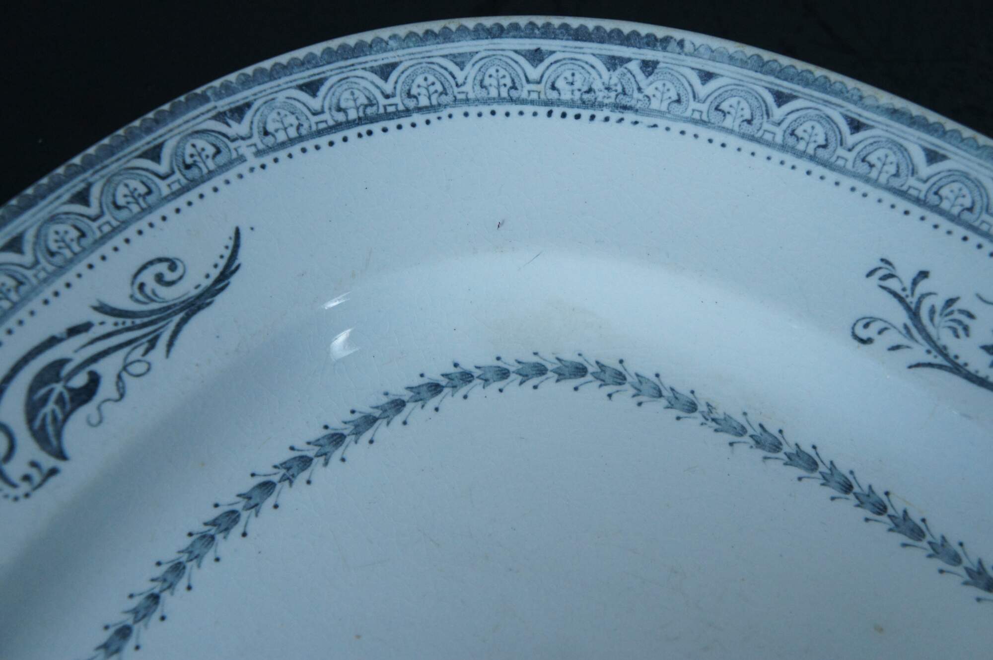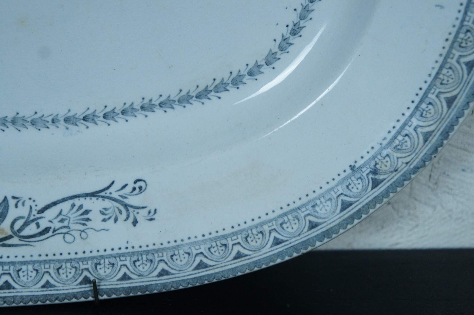 Large antique Thomas Till Grecian earthenware meat serving platter with blue-gray transferware design. Features and aesthetic Neoclassical / Gecian inspired border, sprigs of leaves and flowers around a central motif with an urn and cart. Base stamped D and incised 12. Circa 1860s - 1870s.