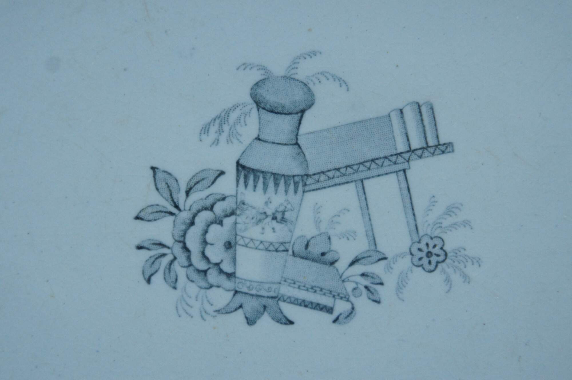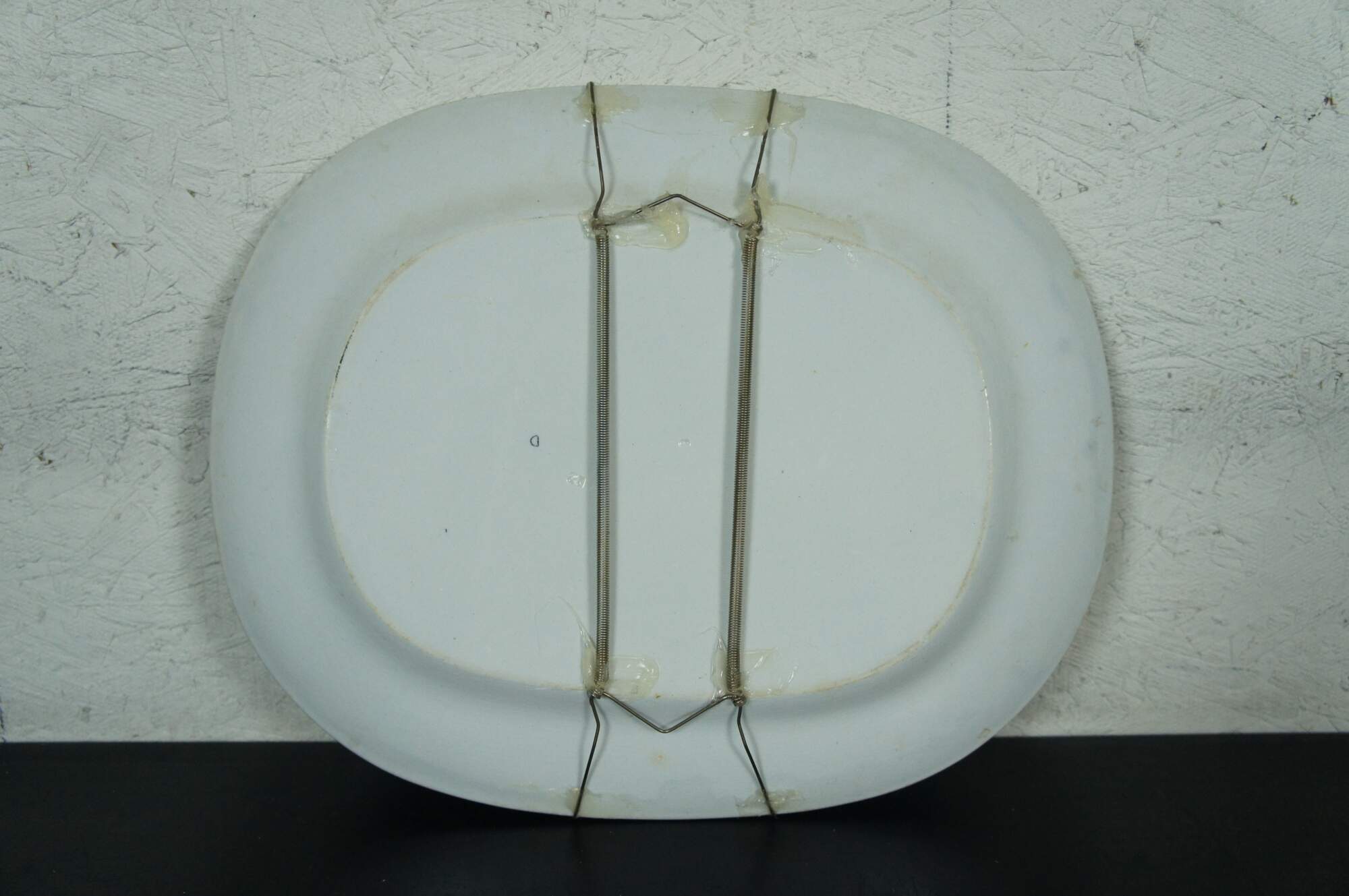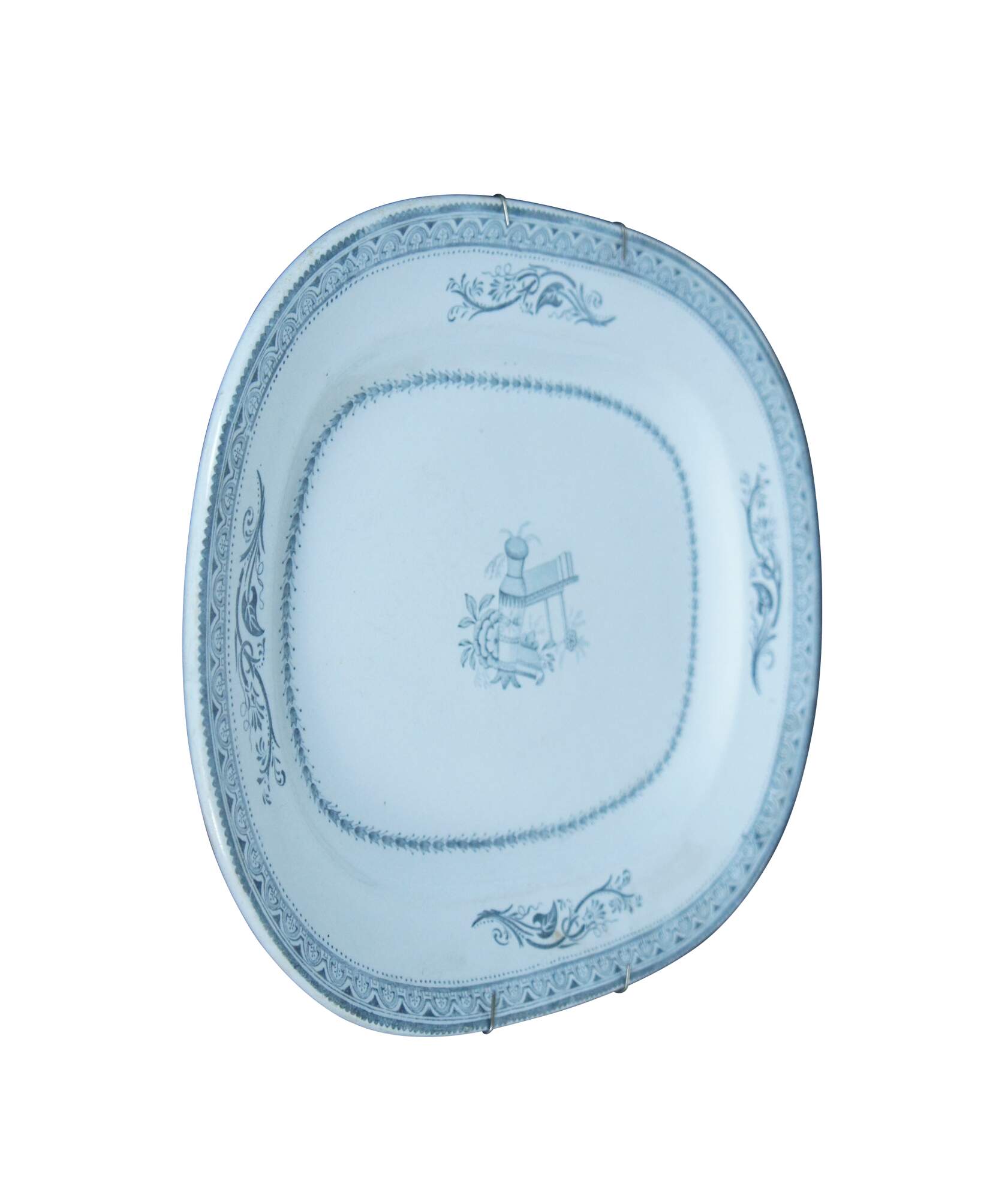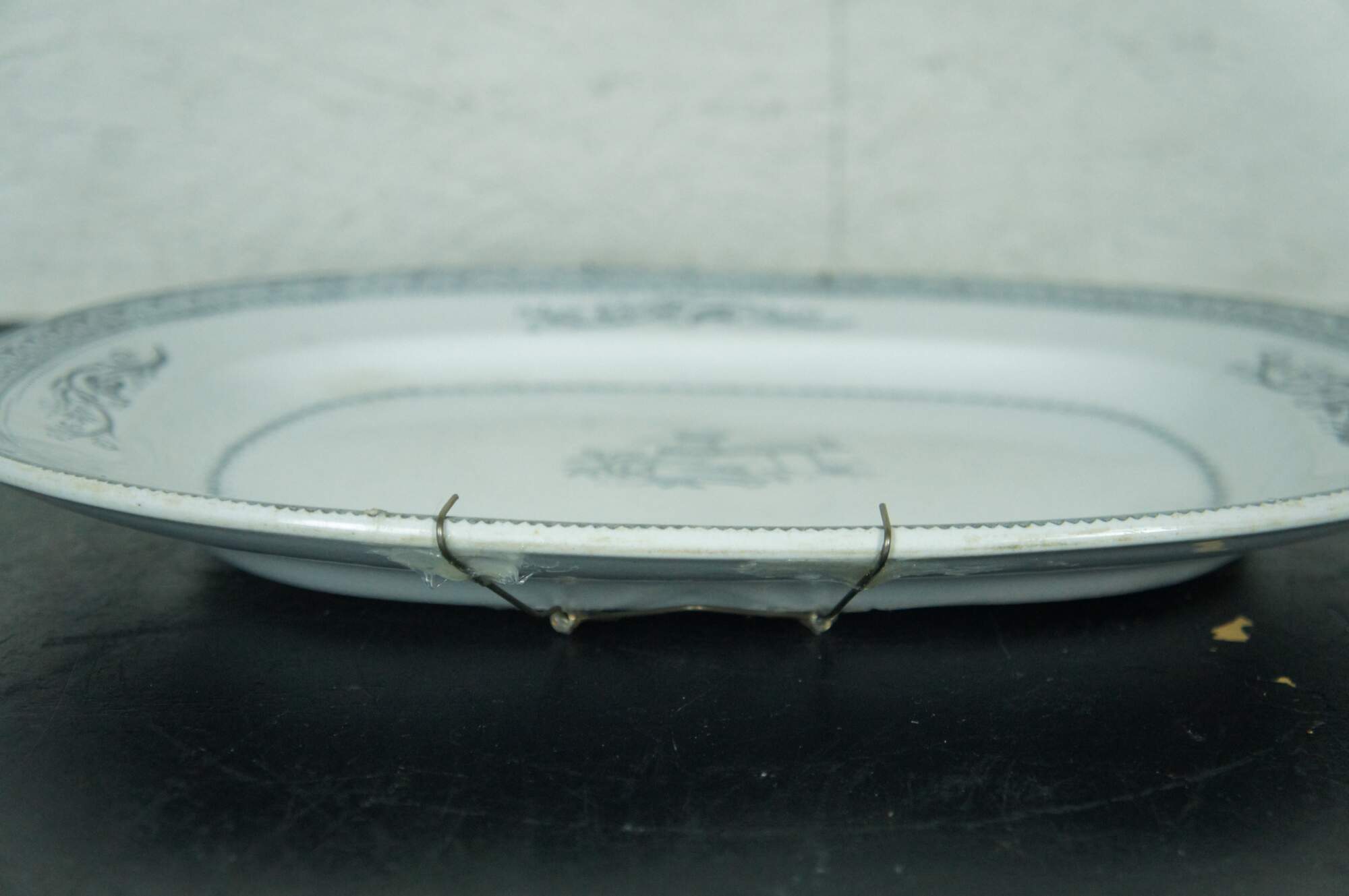 Large antique Thomas Till Grecian earthenware meat serving platter with blue-gray transferware design. Features and aesthetic Neoclassical / Gecian inspired border, sprigs of leaves and flowers around a central motif with an urn and cart. Base stamped D and incised 12. Circa 1860s - 1870s.