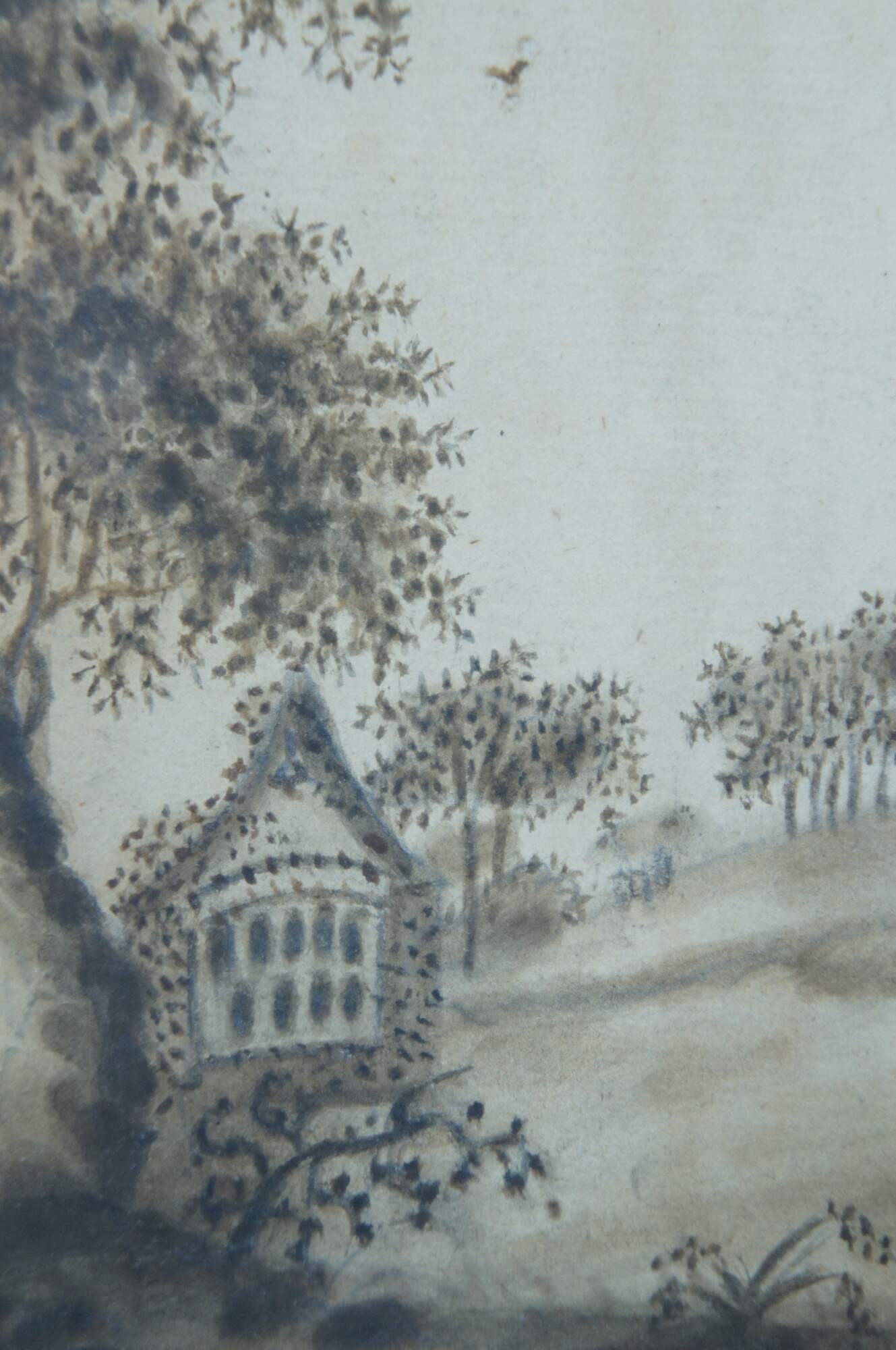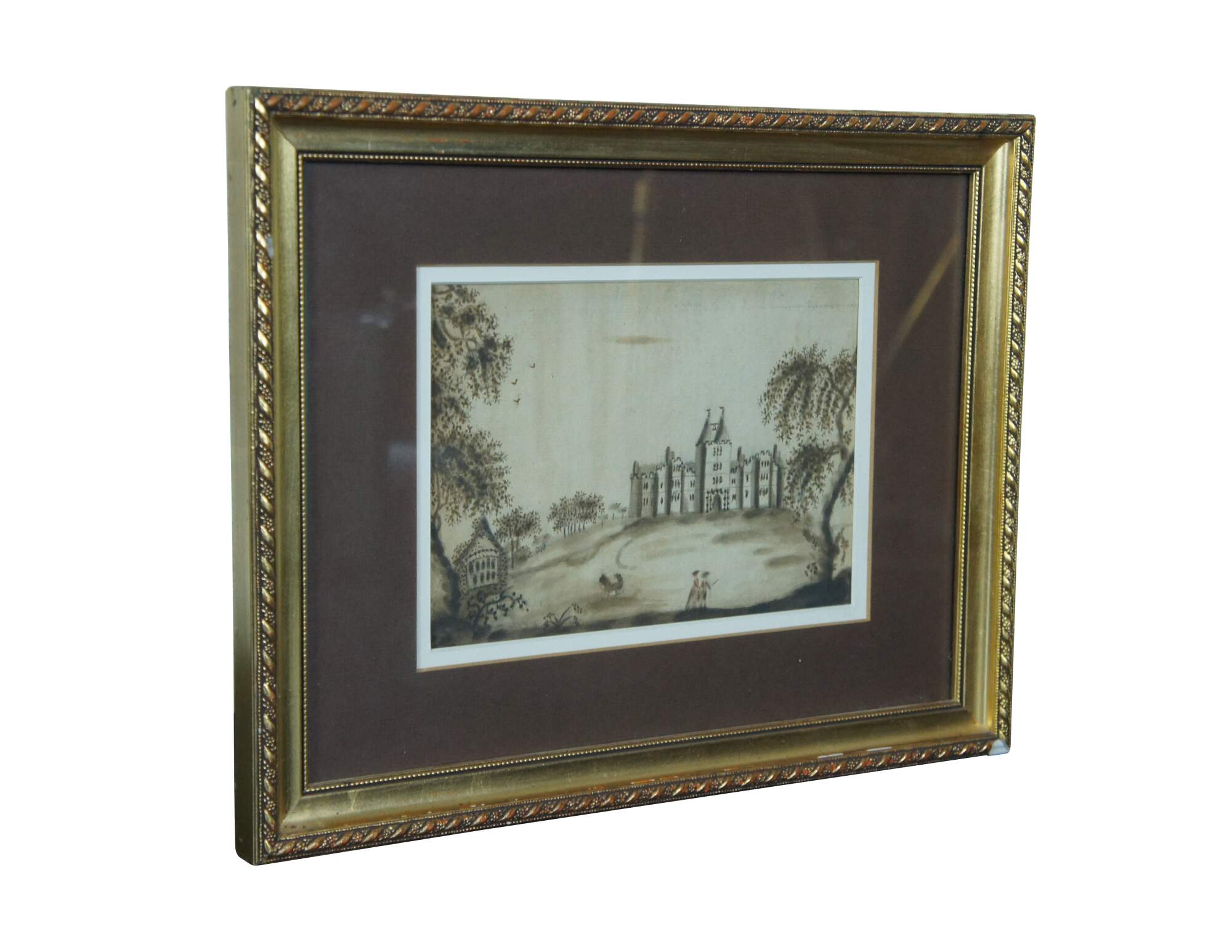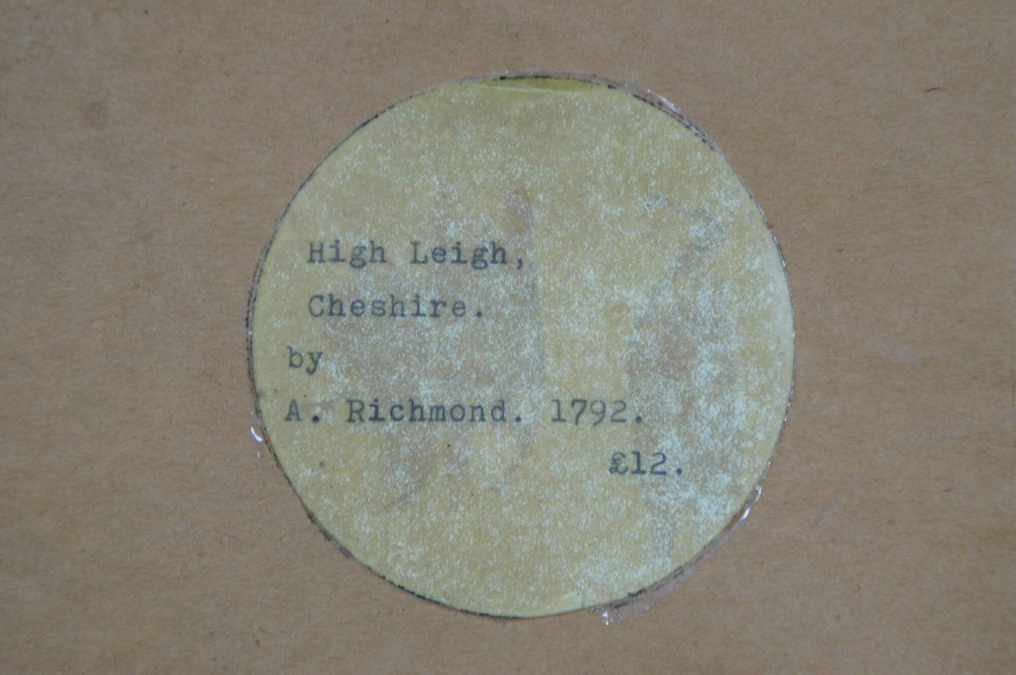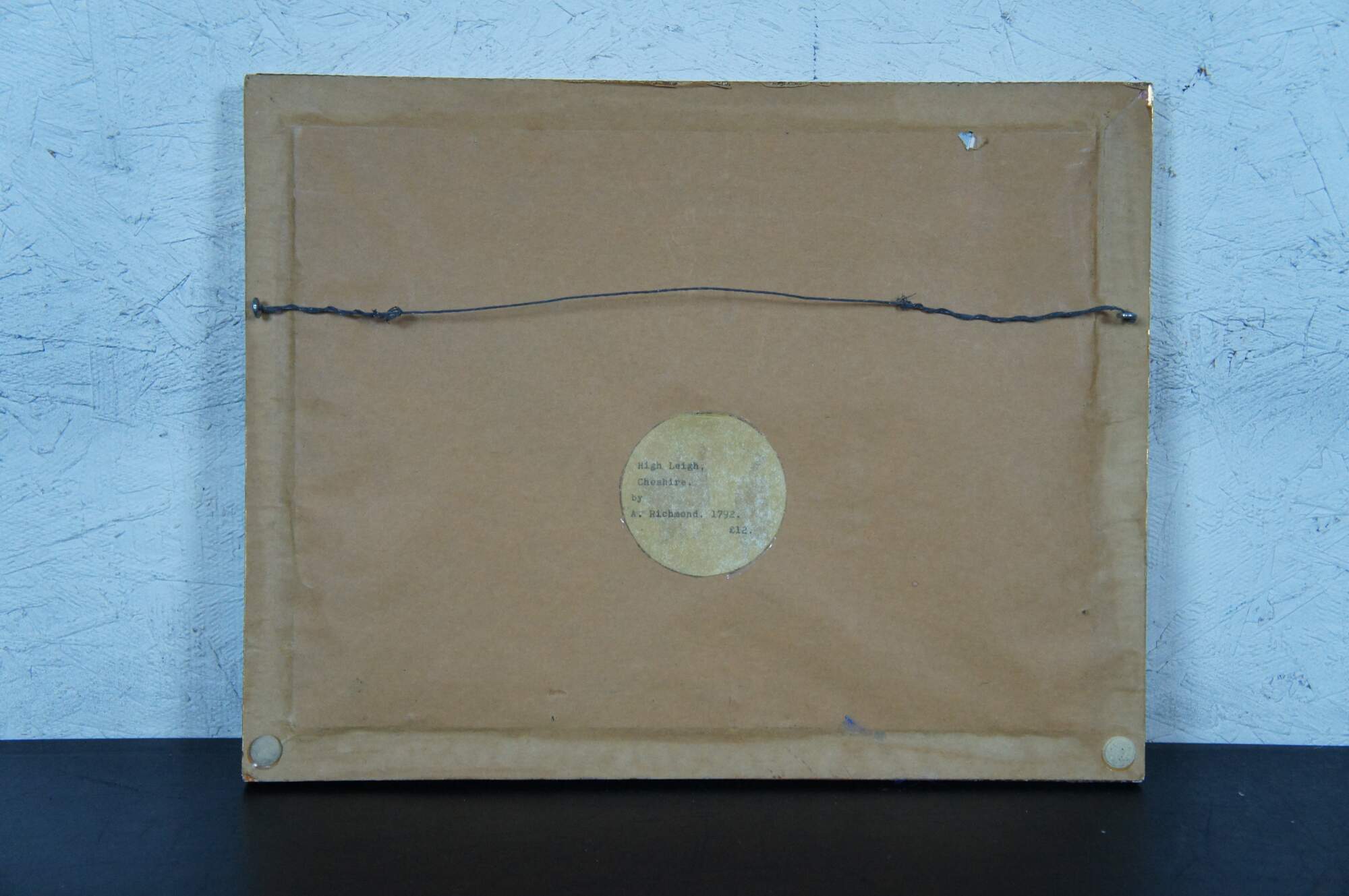Antique late 18th century watercolor on paper landscape painting of "High Leigh, Cheshire, England" by A. Richmond, 1792. Shows a sepia toned landscape with a large manor house or castle on a hill, with trees, figures and a large dog. Beveled gilt wood frame with carved grapevine detail; brown and white layered mat.