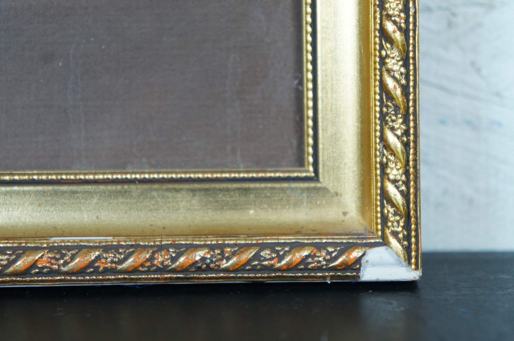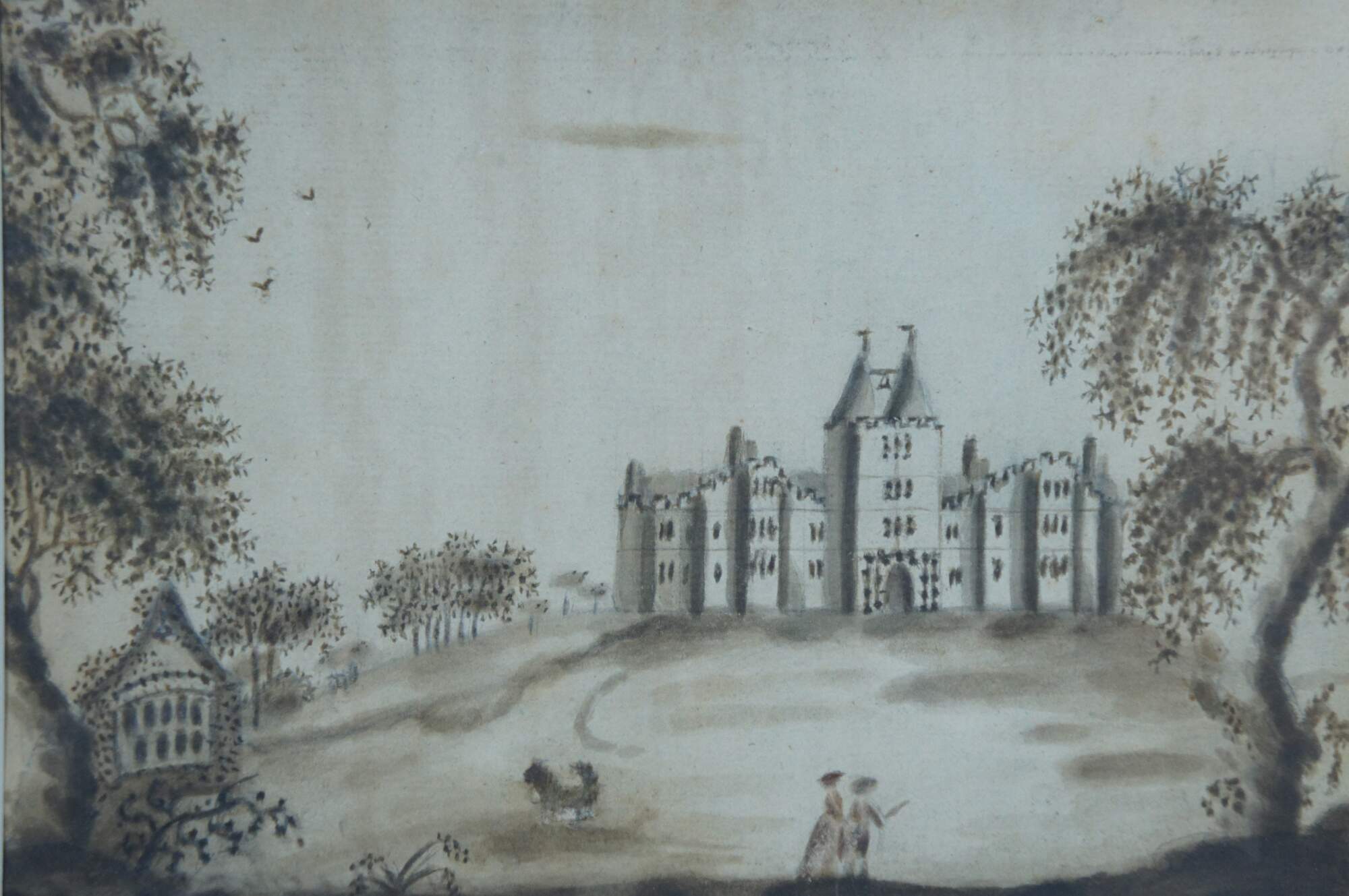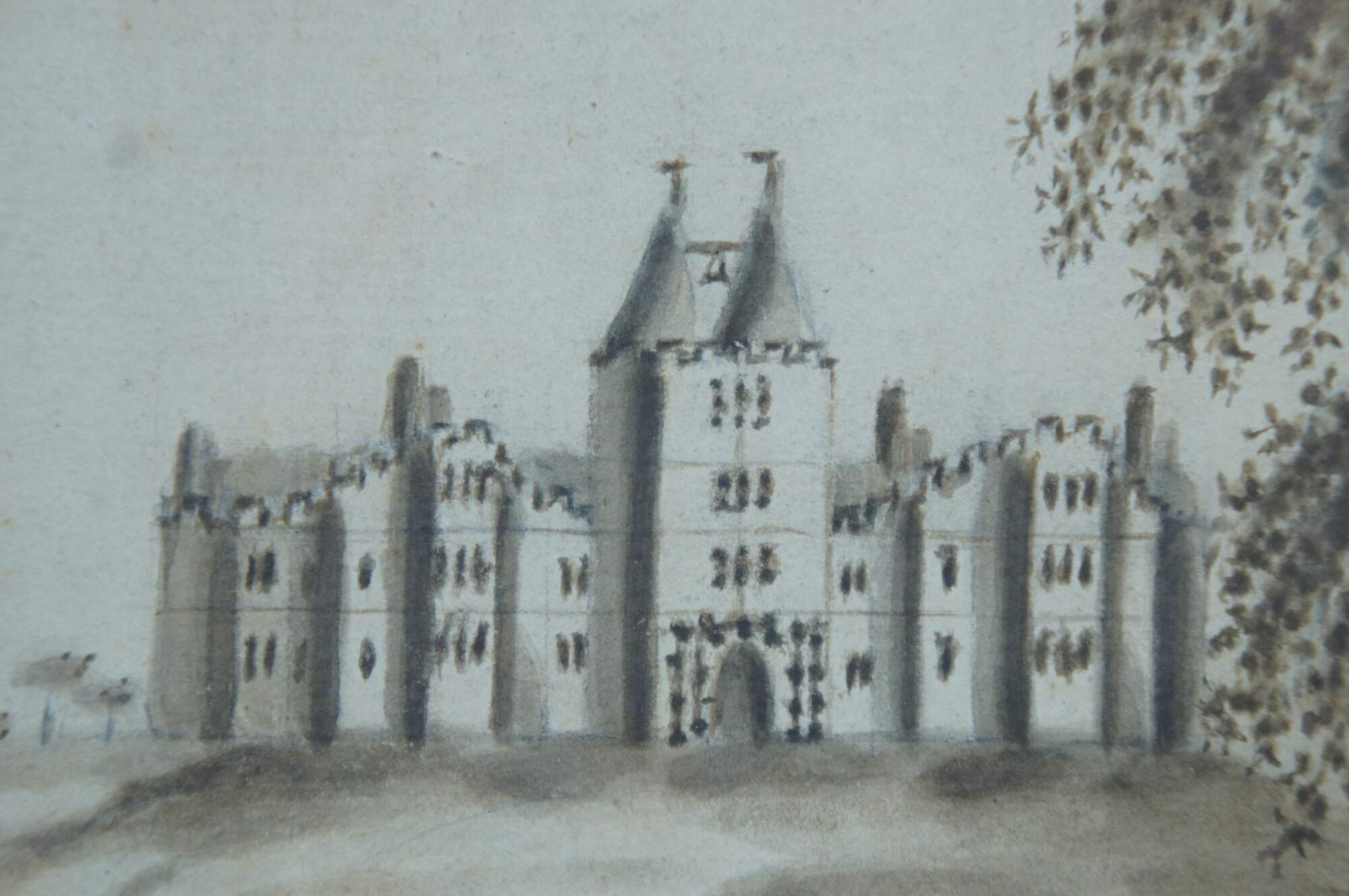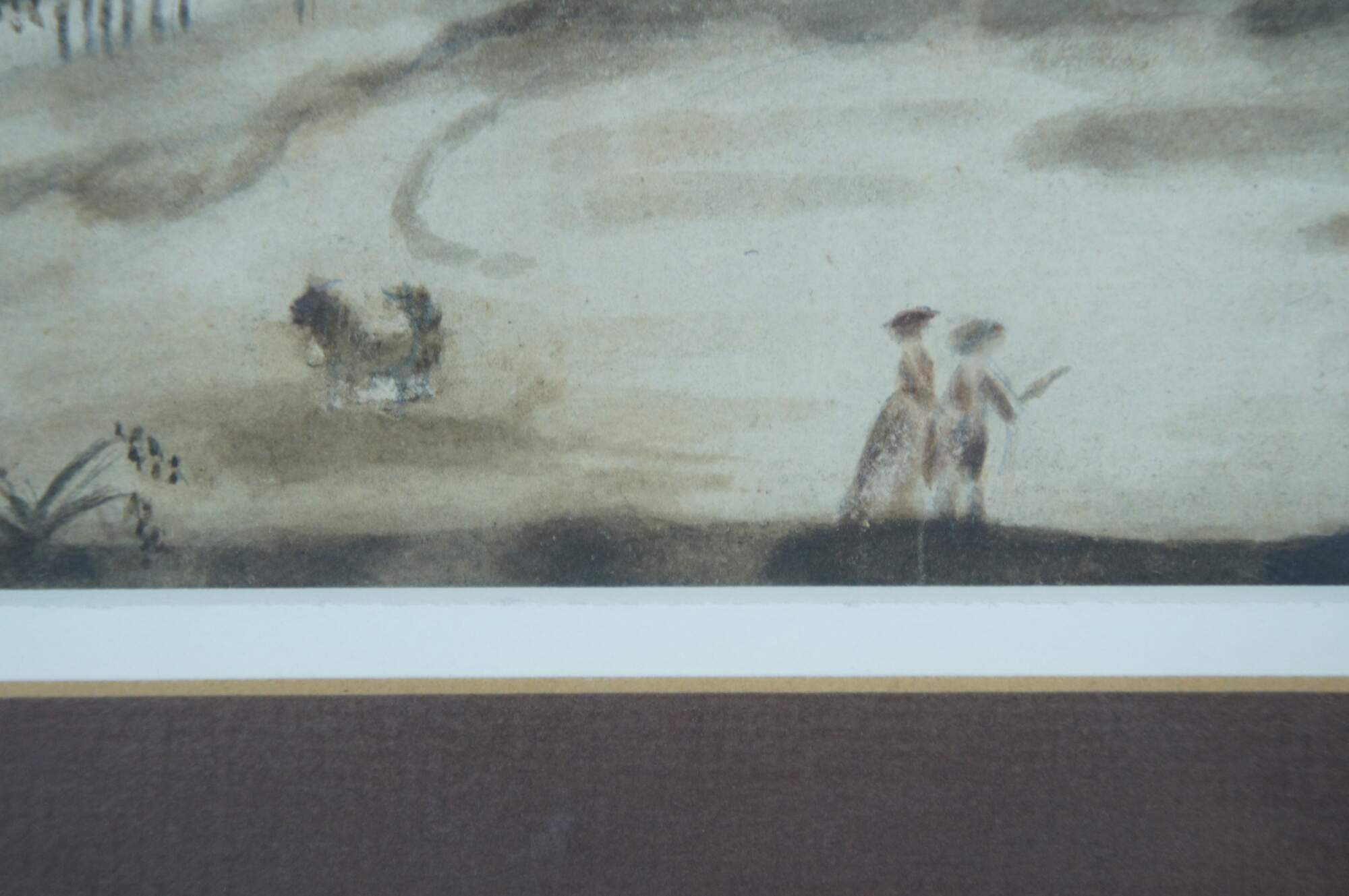Antique late 18th century watercolor on paper landscape painting of "High Leigh, Cheshire, England" by A. Richmond, 1792. Shows a sepia toned landscape with a large manor house or castle on a hill, with trees, figures and a large dog. Beveled gilt wood frame with carved grapevine detail; brown and white layered mat.