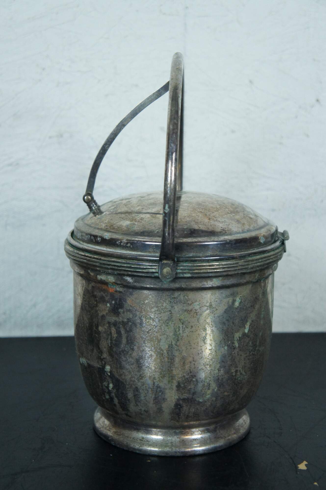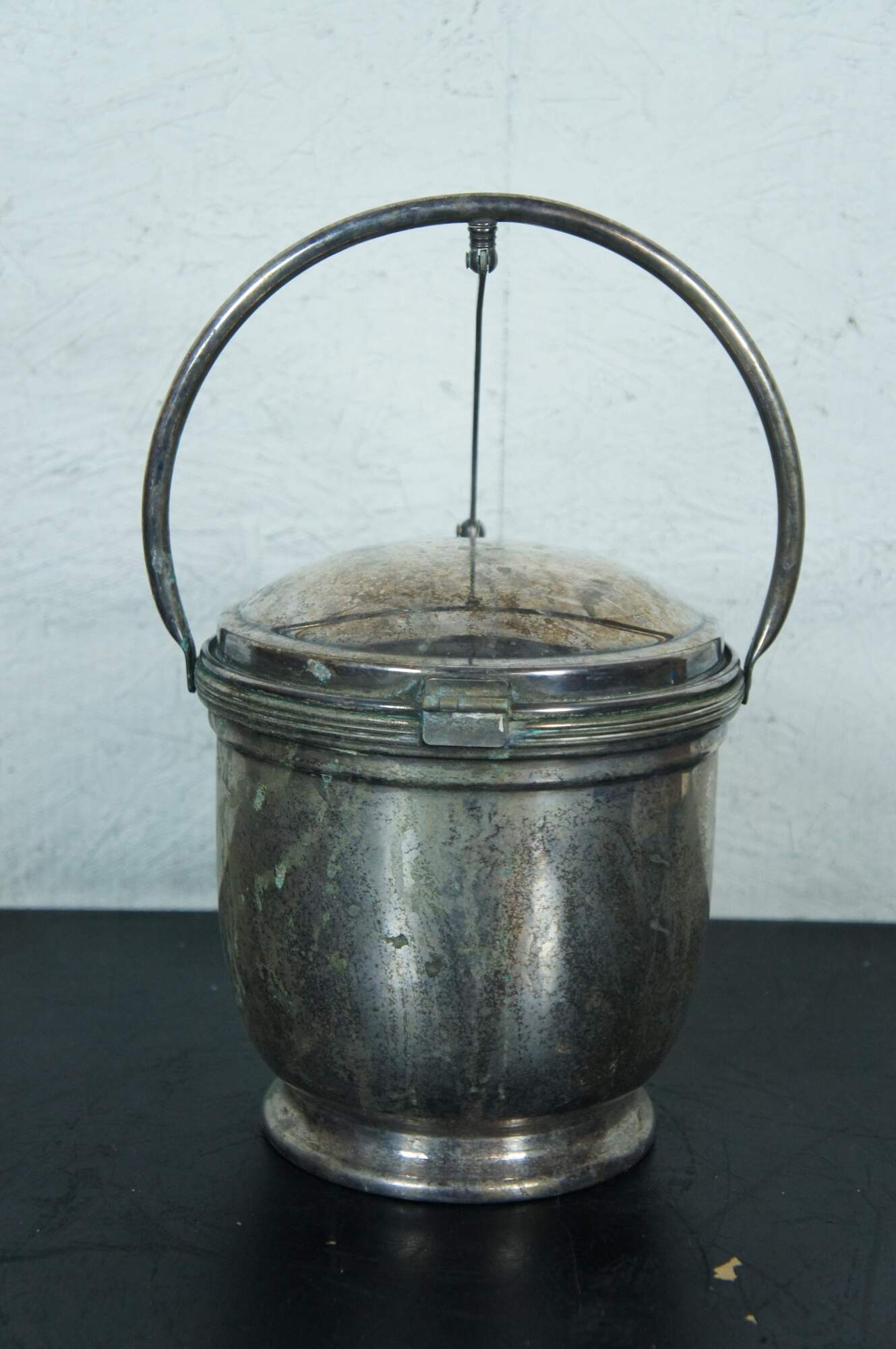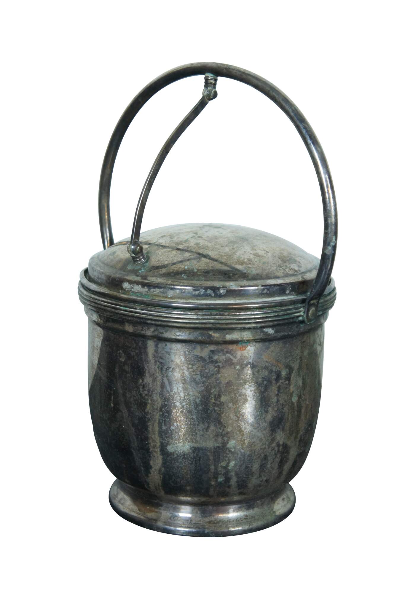 Early 20th century silver plate vacuum insulated ice bucket by Forbes Silver Company. Plain round design with simple art deco ridges around the rim; lid swivels open attached to handle.