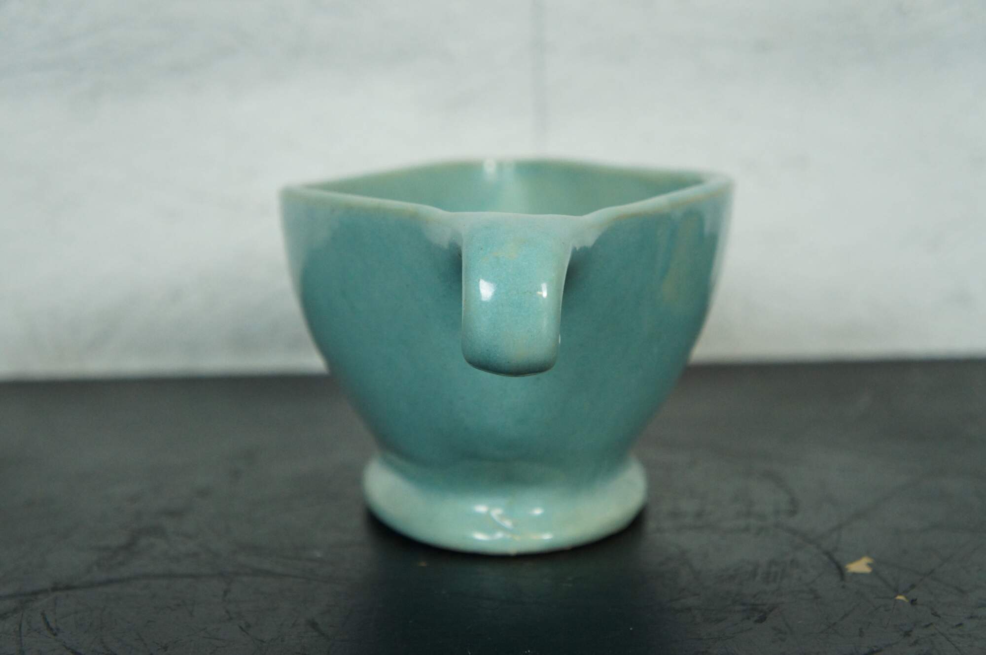 Circa mid 20th century ceramic cachepot / planter / jardiniere / urn, featuring oval Neoclassical styling with downward curling ends and footed base. Glazed in light blue / turquoise.
