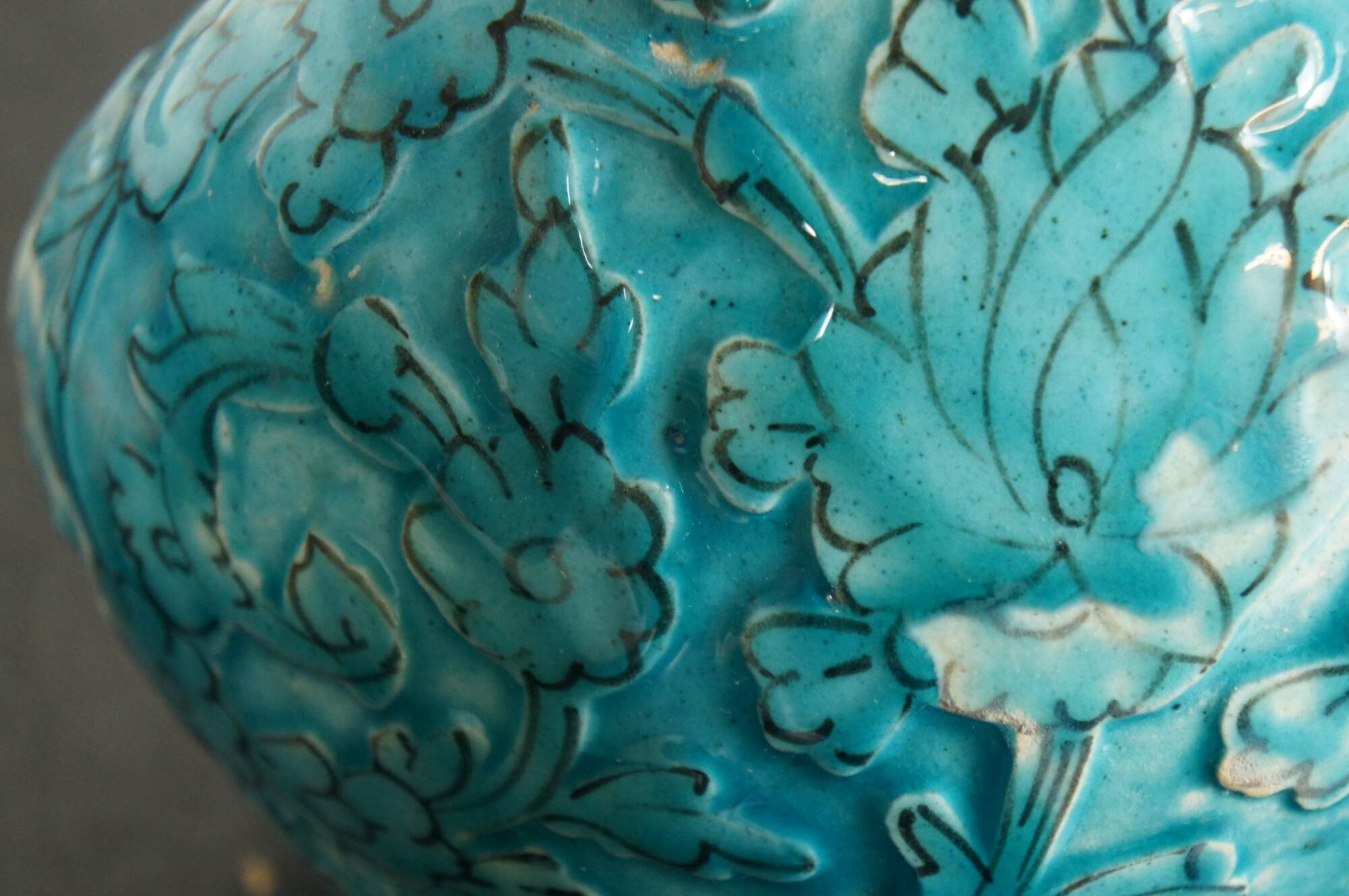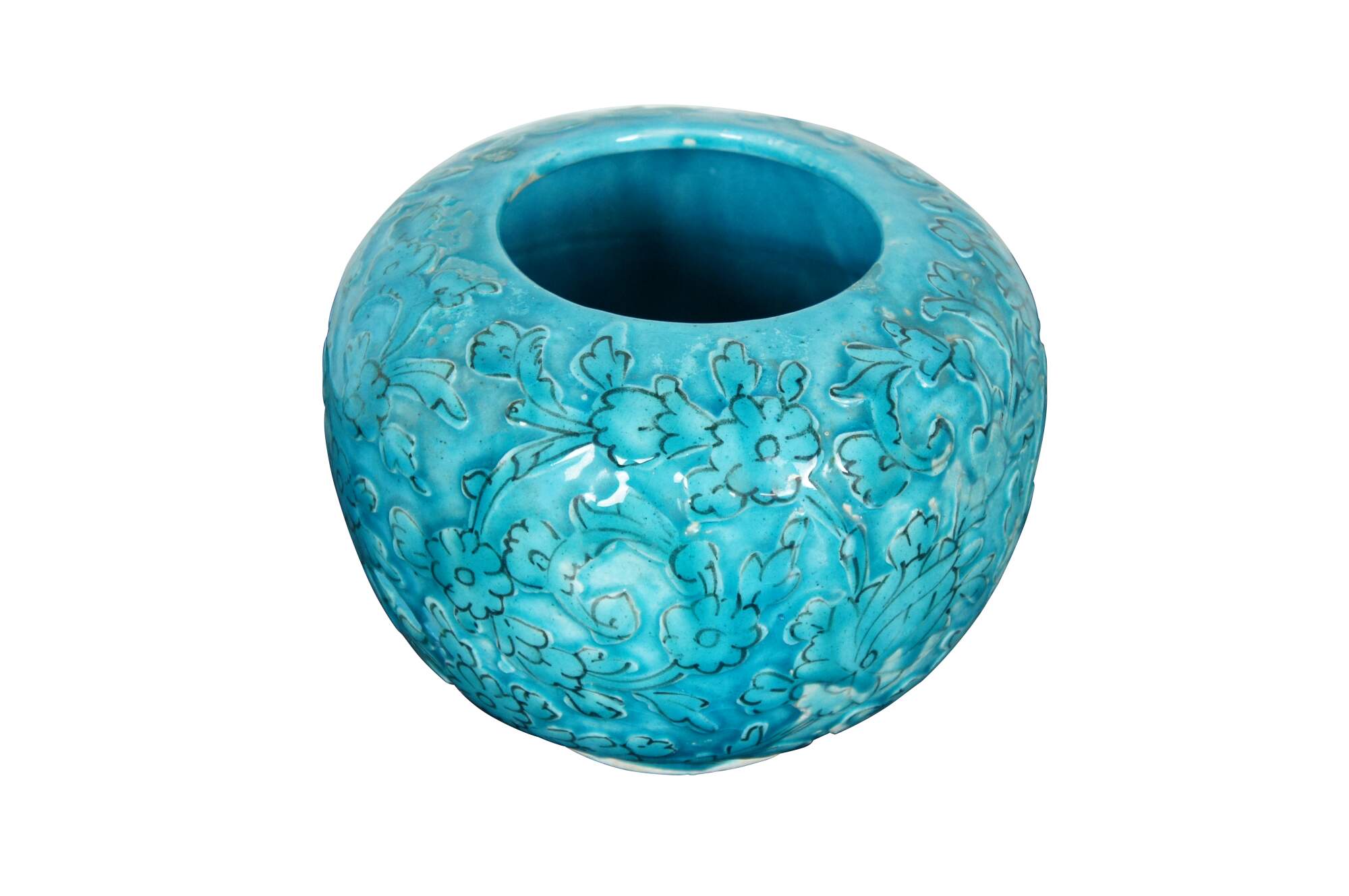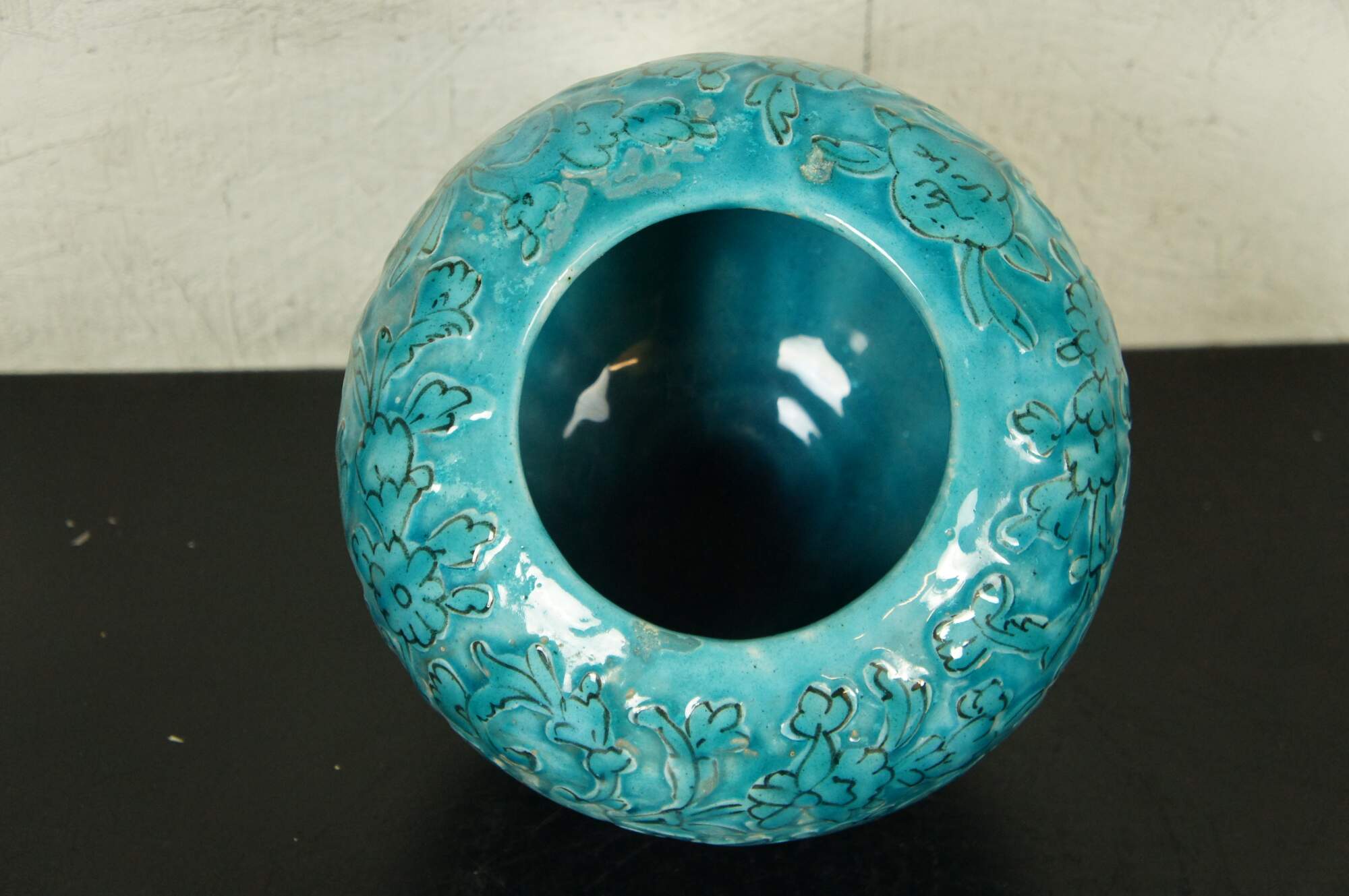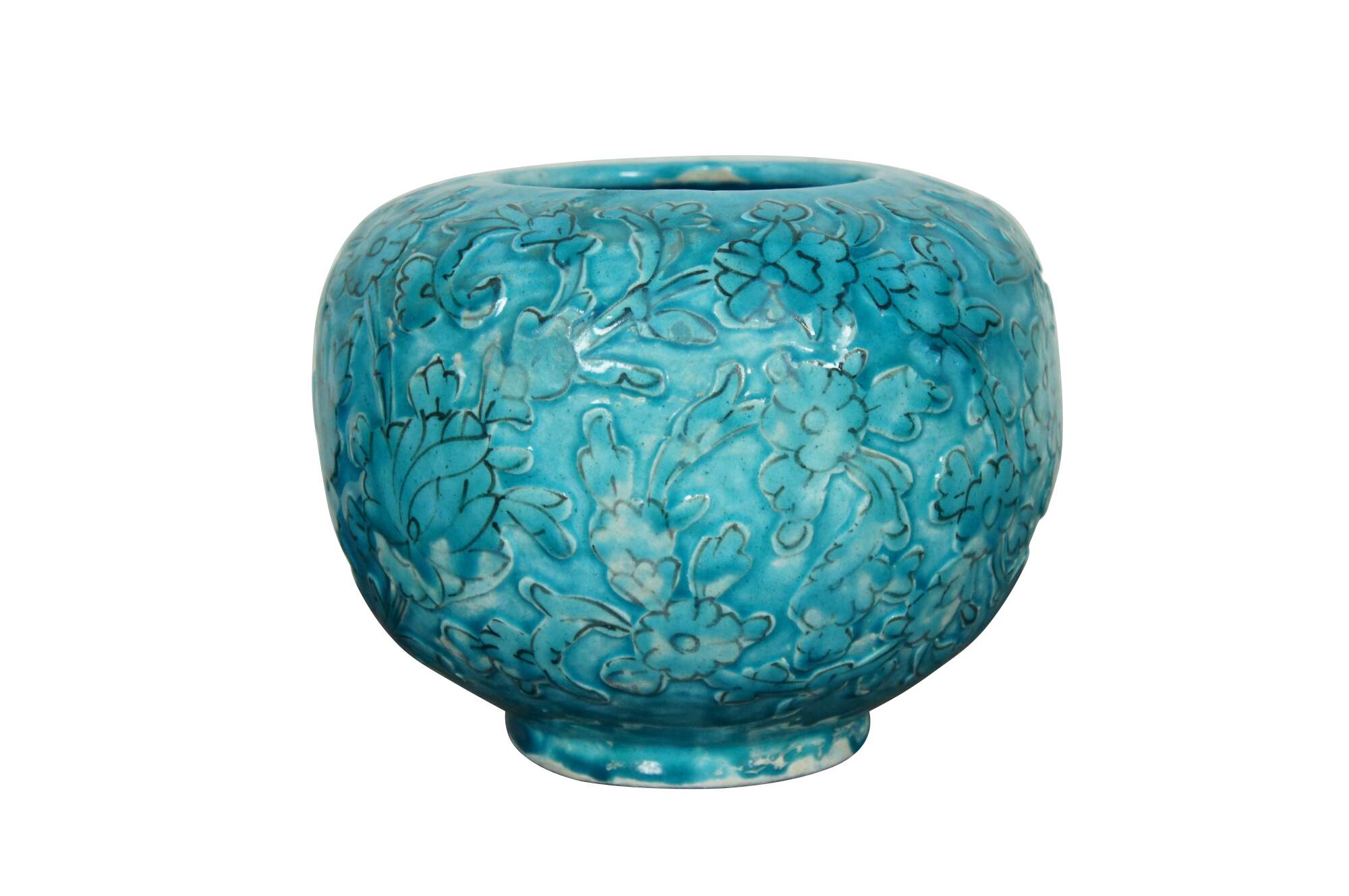 20th century ceramic glazed vase / pot. Persian styling with round form with flatened top and footed base, featuring a design of leaves and flowers in low relief, finished with a deep robin's egg blue / turquoise glaze.