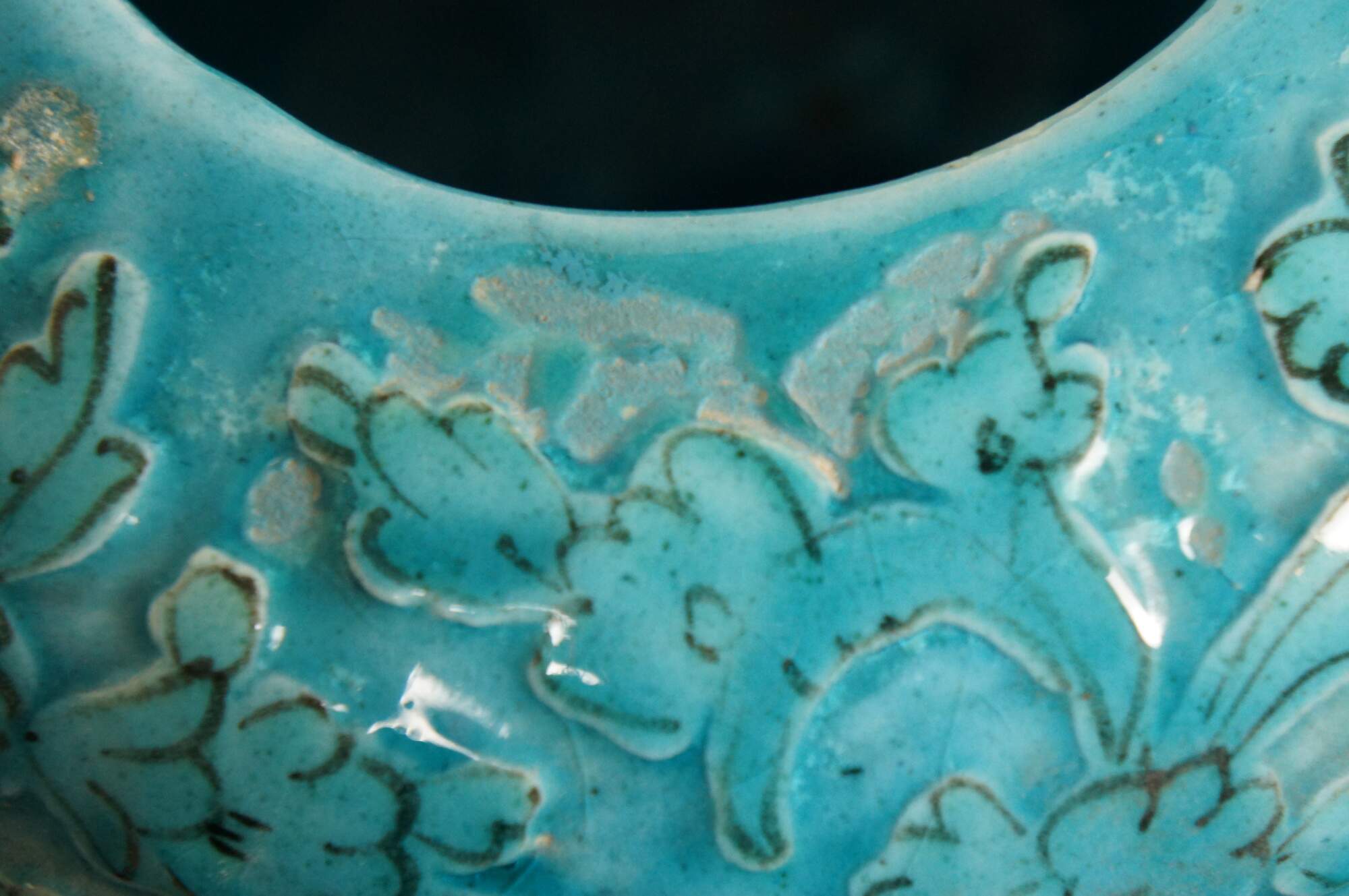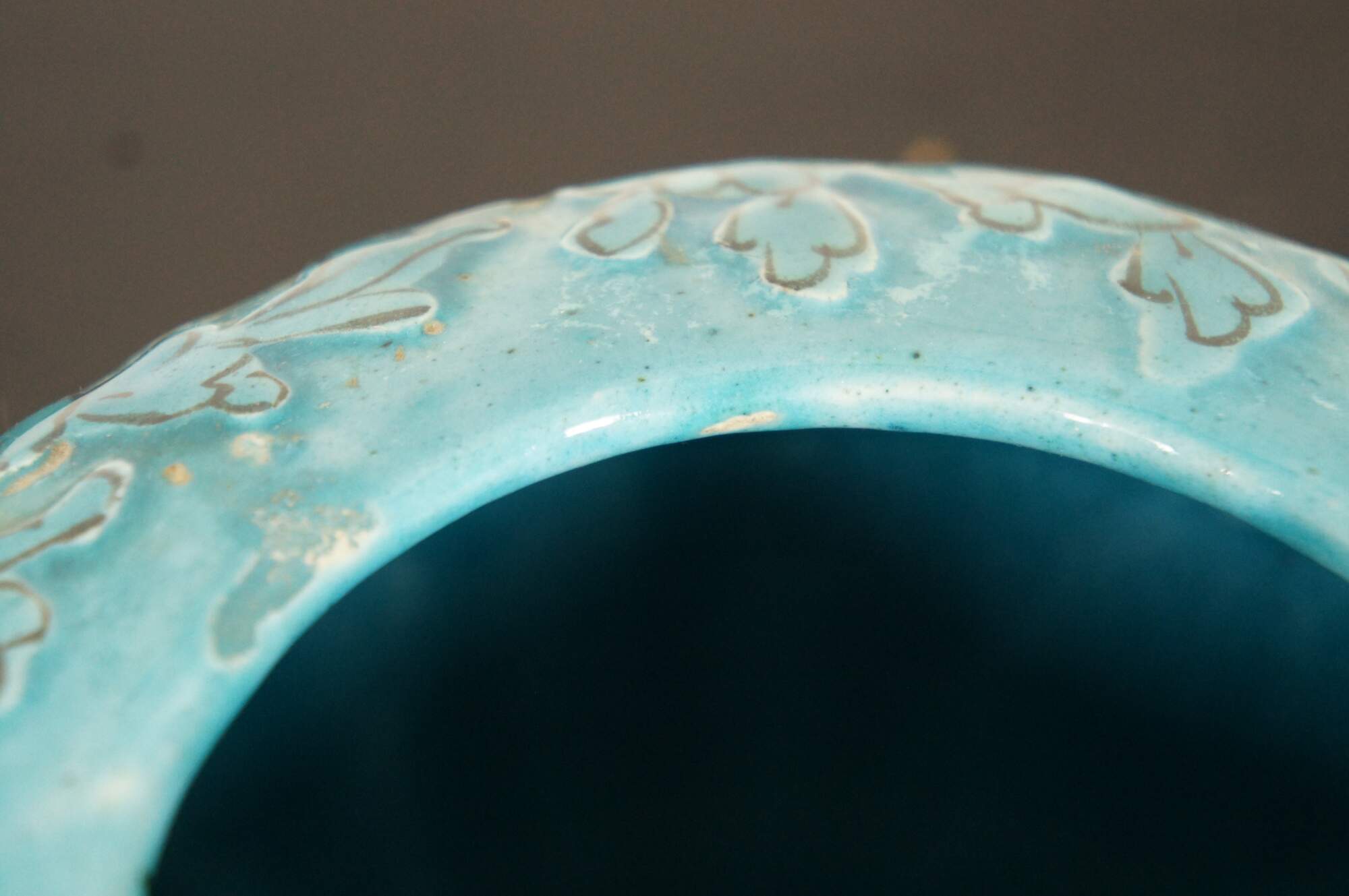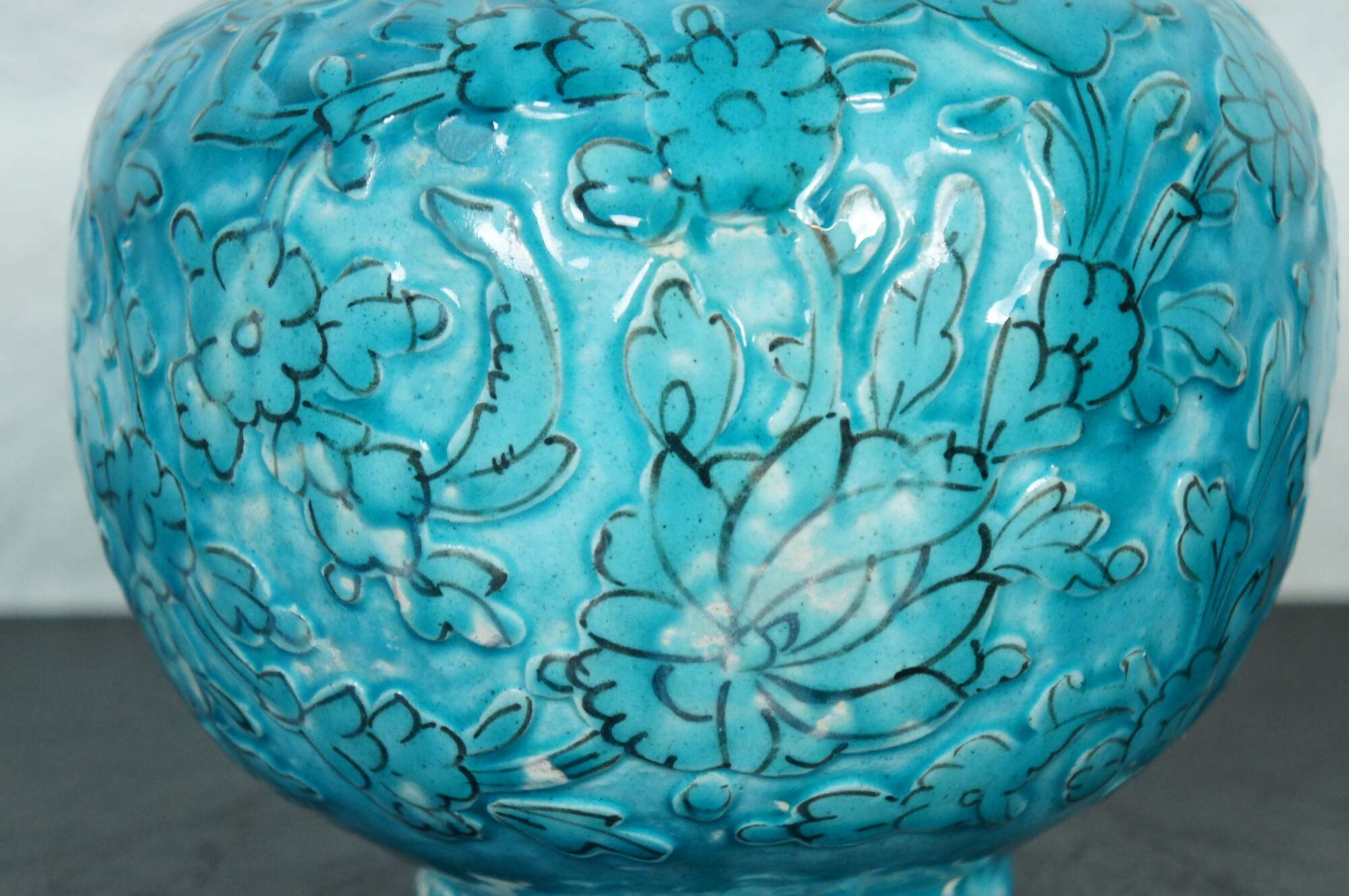 20th century ceramic glazed vase / pot. Persian styling with round form with flatened top and footed base, featuring a design of leaves and flowers in low relief, finished with a deep robin's egg blue / turquoise glaze.