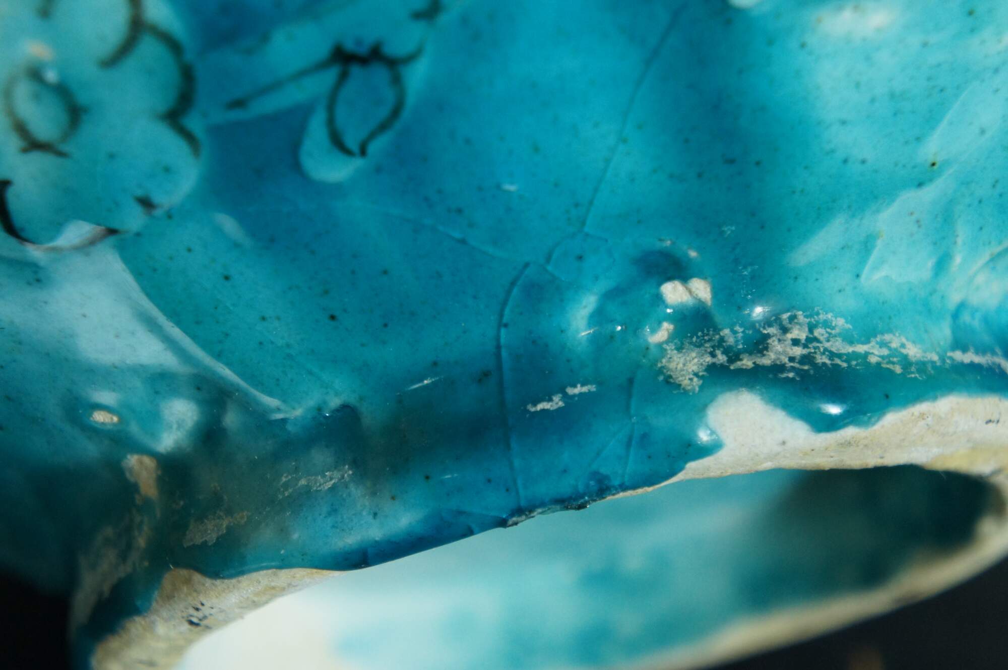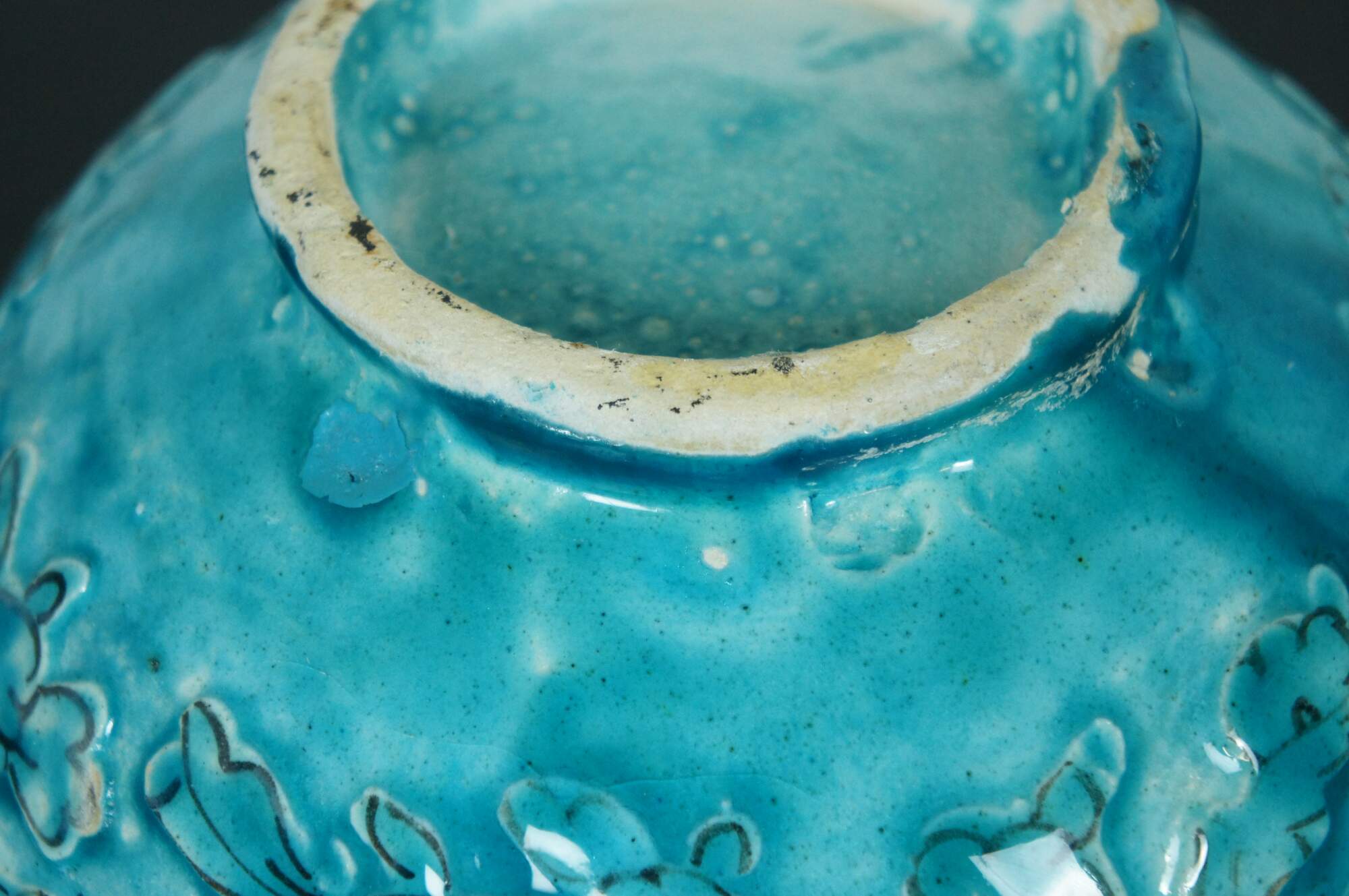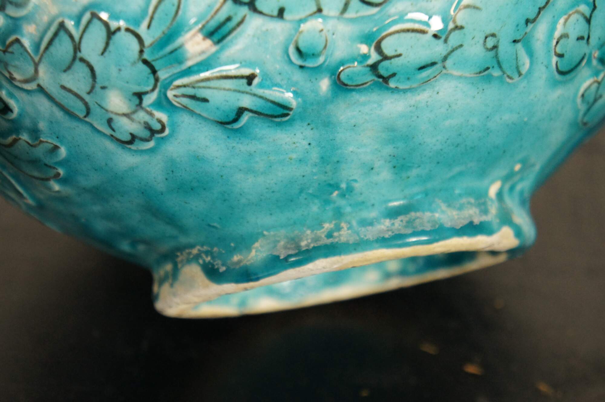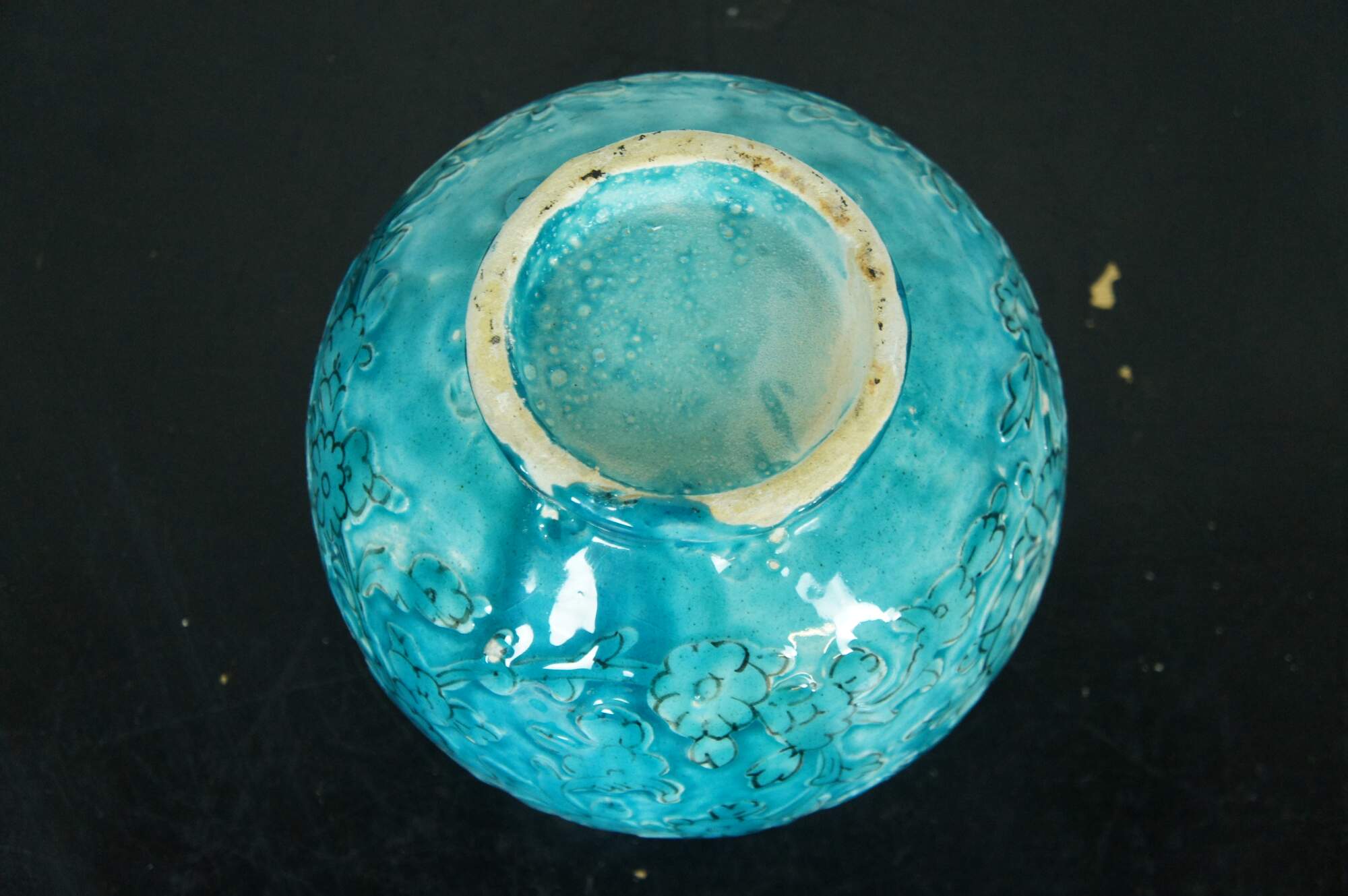20th century ceramic glazed vase / pot. Persian styling with round form with flatened top and footed base, featuring a design of leaves and flowers in low relief, finished with a deep robin's egg blue / turquoise glaze.
