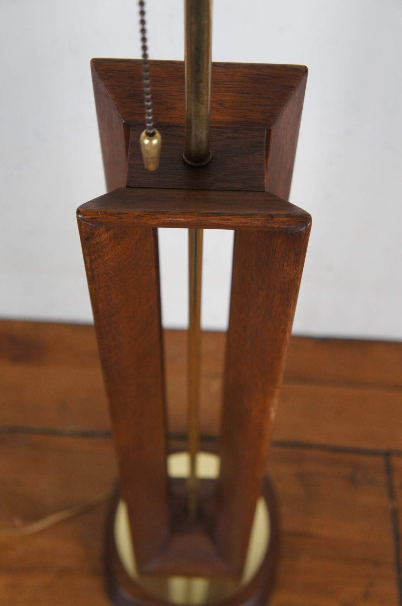Mid 20th century Modeline Lamp Co modern walnut and brass table lamp featuring Scandinavian / Danish design with a cut out, beveled rectangular prism on a round base. Includes harp and finial.