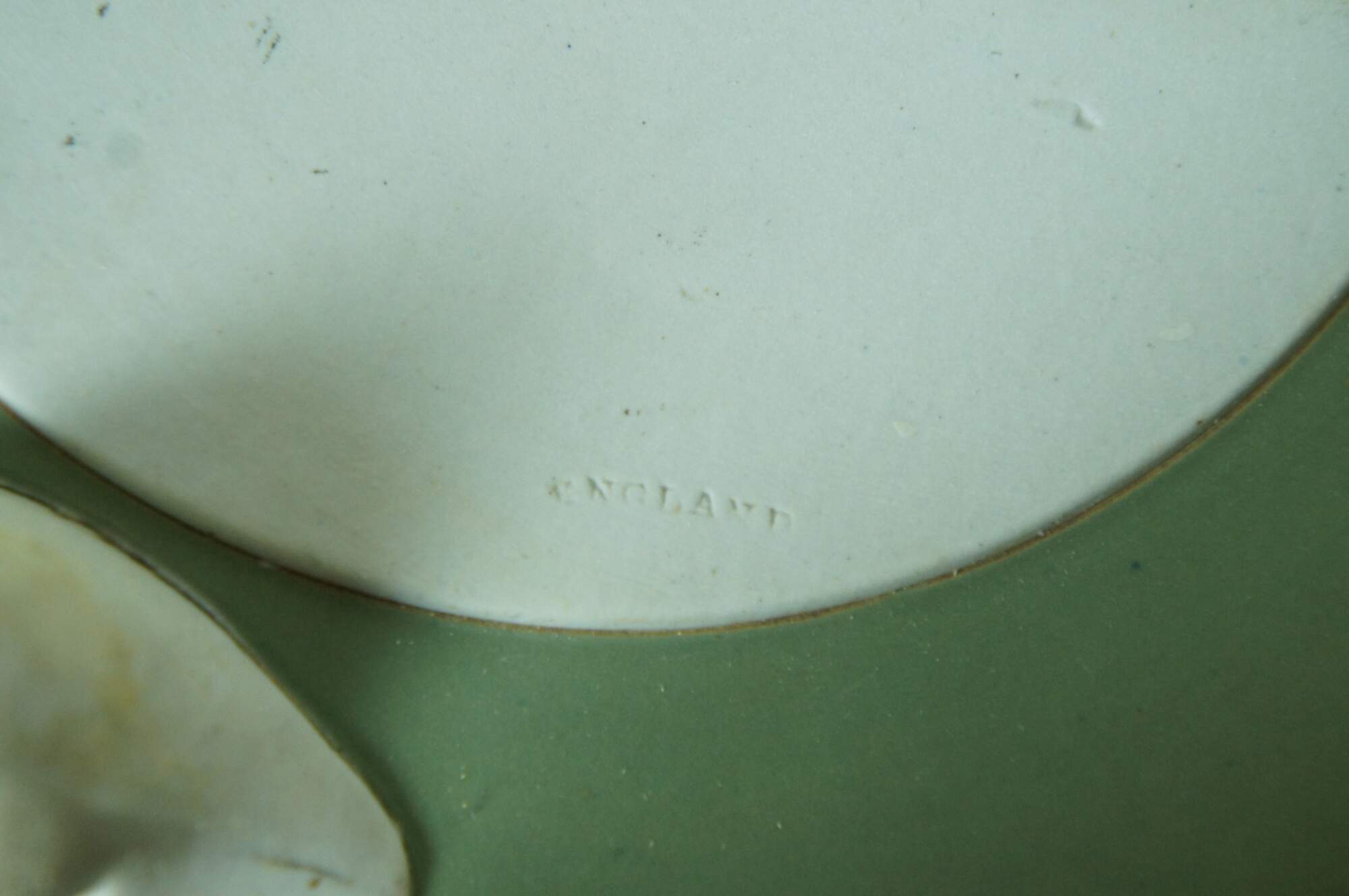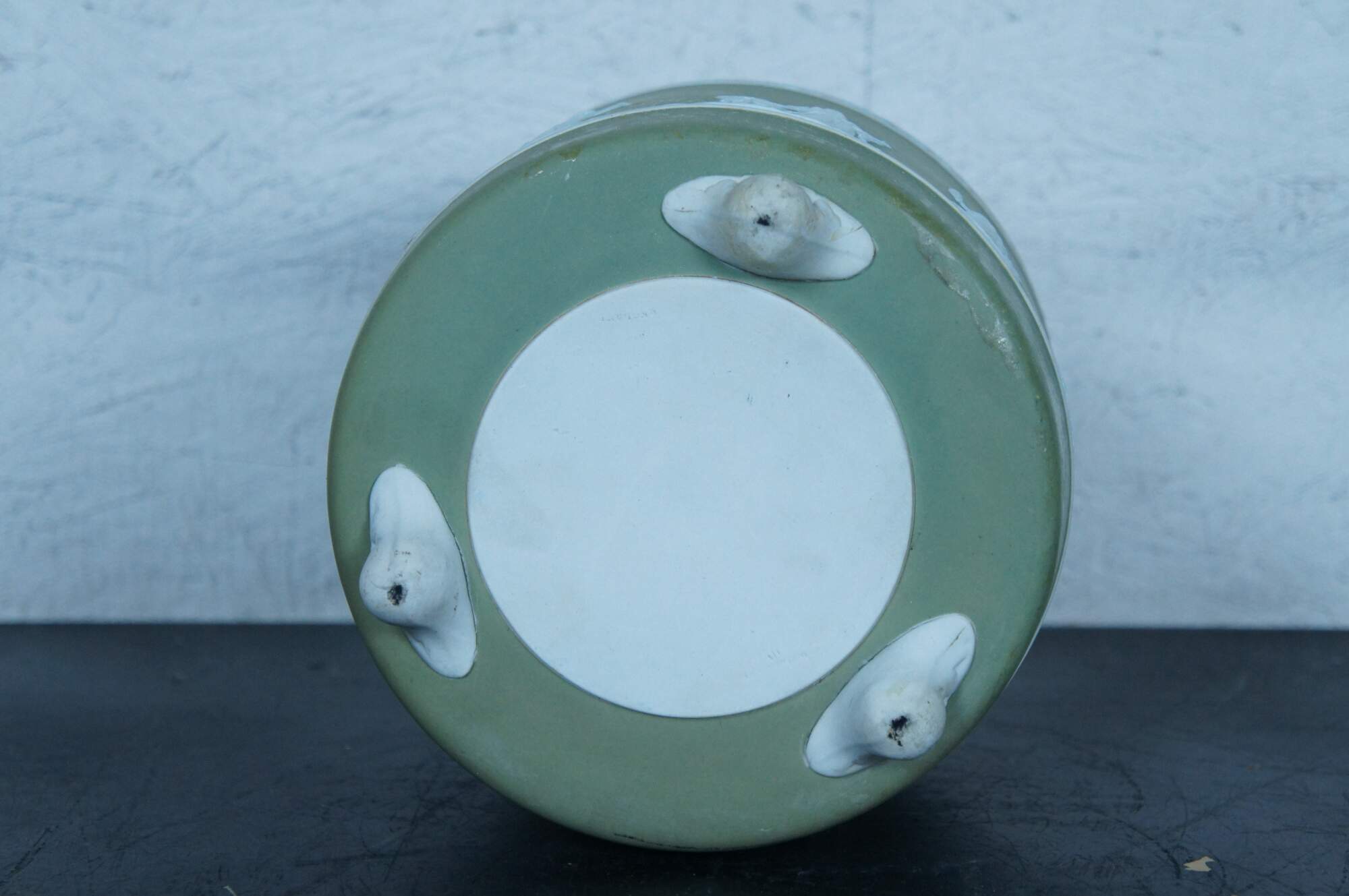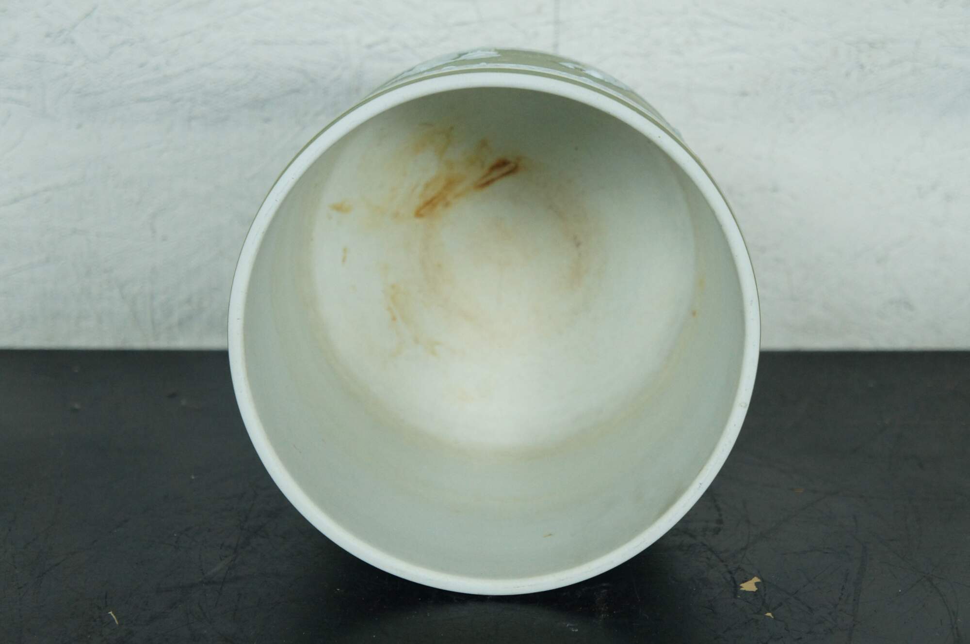 Rare antique Wedgwood England jasperware planter / cachpot / jardiniere. White on green jasperware featuring Wedgwood's traditional neoclassical array of figures and trees below a band morning glories. Cylindrical form with ball feet. Marked 1/1 on base.