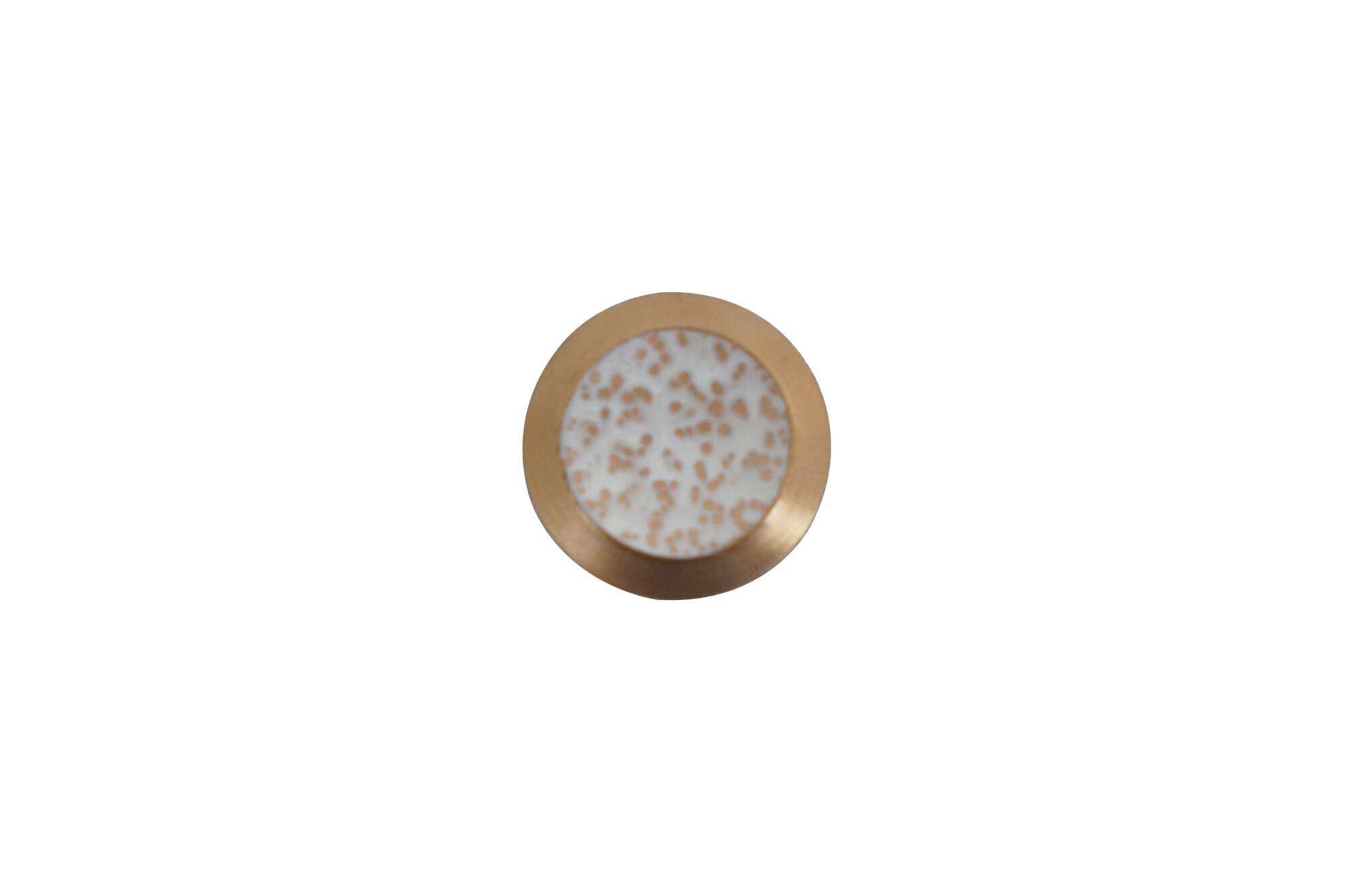 40 Available - Mid to late 20th century old-stock die cast drawer / cabinet pulls. National Lock Company - Medalist, item number C696-10CW Knob, Dull Bronze - White Accent. Mid Century Modern styling. Round shape with beveld outer edge and concave surface, decorated with mottled white enamel.