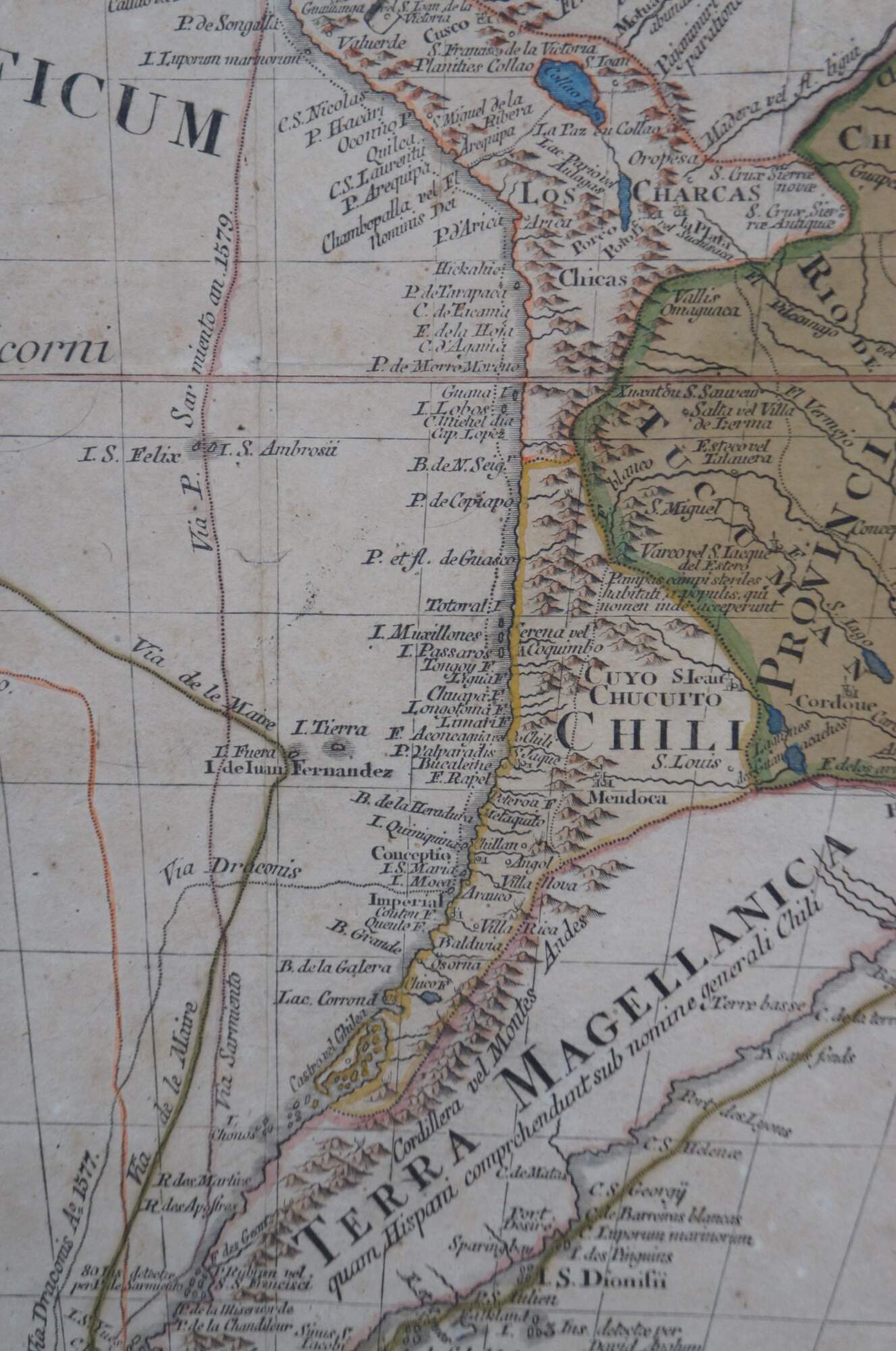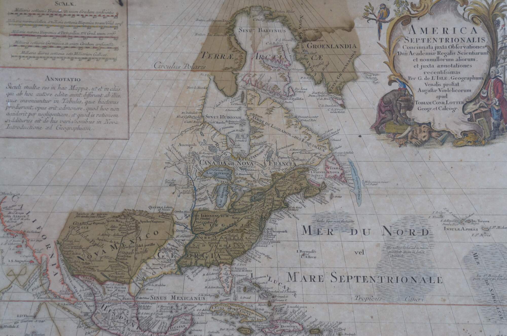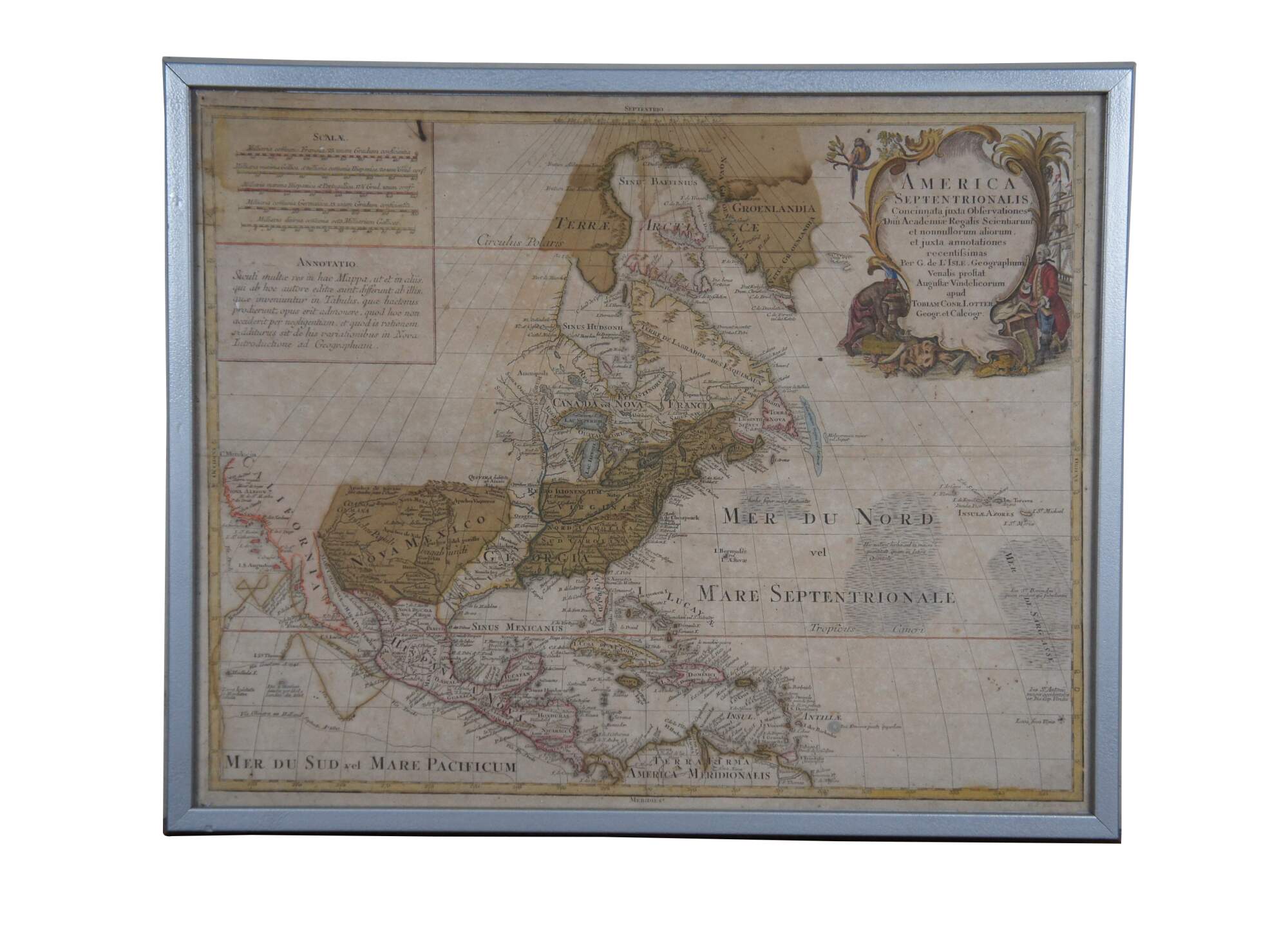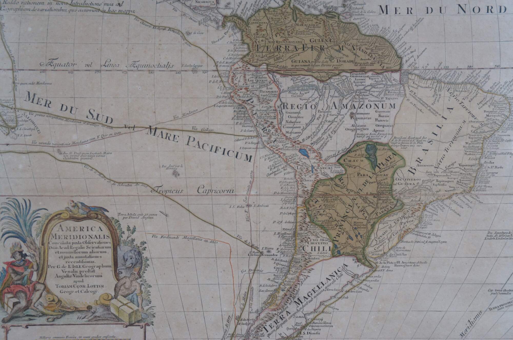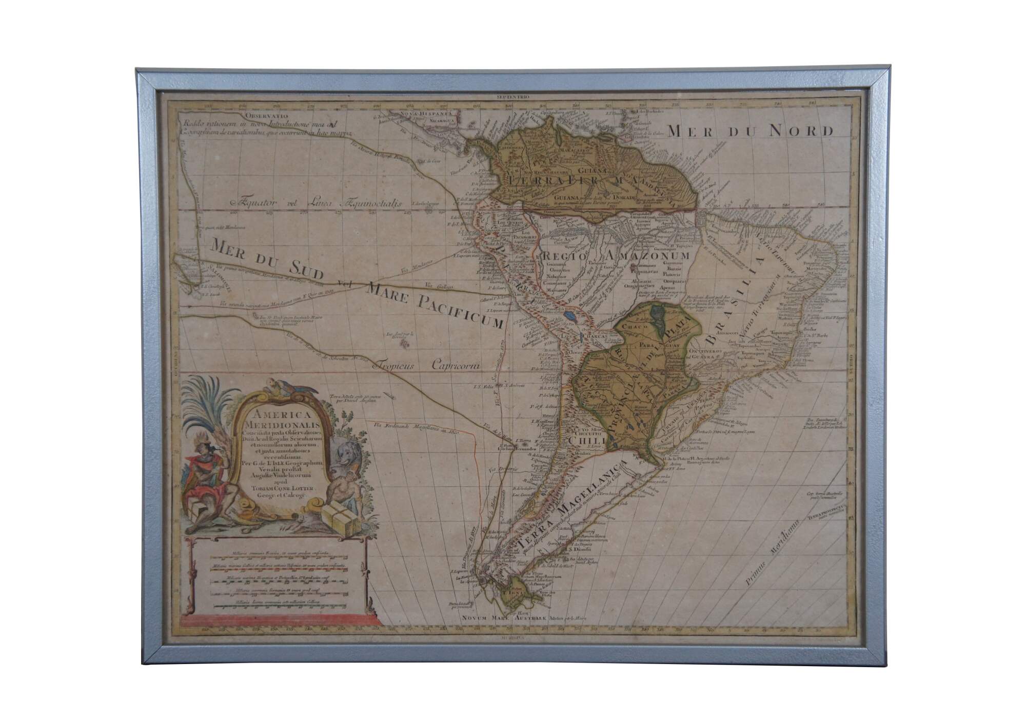 Pair of rare hand colored maps from the 1770's, depicting "America Septentrionalis" (North America), engraved by Georg Friedrich Lotter and "America Meridionalis" (South America), engraved by Gustav Conrad Lotter. Silver painted wood frame.