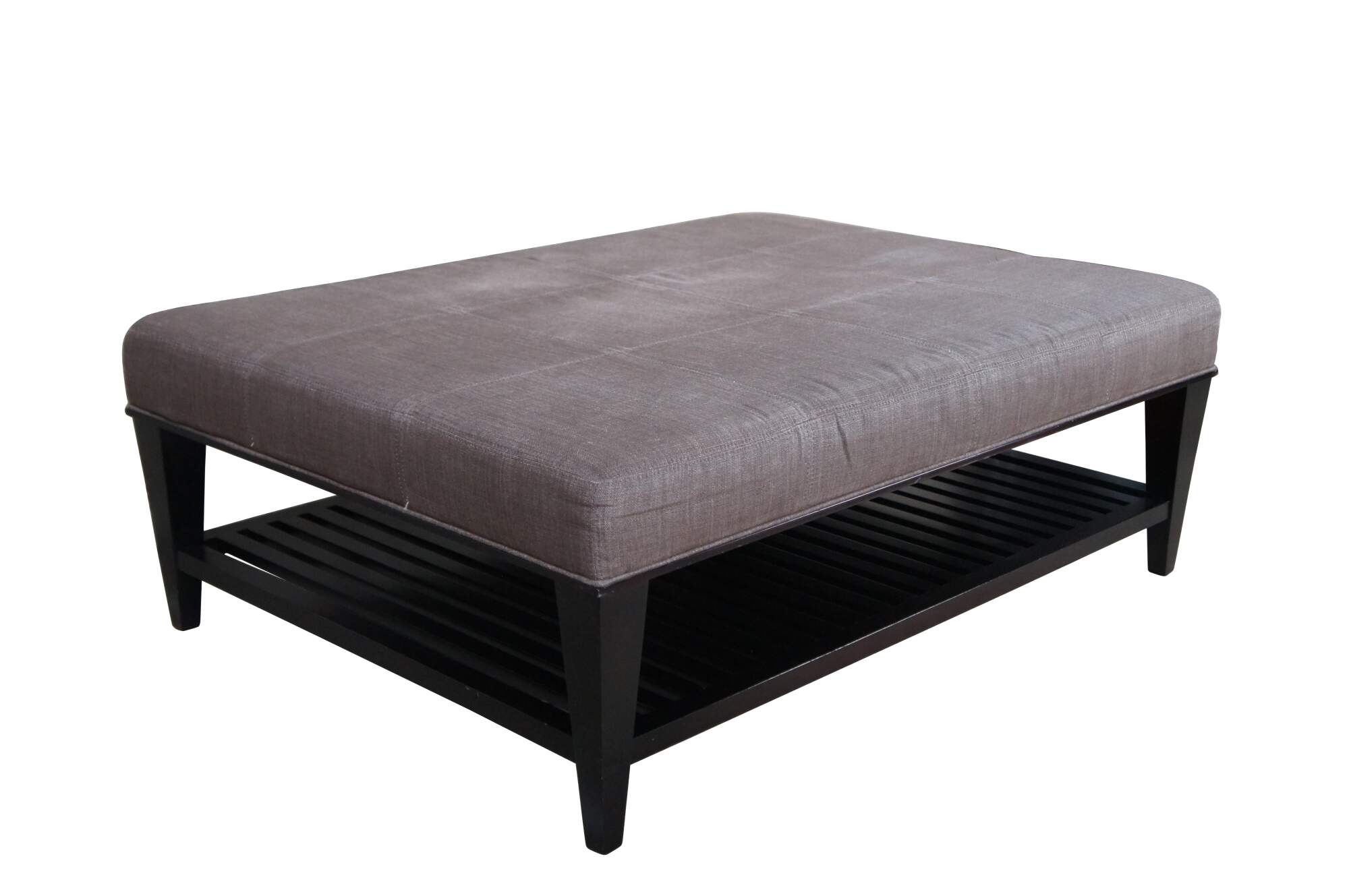 Vintage cocktail ottoman / stool / foot rest designed by Barbara Barry for Baker Furniture. Features a modern design with tapered legs and a slatted tiered lower shelf.