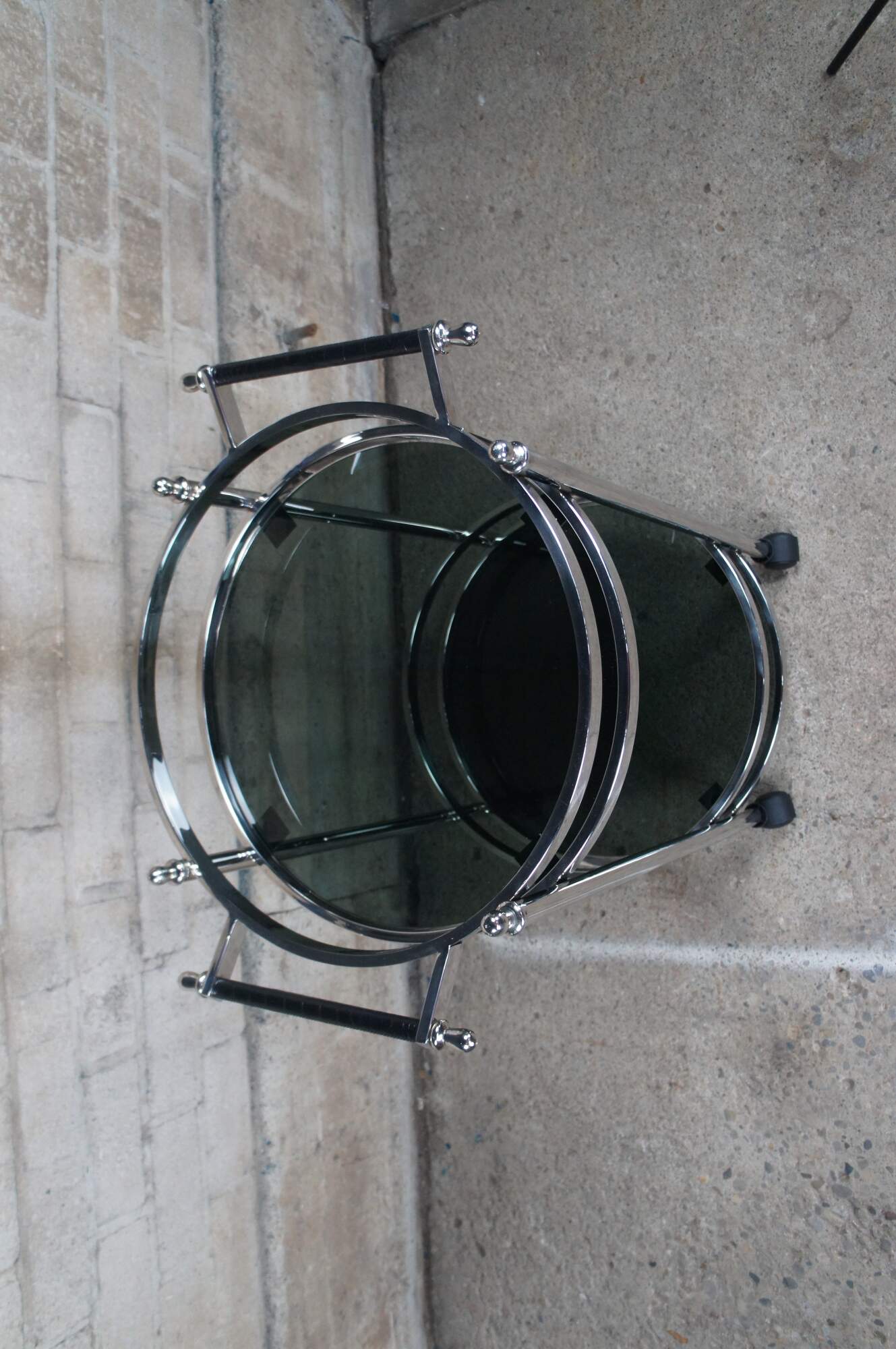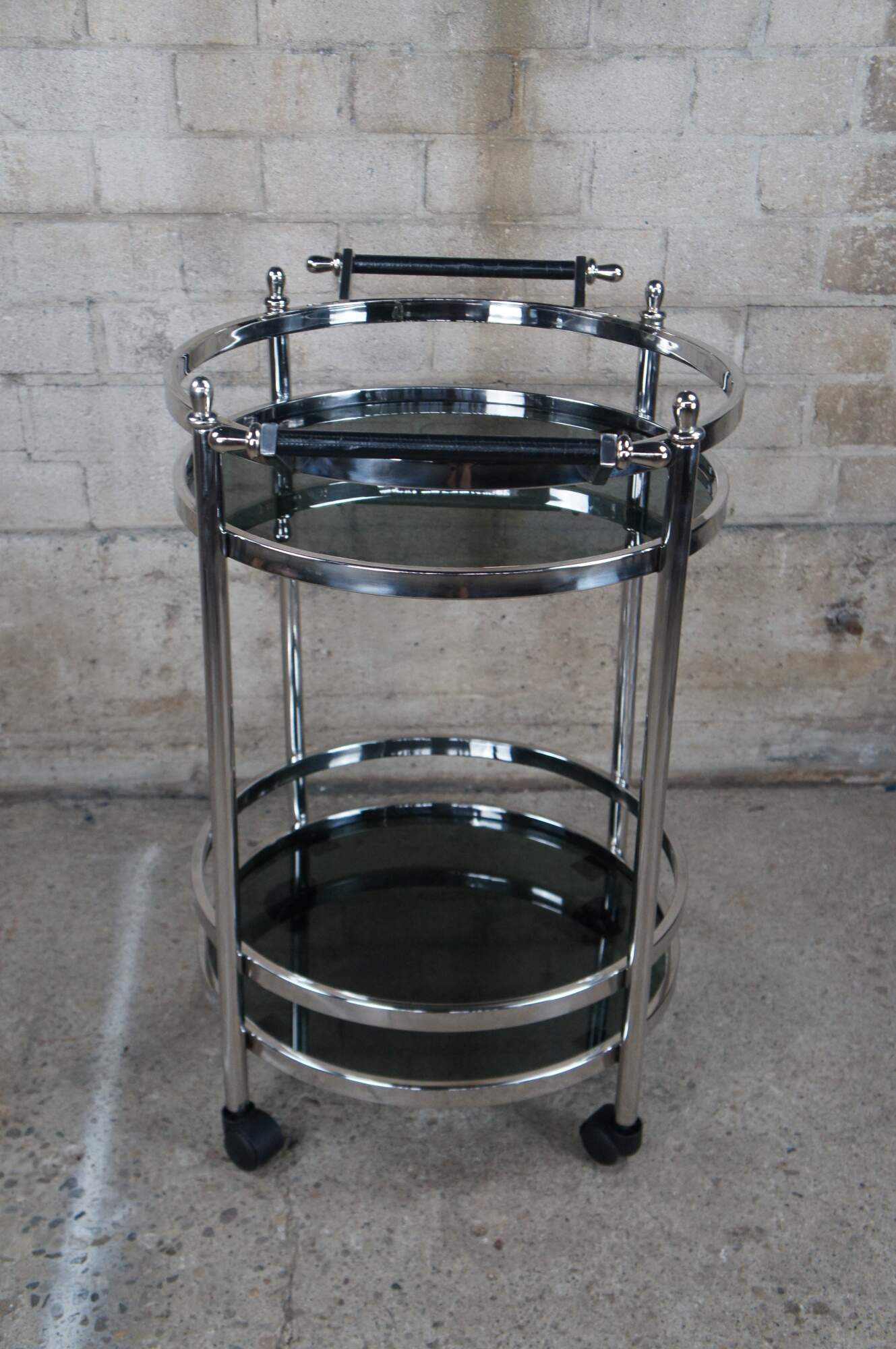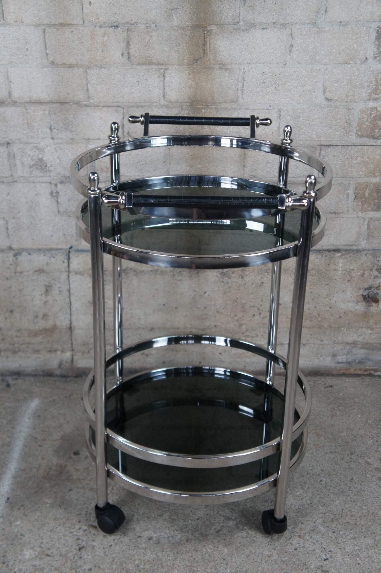 Casa Padrino Designer luxury bar trolley. Made from nickel plated Stainless steel and smoked glass. Features a round form in Art Deco / Post Modern manner with two tiers, leather handles and wheels for ease of movement.