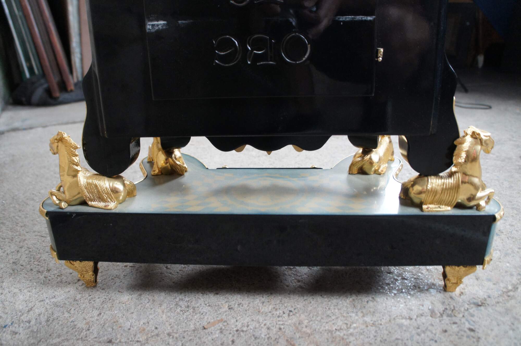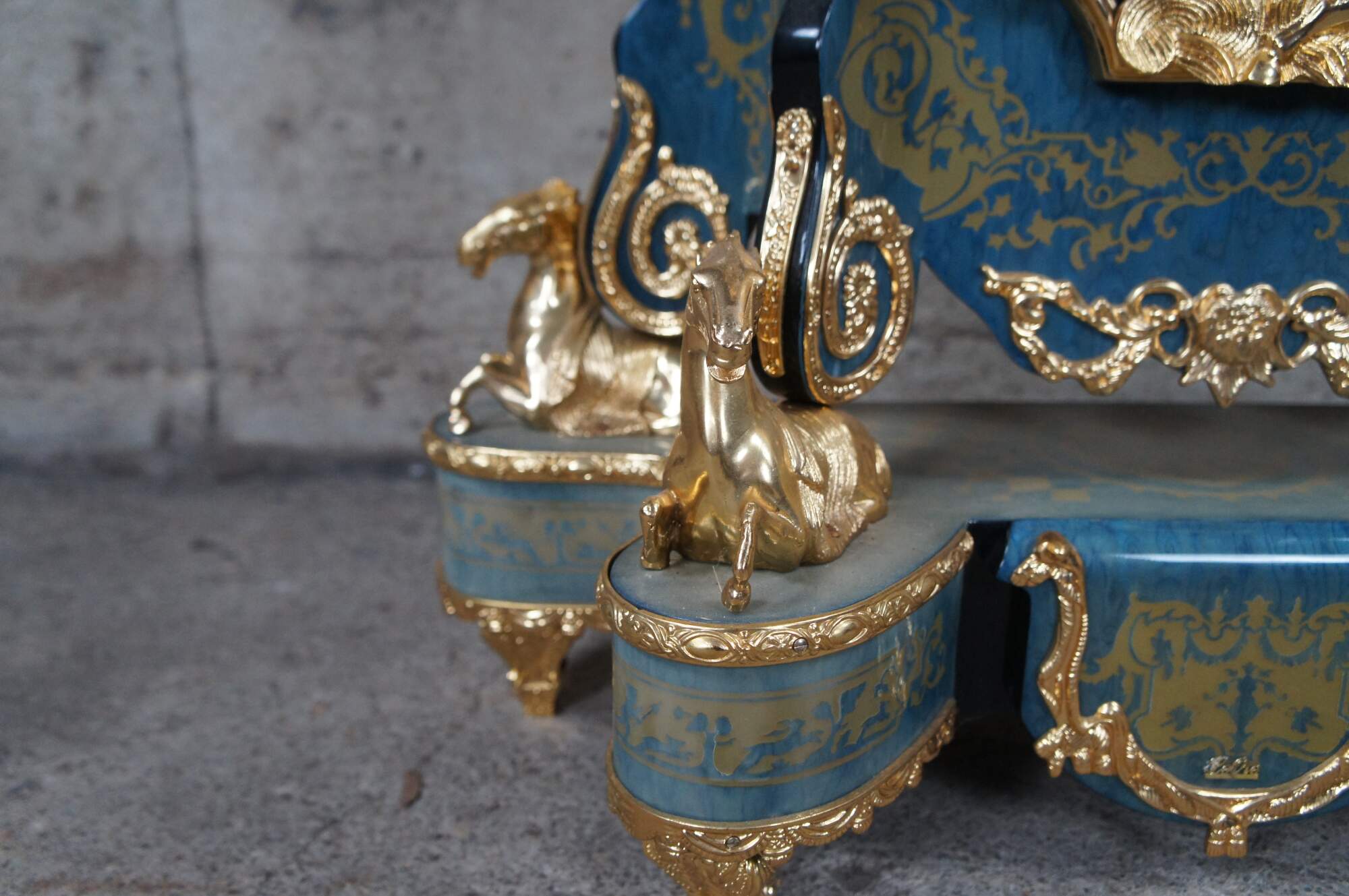 Stunning Italian Boulle style mantel clock by Le Ore New Art International. Le Ore is a small Italian family manufacturer that specializes in intricate and colorful wood inlay. Features large mounted sculptures and heavy gold plated cast brass ornamentation, blue mother of pearl inlay and gold marquetry. Includes ebonized accents, caryatids, banding, a key and pendulum. 8 Day Movement made by Franz Hermle in Germany. Circa late 20th Century, after original period examples by Andres Charles Boulle.