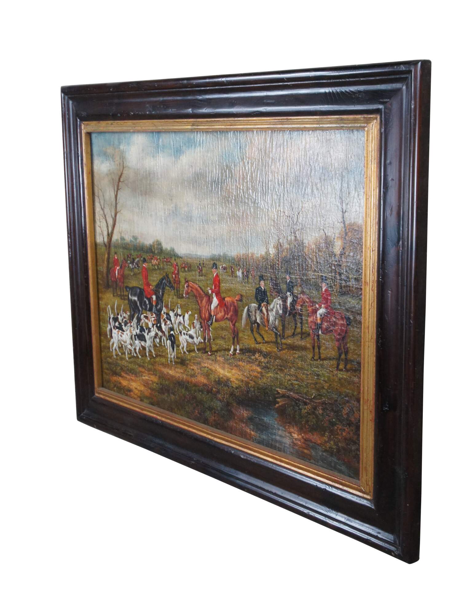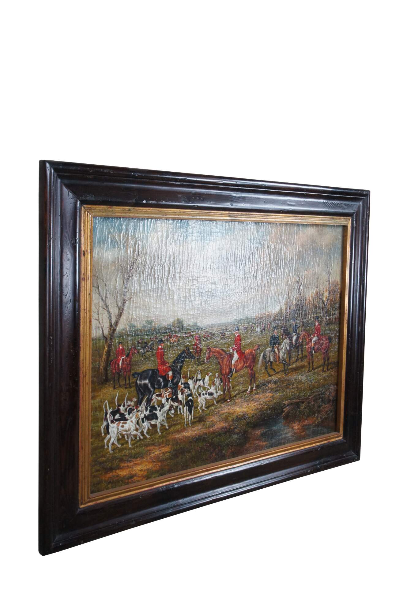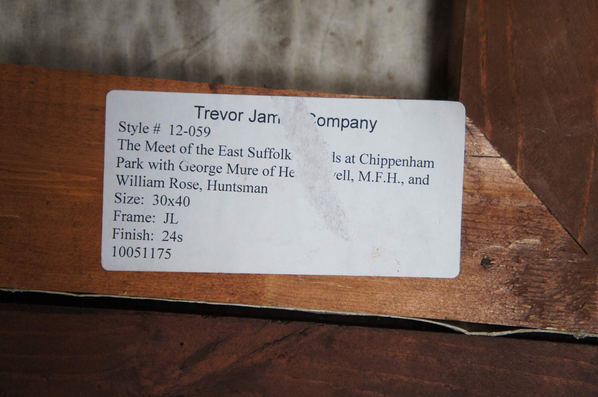 The meet of the East Suffolk hounds at Chippenham Park with George Mure of Herringswell, M.F.H., and William Rose, Huntsman. Painting by Trevor James Company. Framed in a dark oak frame. Canvas naturally aged.