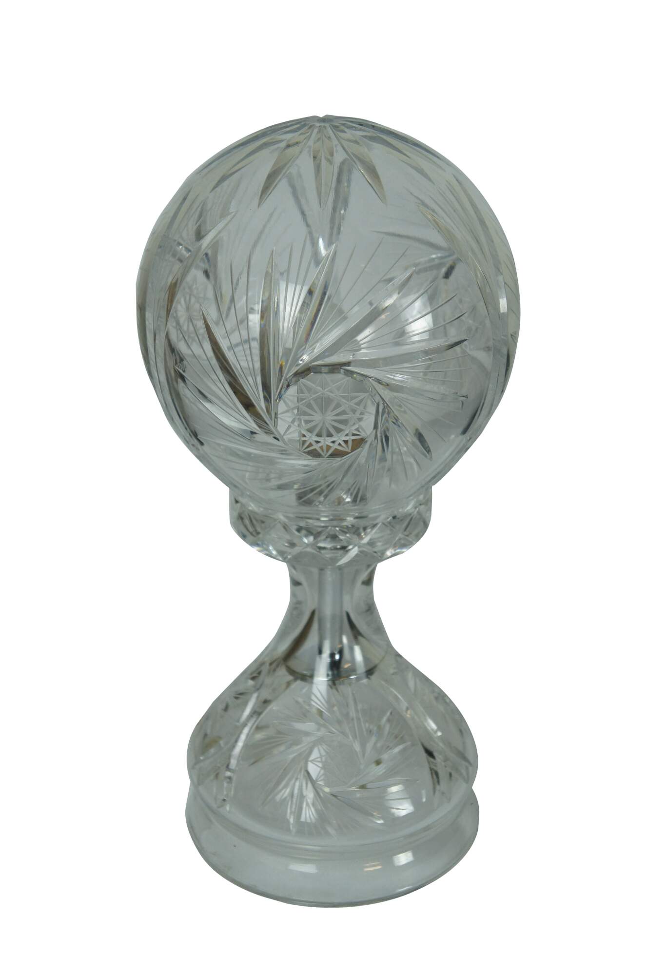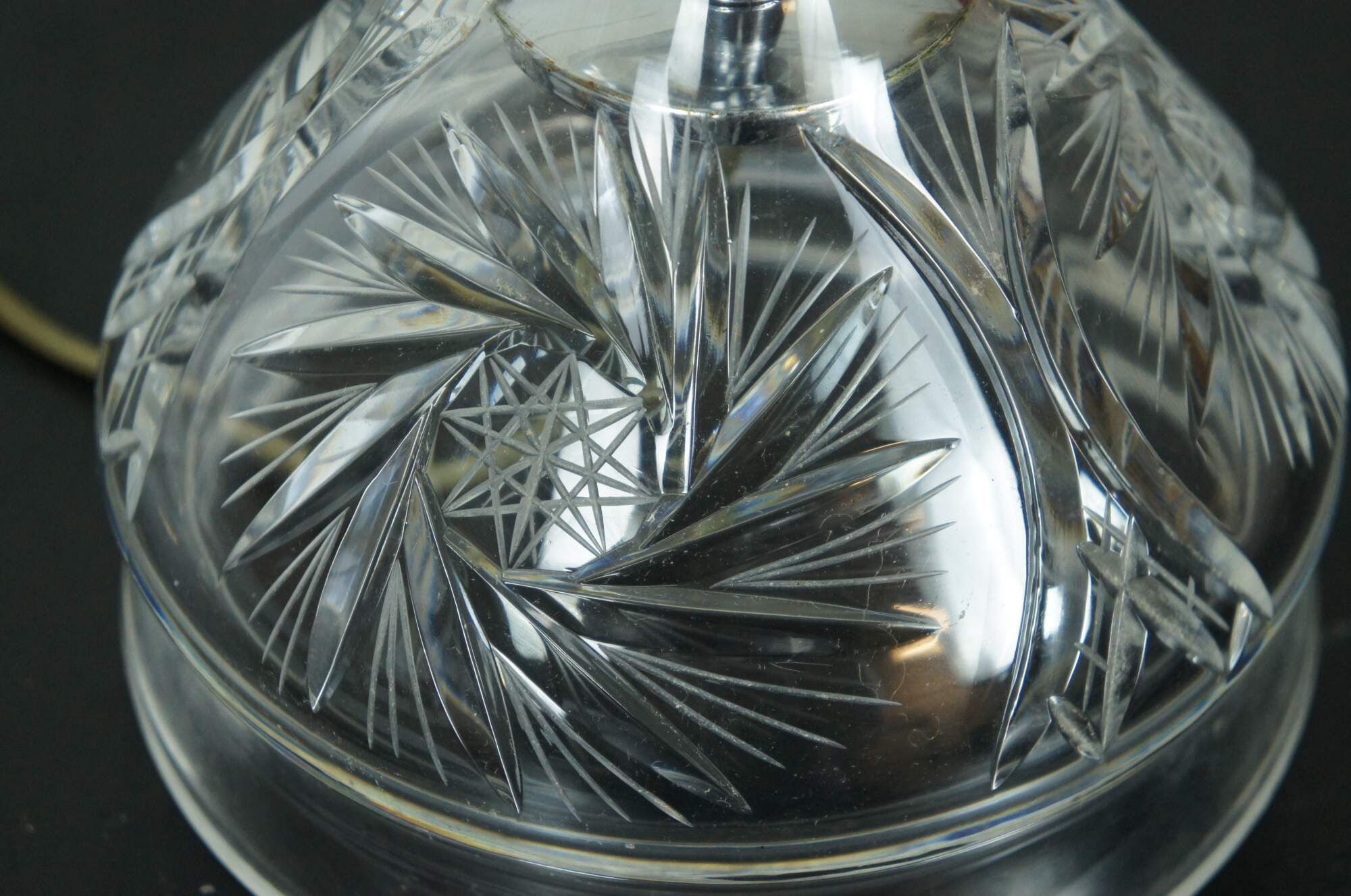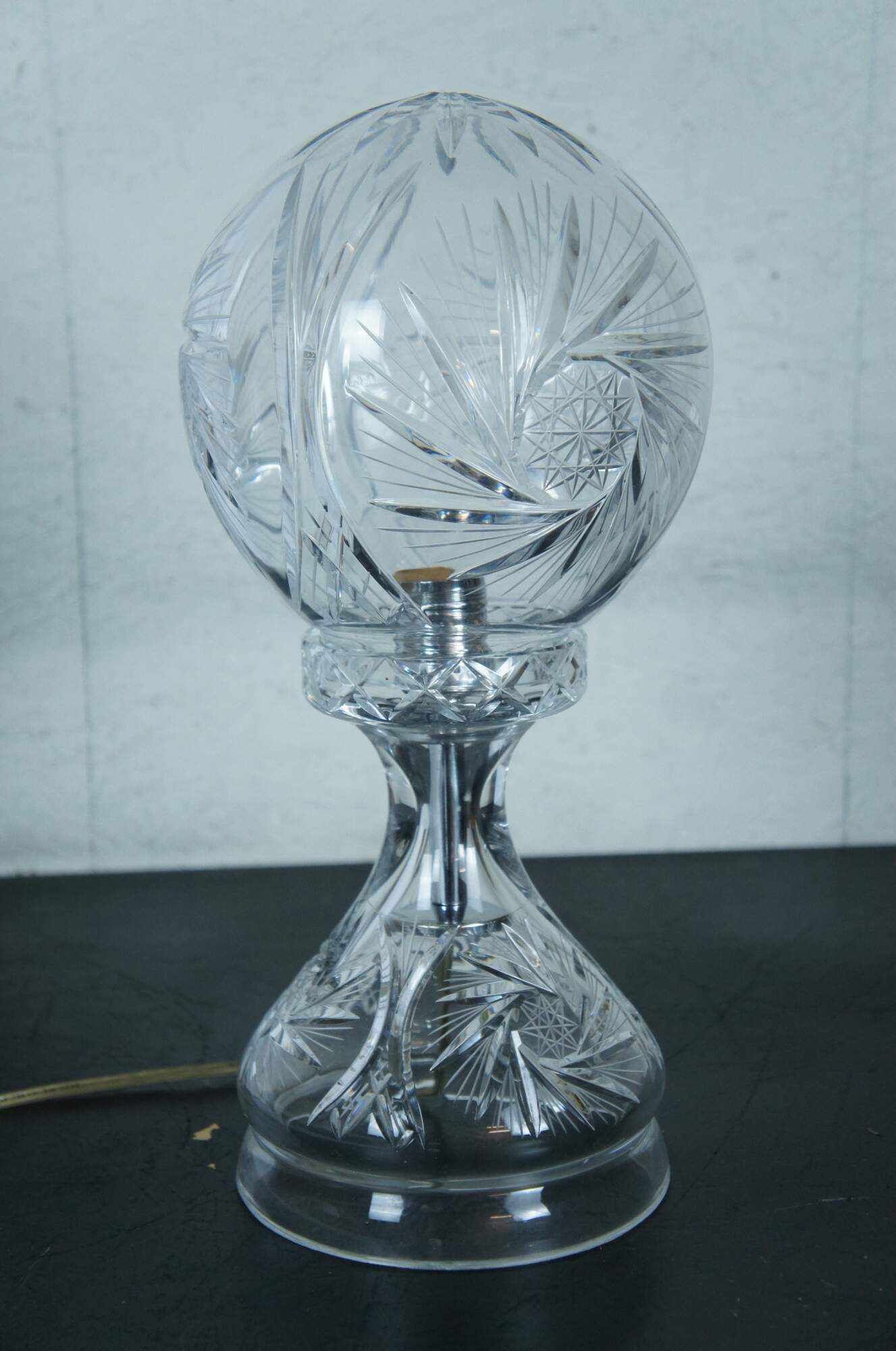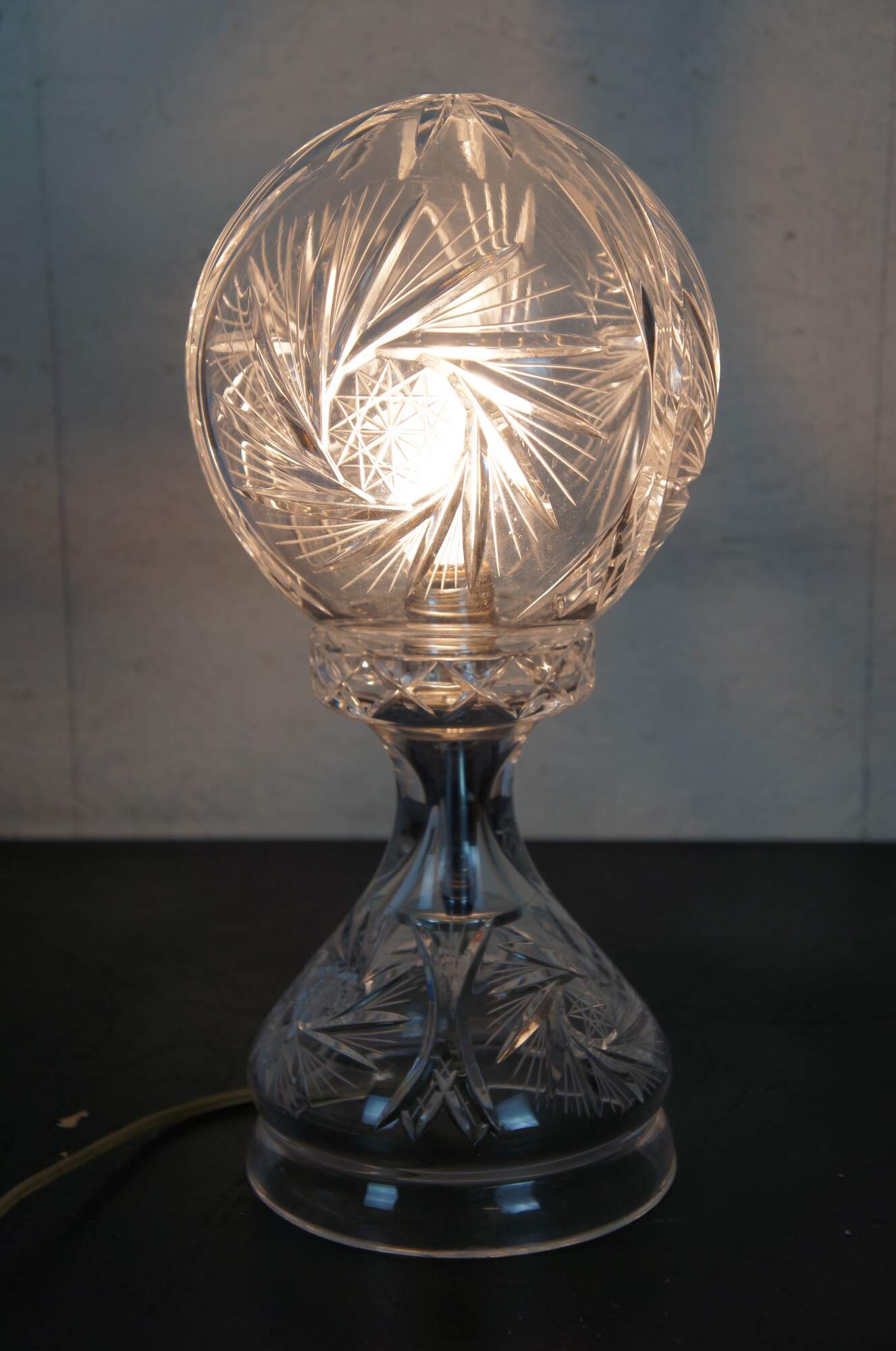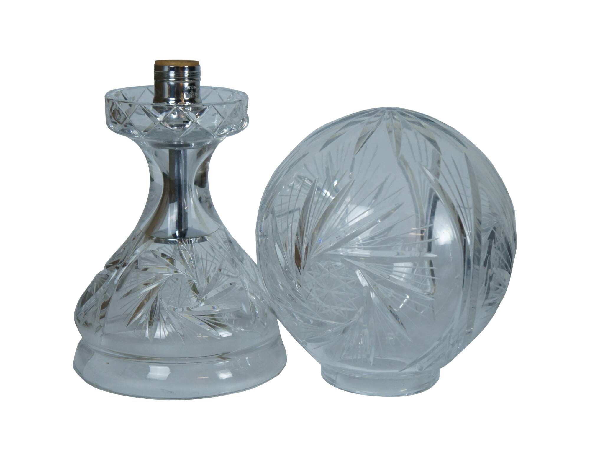 Circa mid 20th century cut crystal table / vanity / boudoire lamp featuring a round base with tapered neck, supporting a clear globe shade, cut with a pinwheel design around a many pointed star.