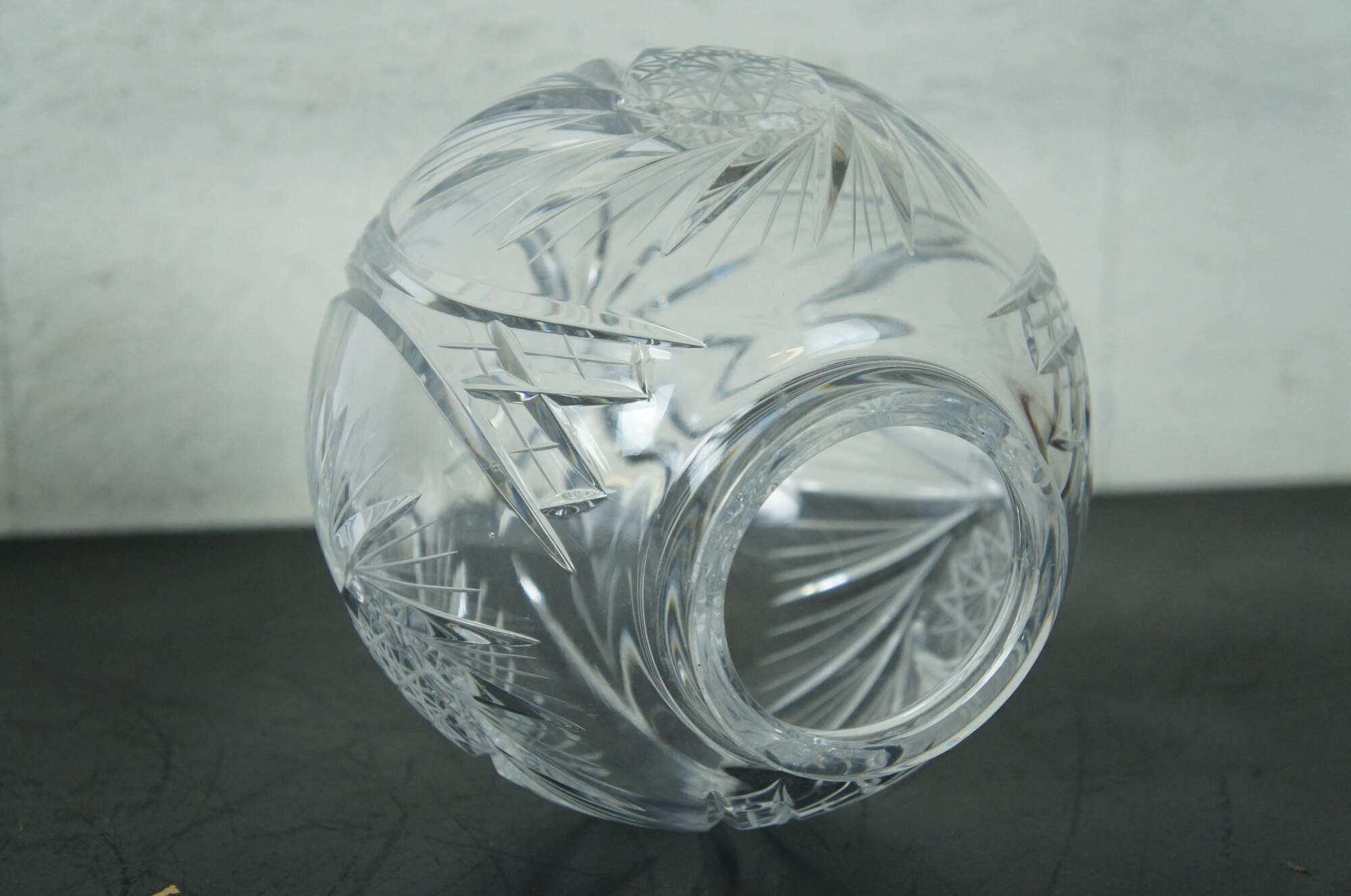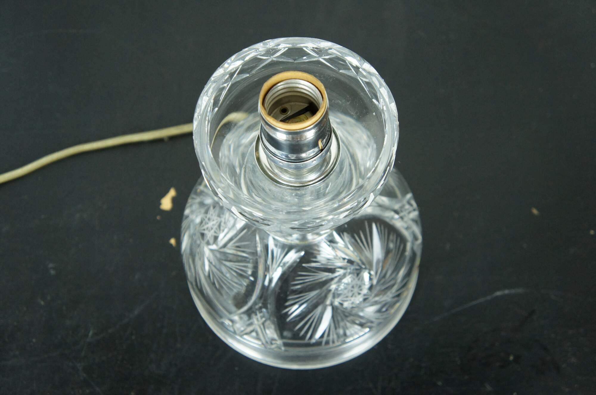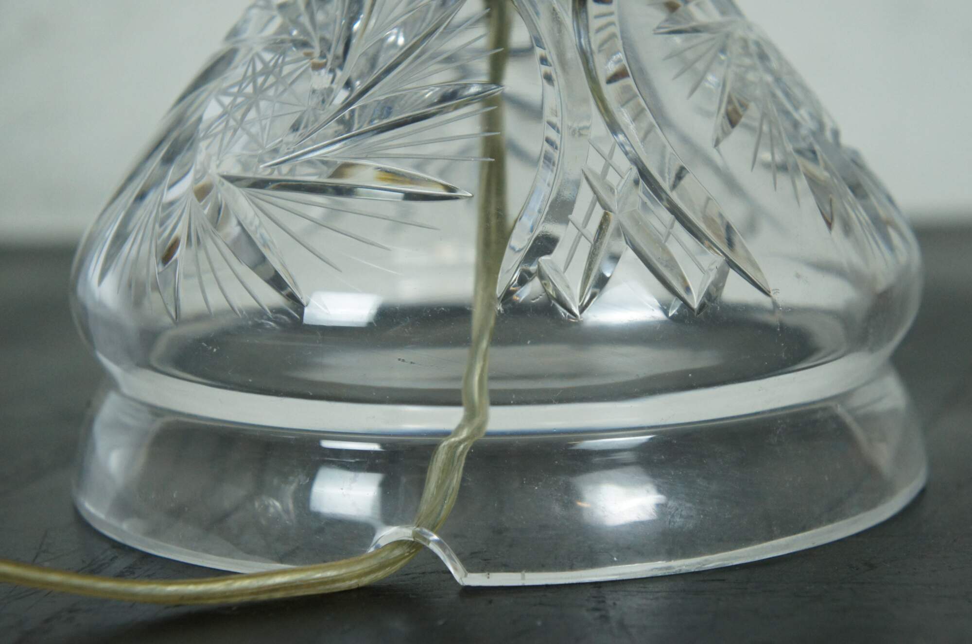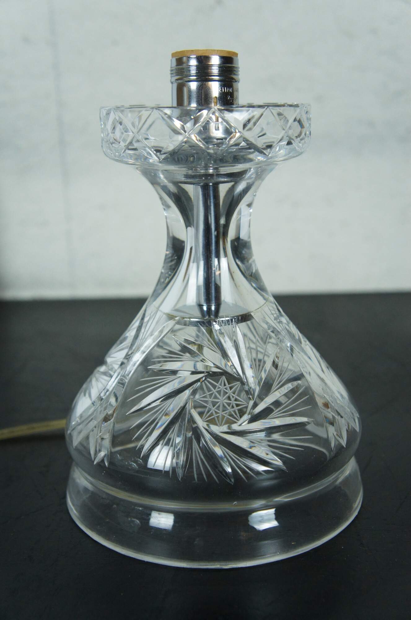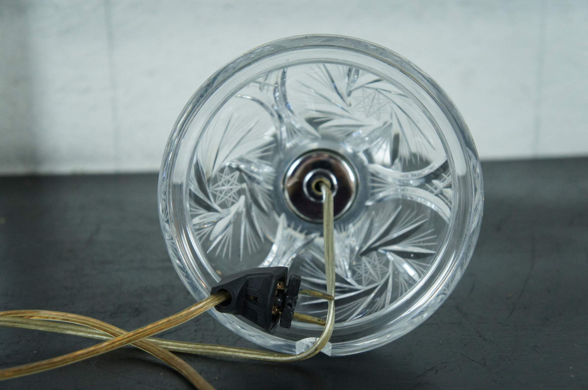 Circa mid 20th century cut crystal table / vanity / boudoire lamp featuring a round base with tapered neck, supporting a clear globe shade, cut with a pinwheel design around a many pointed star.
