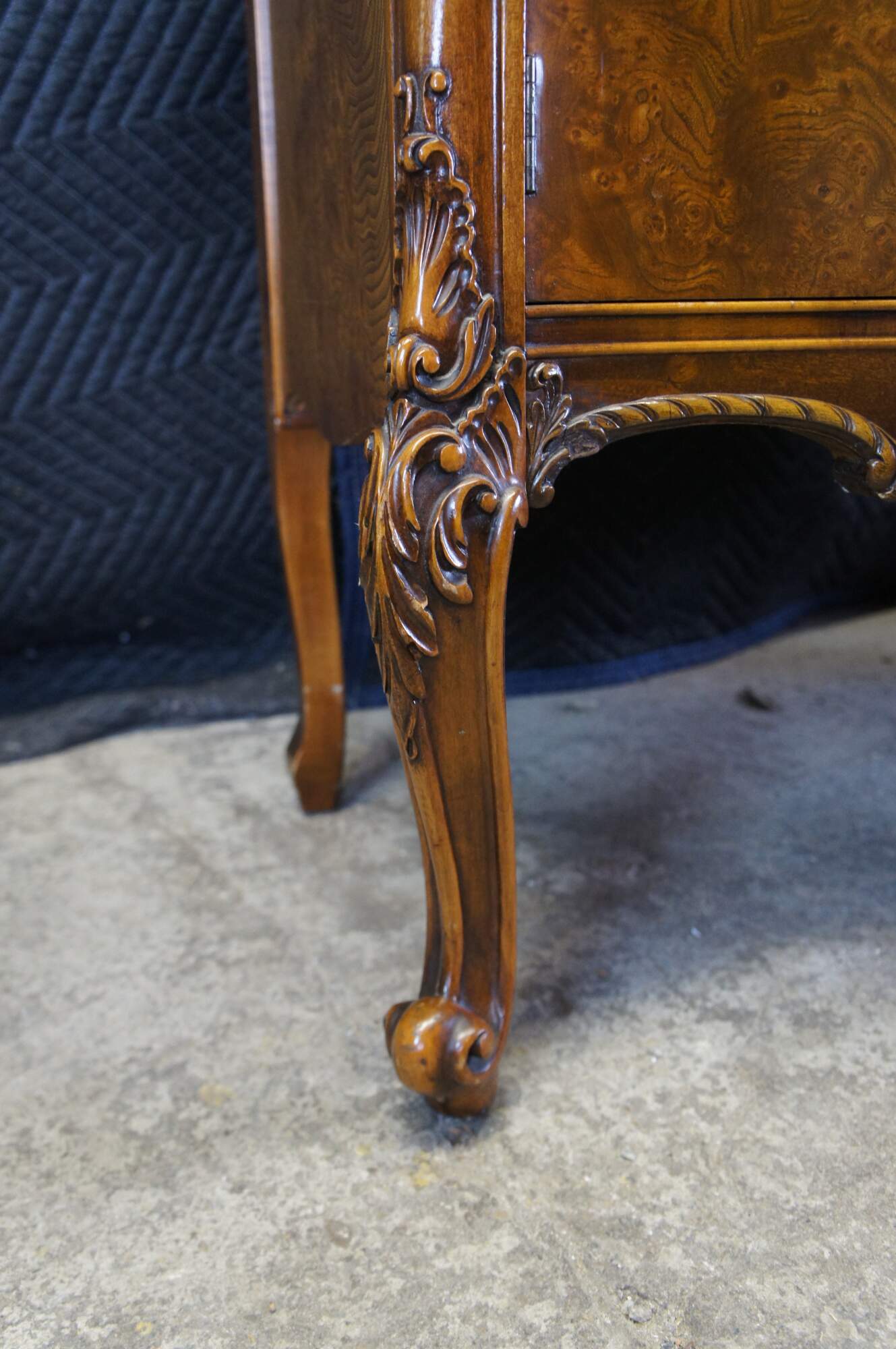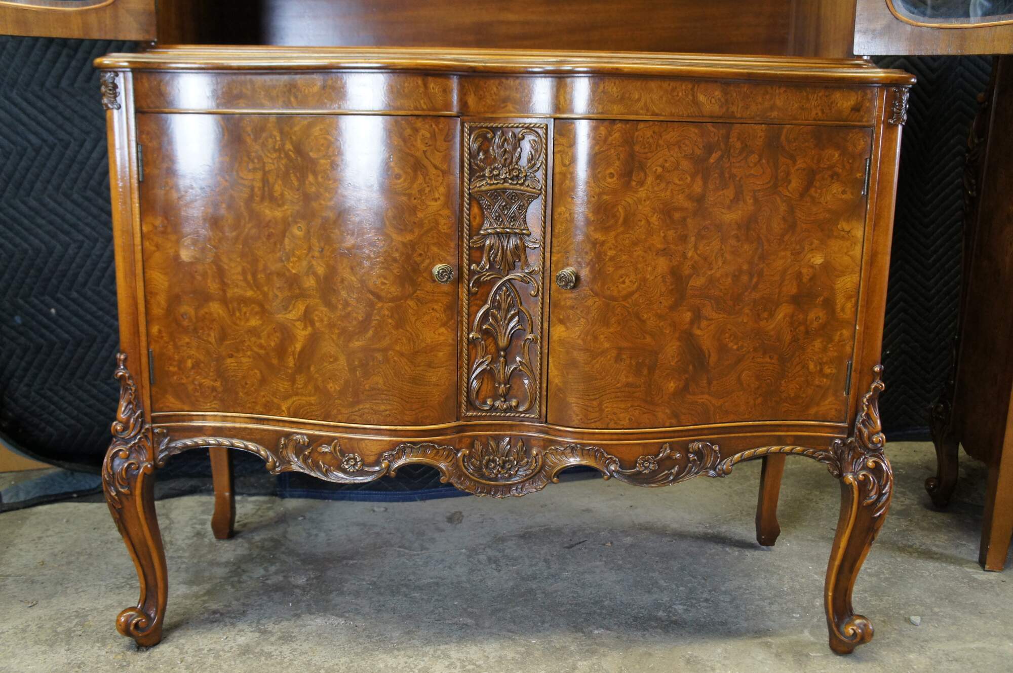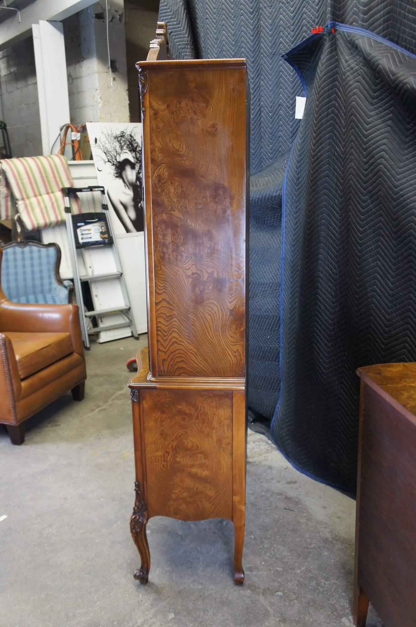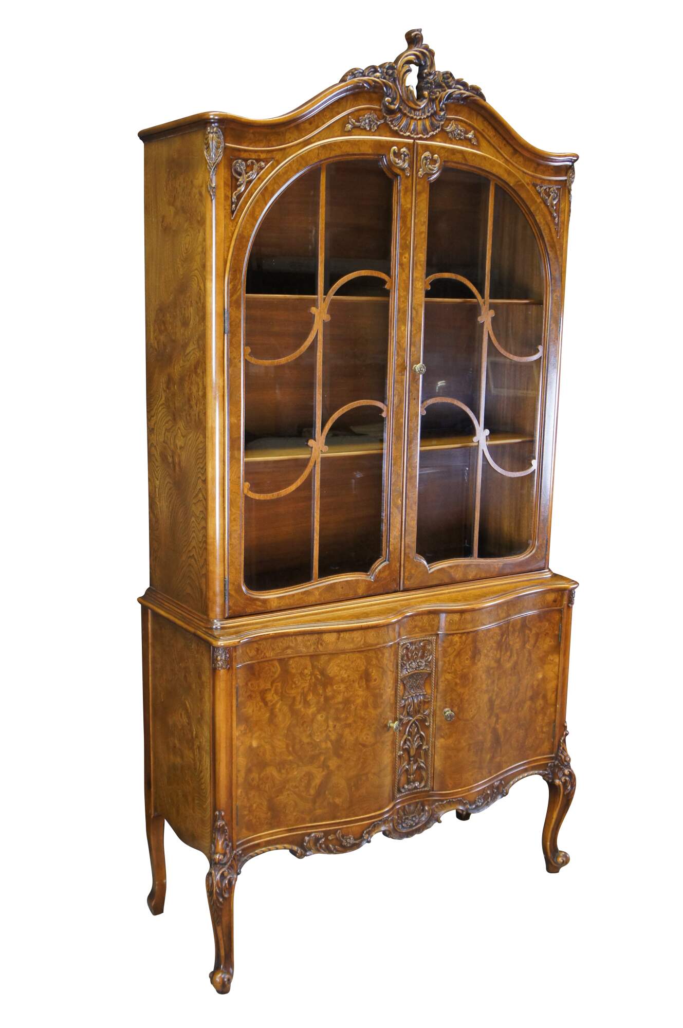 Antique Batesville Cabinet Co French Provincial Louis XV china curio cabinet / cupboard. Made of Carpathian cluster elm burl featuring upper cabinet with serpentine floral cartouch crown and fretwork doors over lower cabinet with carved acanthus design, all supported by cabriole legs. 645.