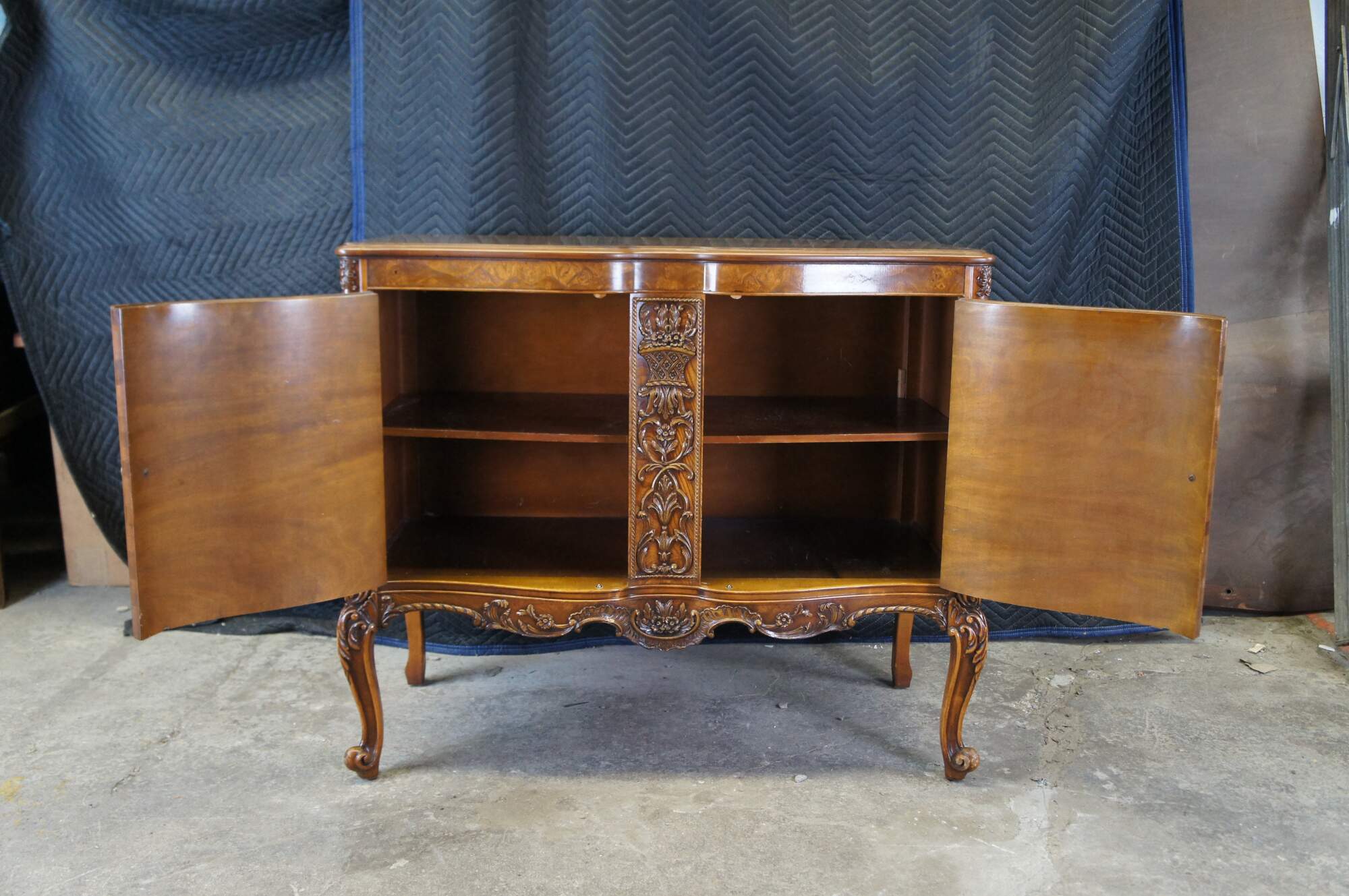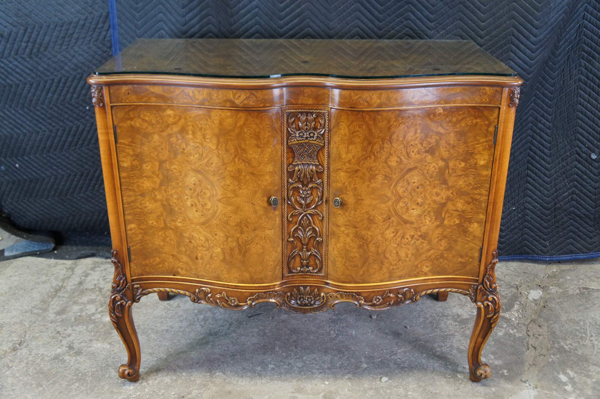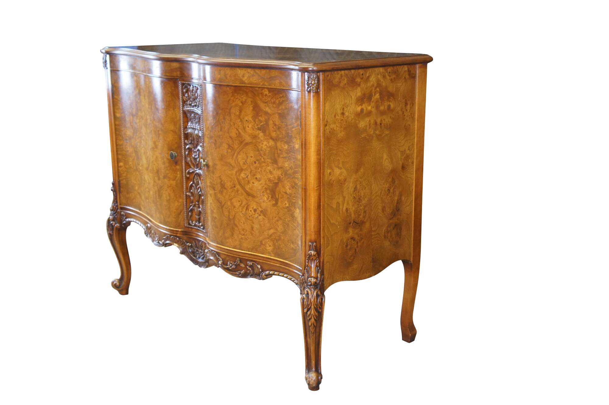 Antique Batesville French Provincial Louis XV Carpathian Elm cabinet / sideboard / buffet / credenza / console / commode / server. Made of Carpathian cluster elm burl featuring serpentine form with floral and acanthus carvings, and cabriole legs. 645.
