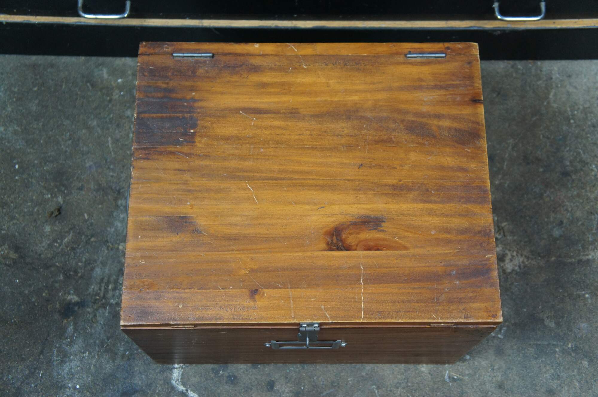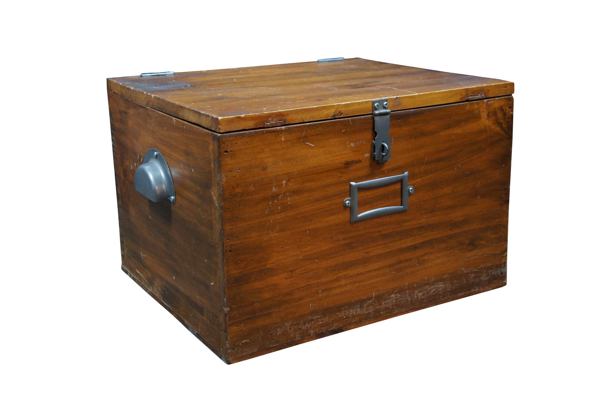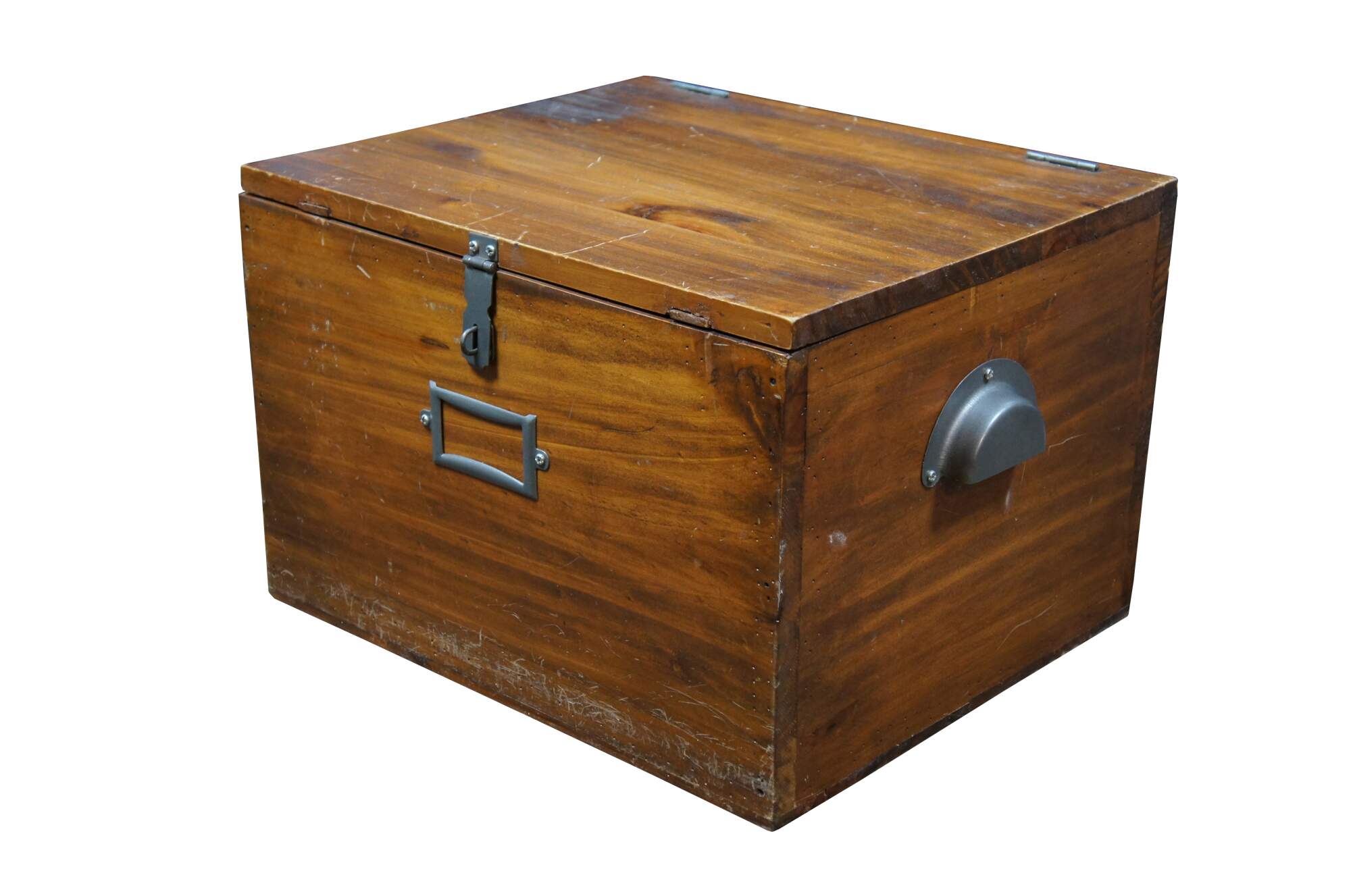 Late 20th century filing box / file chest, made of pine with gunmetal gray hardware - hanging file rods / bars, cup handles, lockable hasp, and label frame. Made in Philippines.