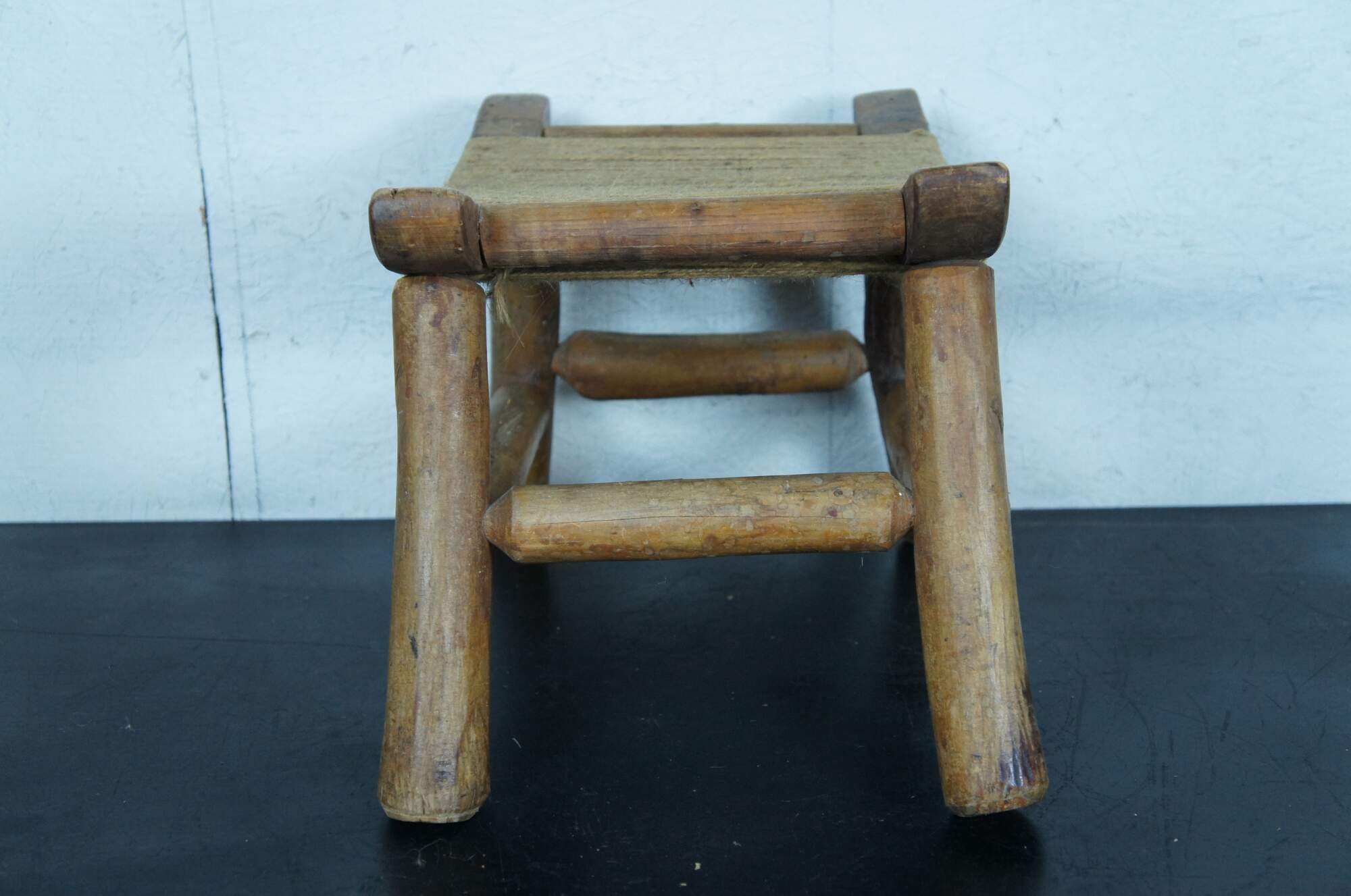Early 20th century rustic early American / country farmhouse / Shaker style milking stool / foot rest featuring adirondack log form carved legs, bowed top and a simple jute rope seat.