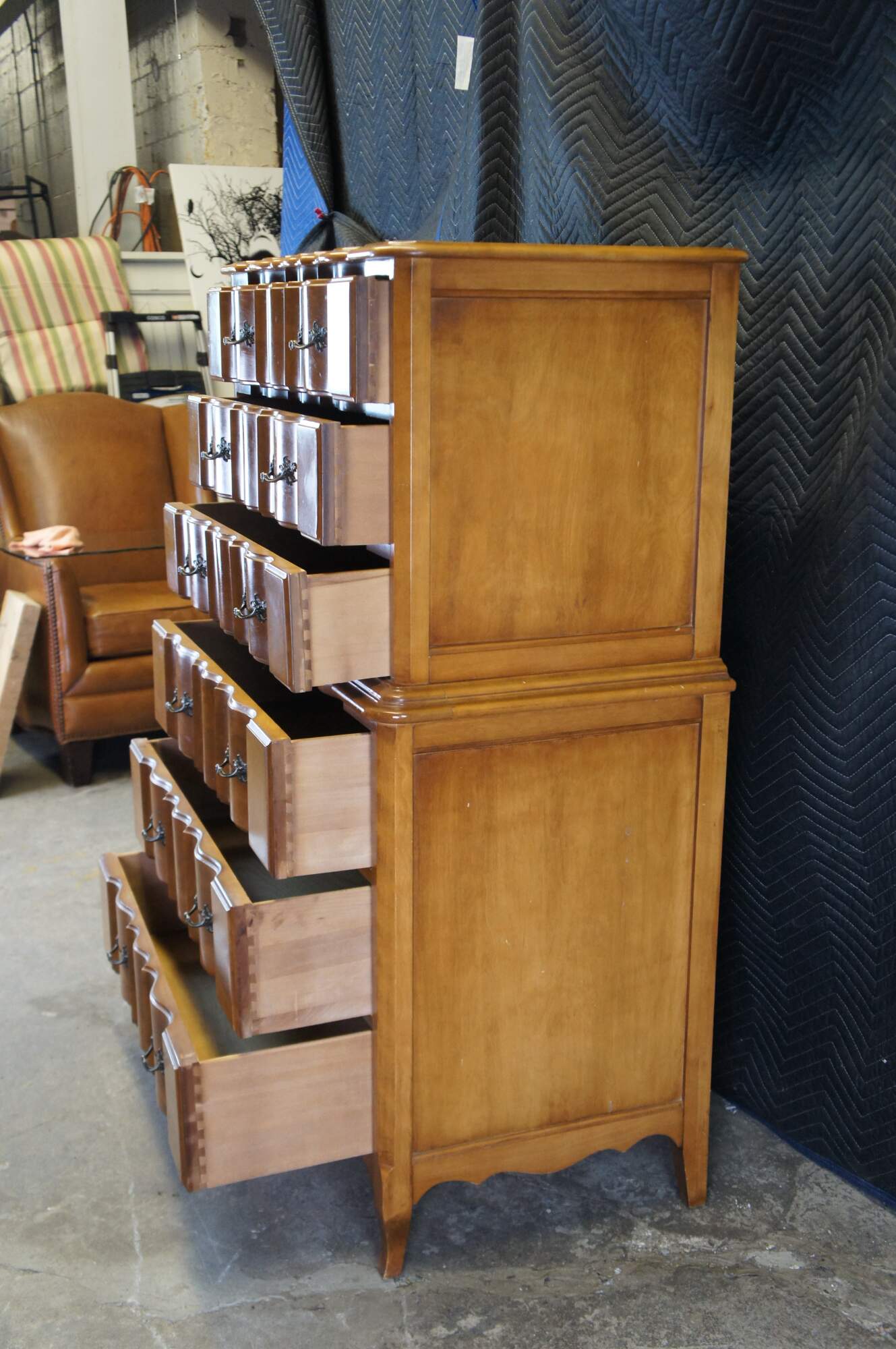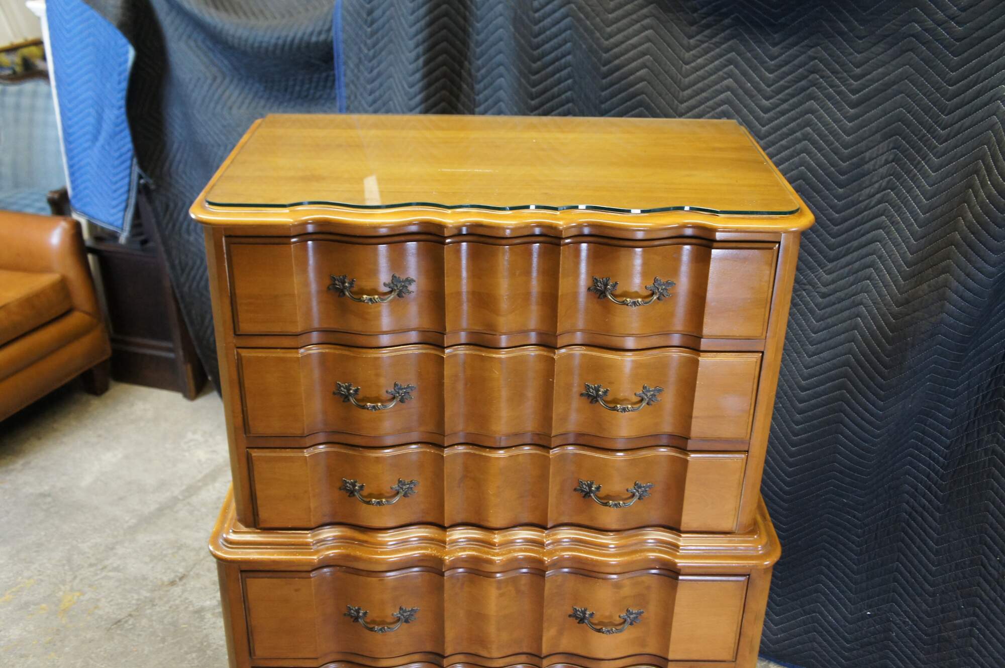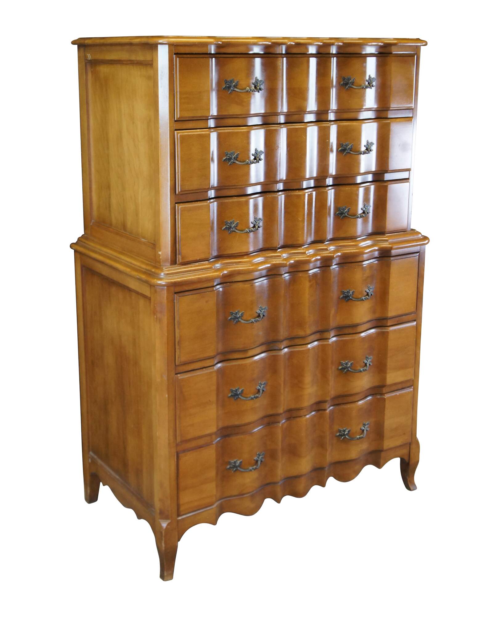 Mid Century French Provincial Burns Case Goods tallboy / highboy chest of drawers / chest on chest style dresser. Made of walnut featuring serpentine form with six drawers and brass hardware.