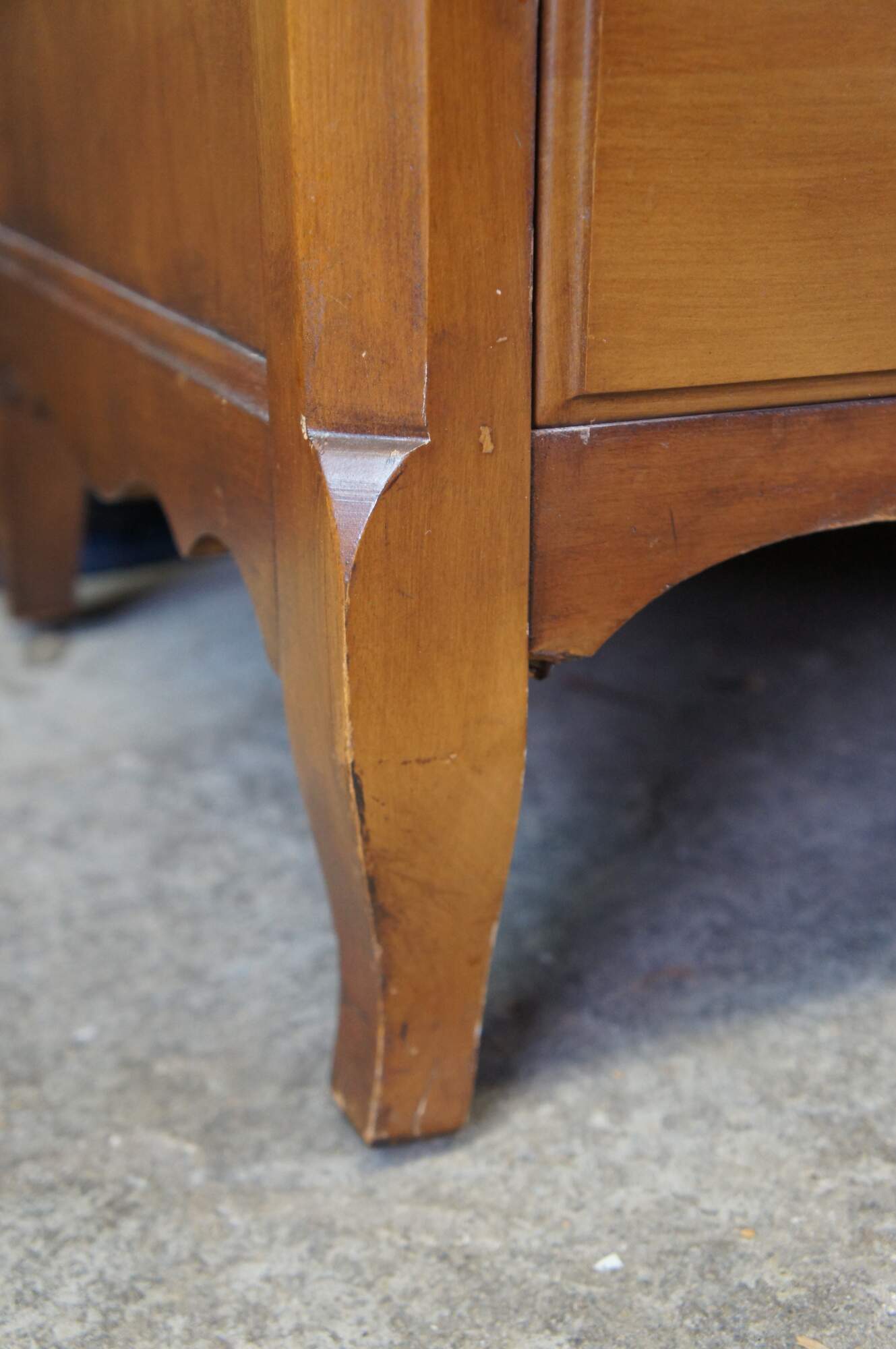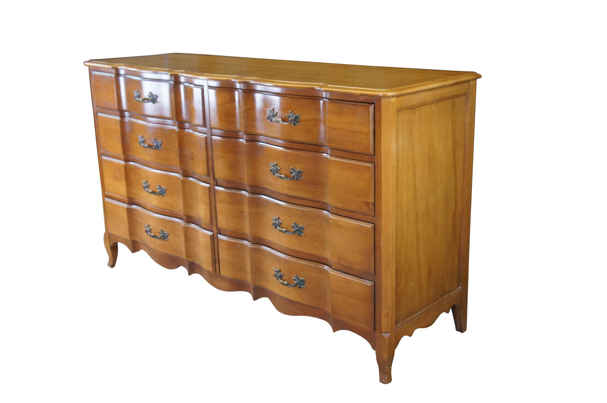 Mid Century French Provincial Burns Case Goods double dresser / lowboy / chest of drawers. Made of walnut featuring serpentine form with eight drawers and brass hardware.