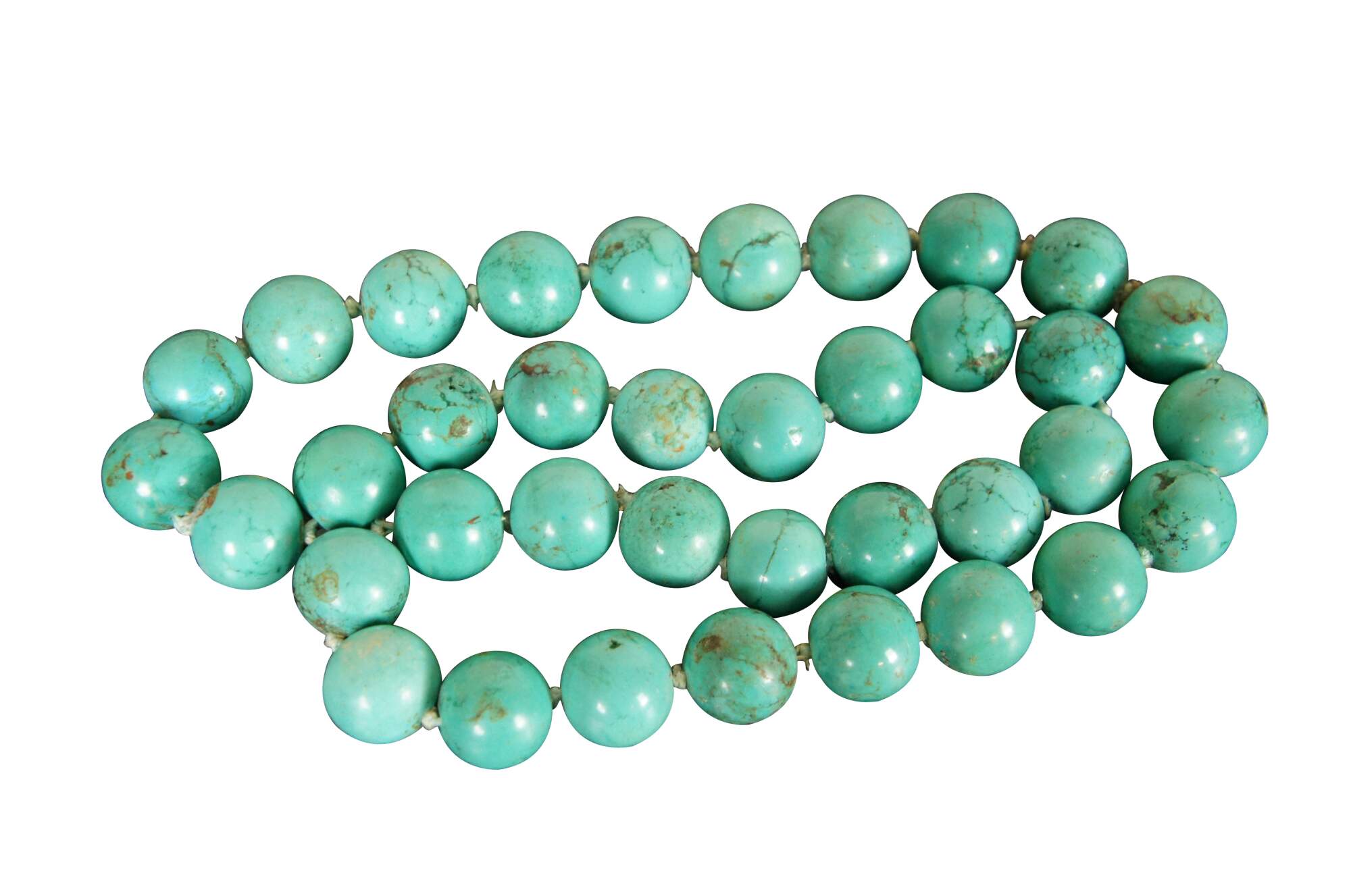 A very large and impressive statement necklace featuring Southwestern style chunky round 24mm green-blue turquoise beads. Knotted between each bead.