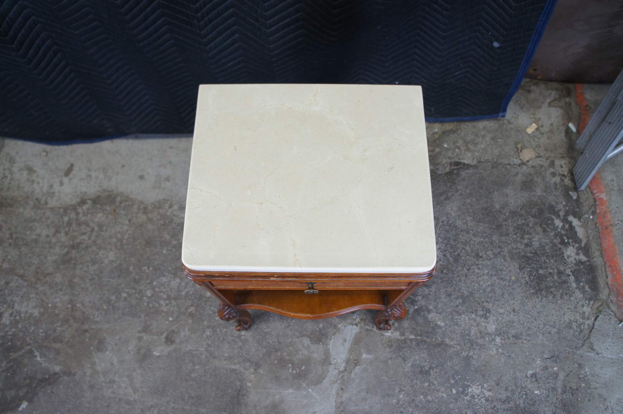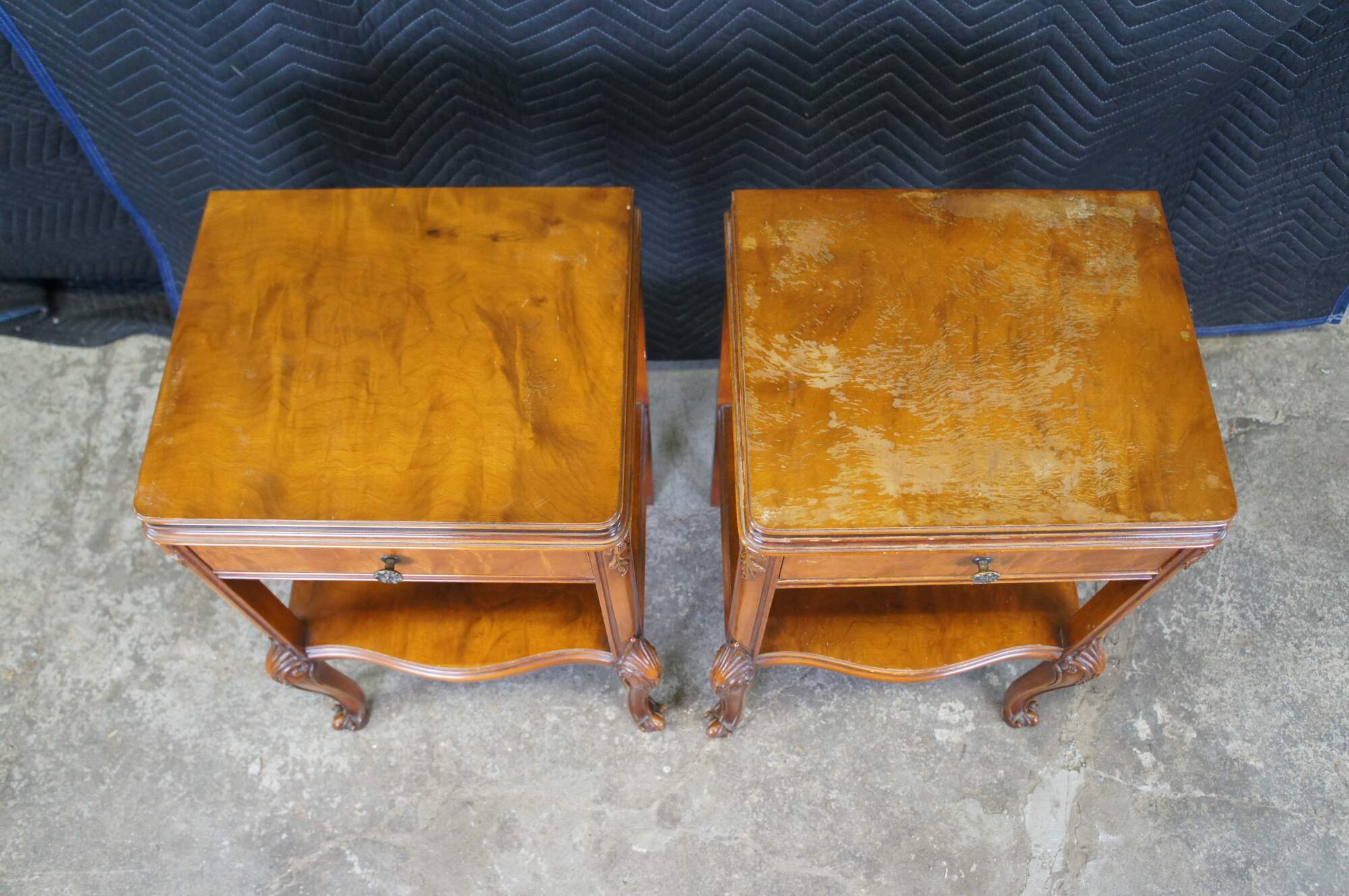 Pair of two Henredon French Provincial end tables, pedestals, nightstands. Made of walnut featuring two tier design with marble tops and cabriole legs with acanthus design. 6065 430