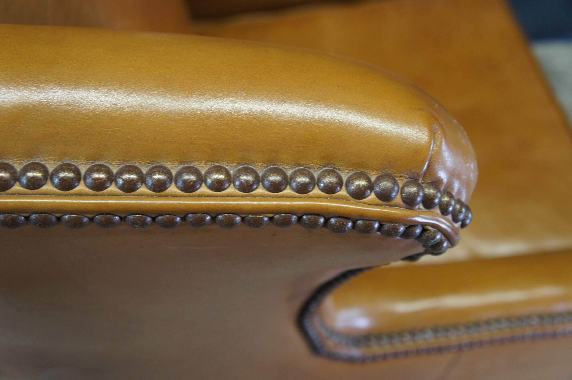Set of two vintage Henredon club / lounge / library wingback arm chairs and ottoman featuring traditional styling with brown leather upholstery and nailhead trim.
