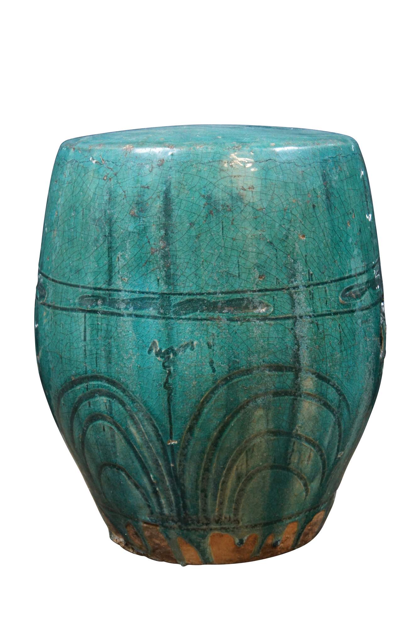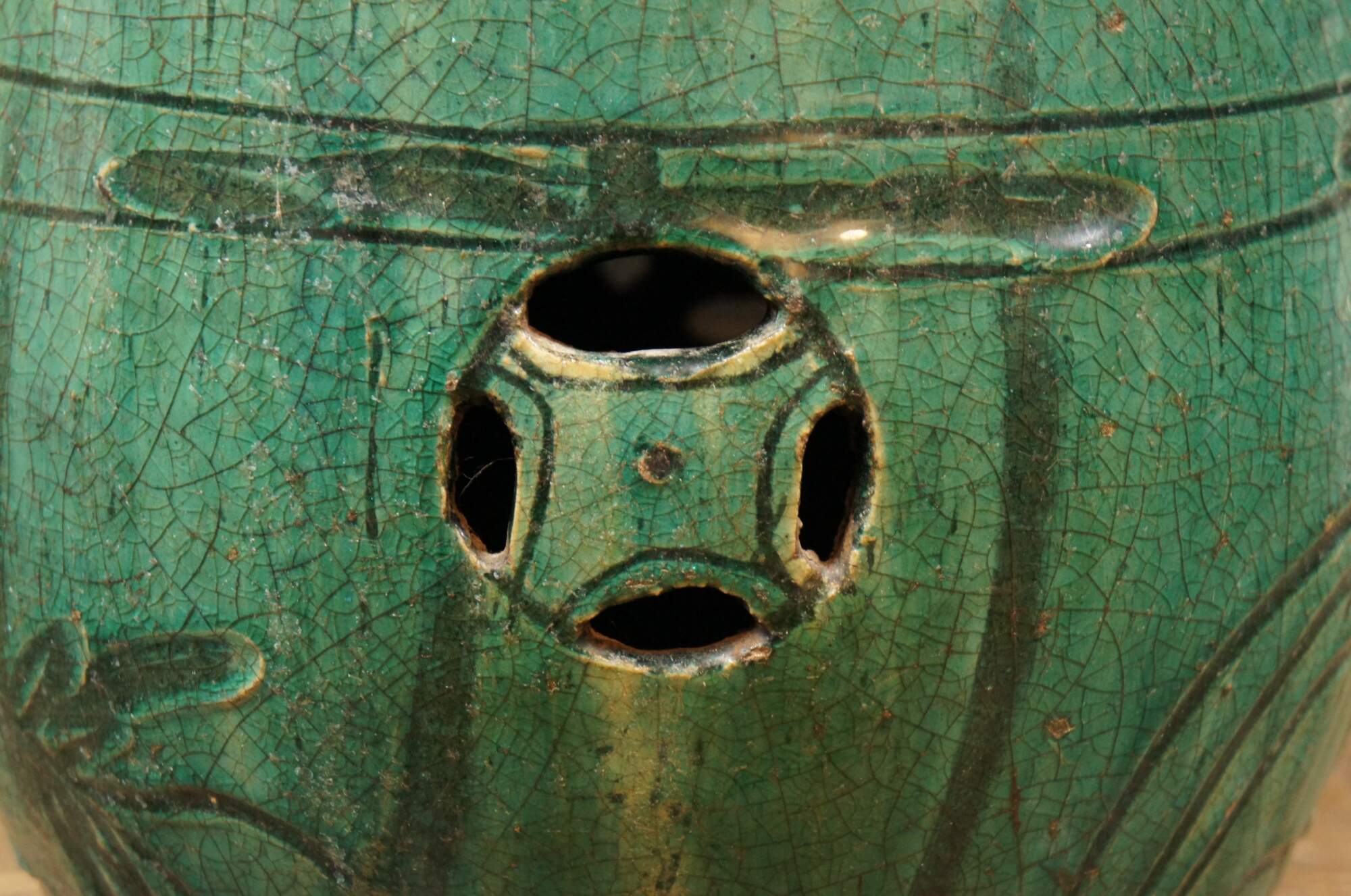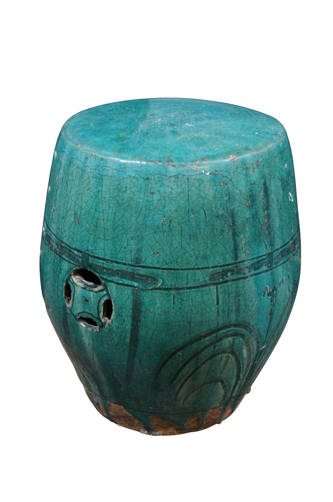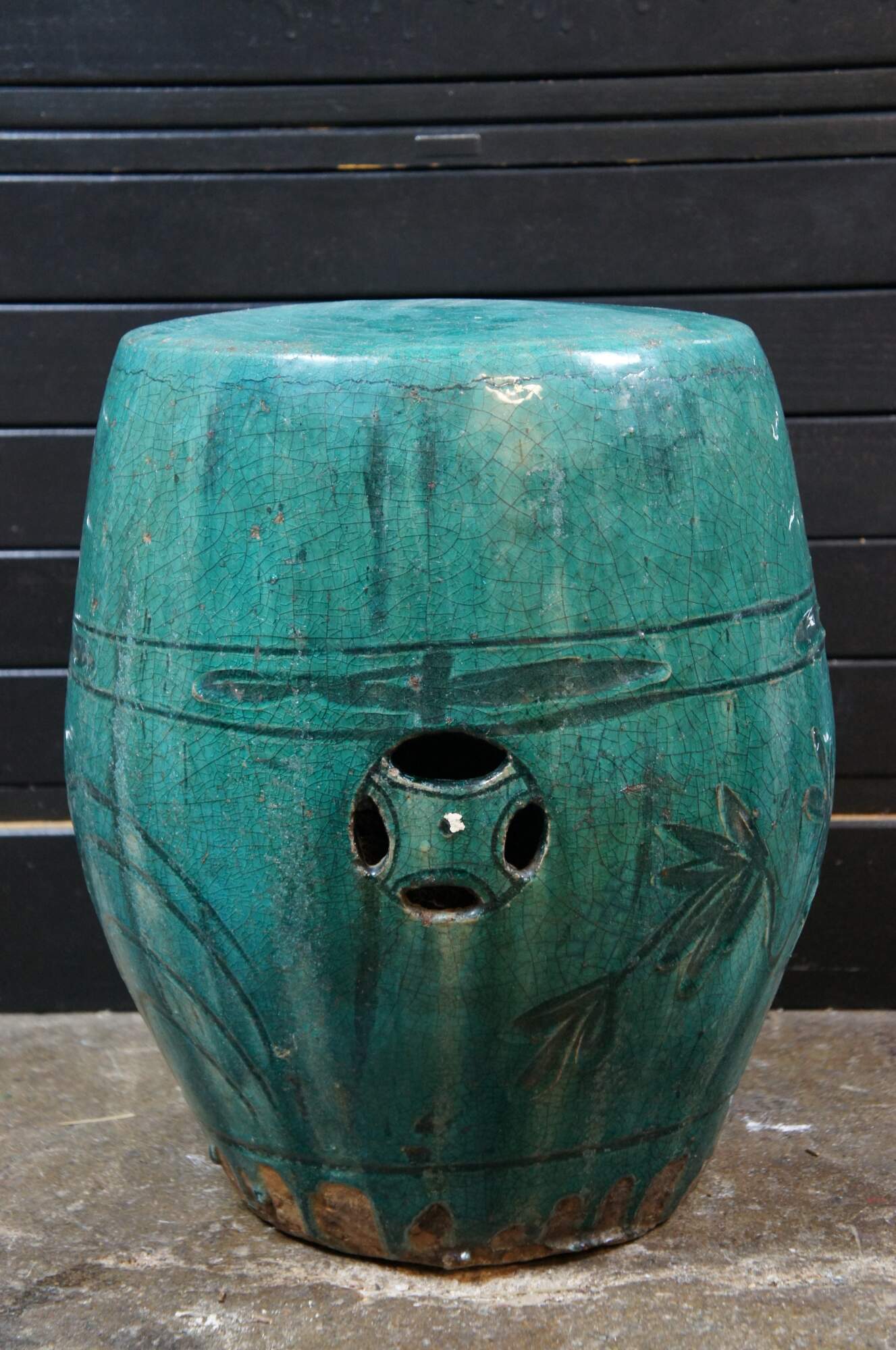 Antique Chinese ceramic garden stool / planter / pedestal / side table - traditional barrel shaped design with cut out medallions on two sides, decorated with a simple carved motif of flowers and reeds, finished with a deep green / teal / turquoise glaze.