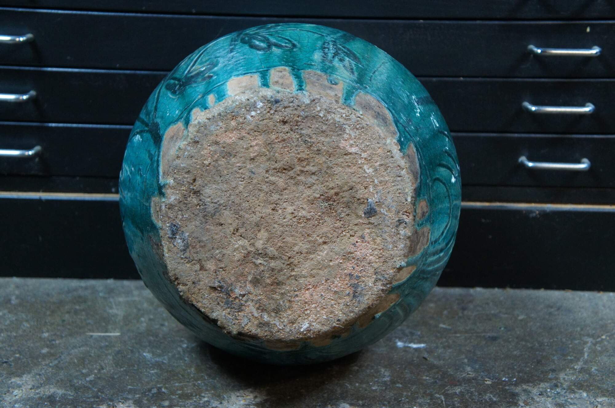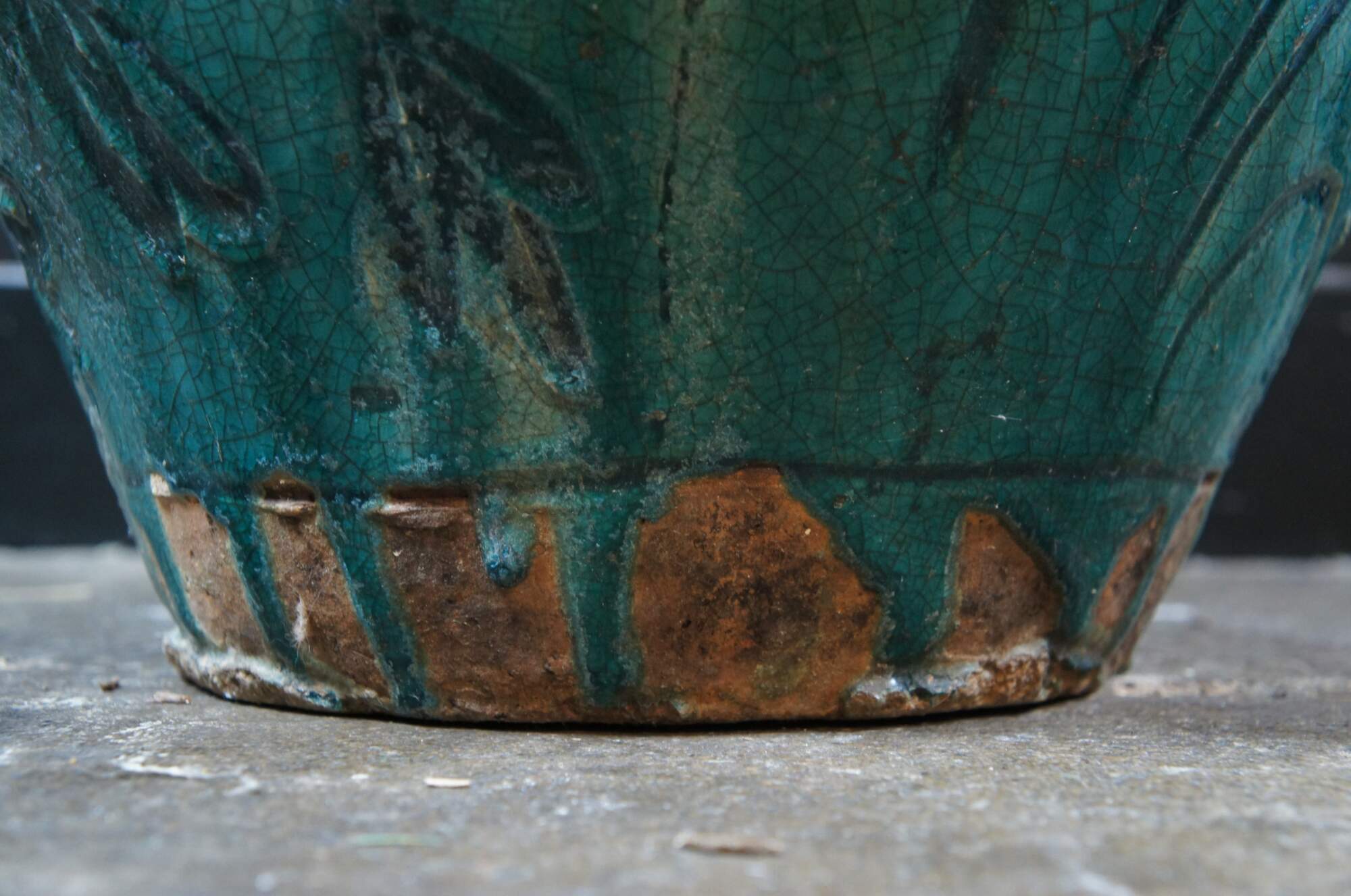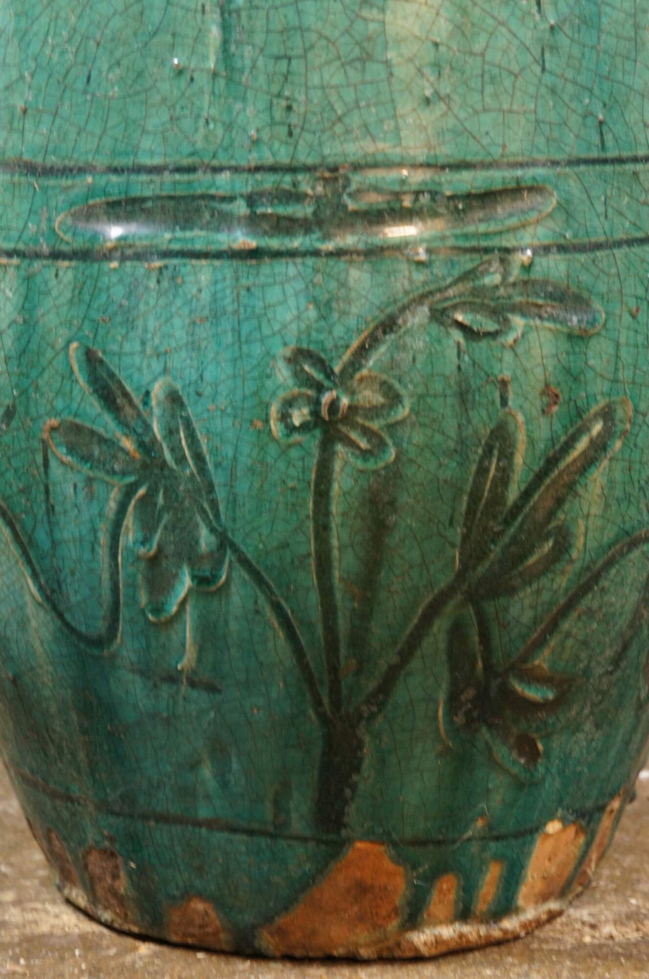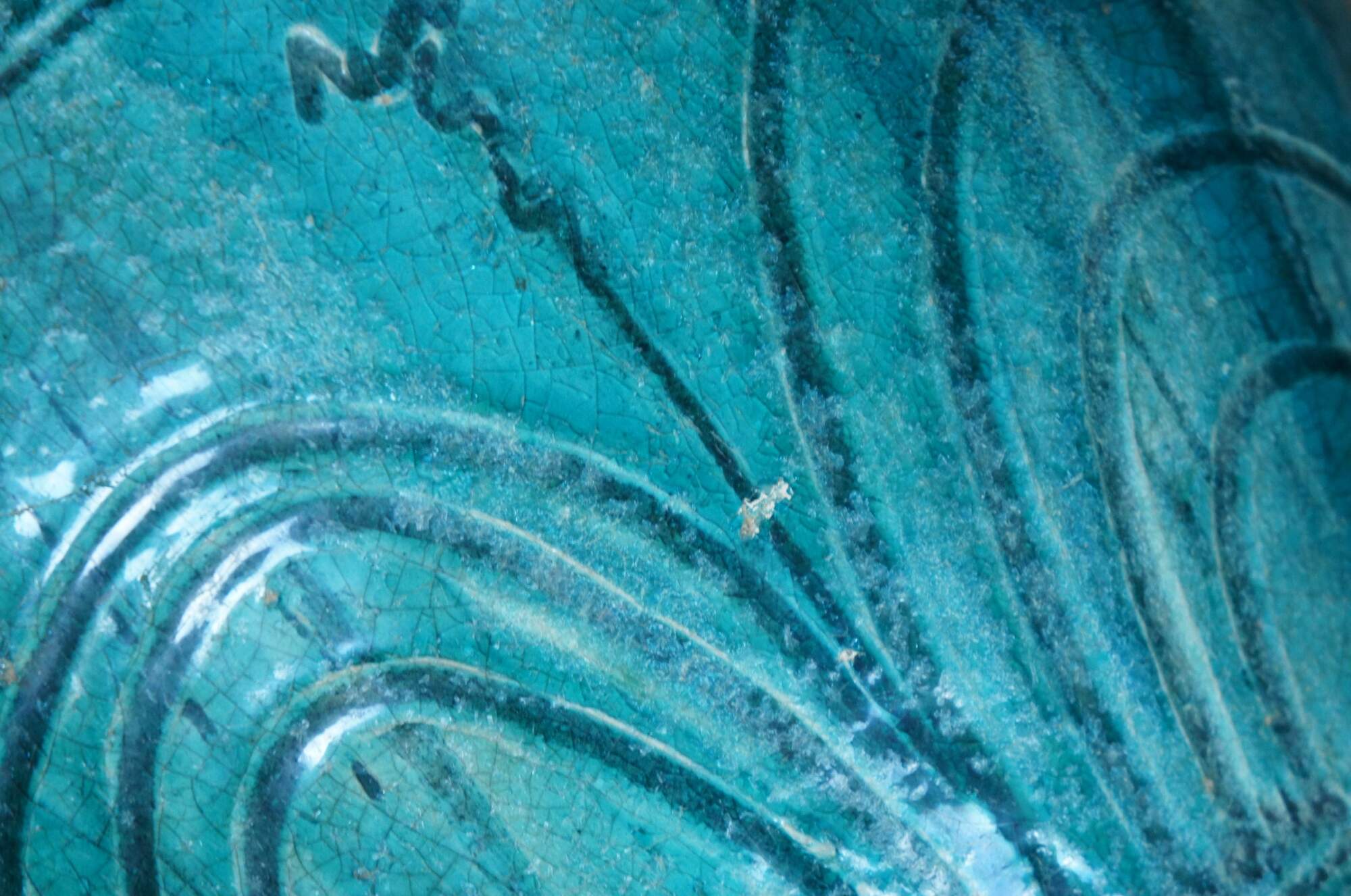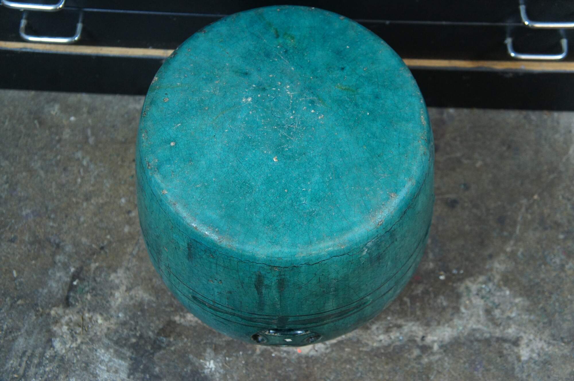 Antique Chinese ceramic garden stool / planter / pedestal / side table - traditional barrel shaped design with cut out medallions on two sides, decorated with a simple carved motif of flowers and reeds, finished with a deep green / teal / turquoise glaze.