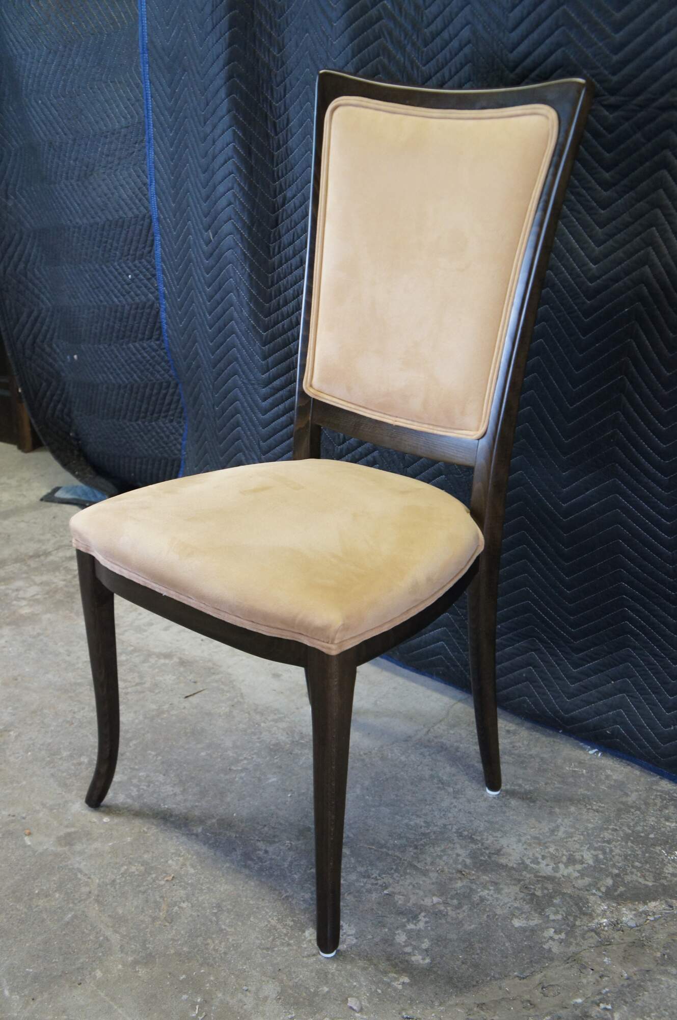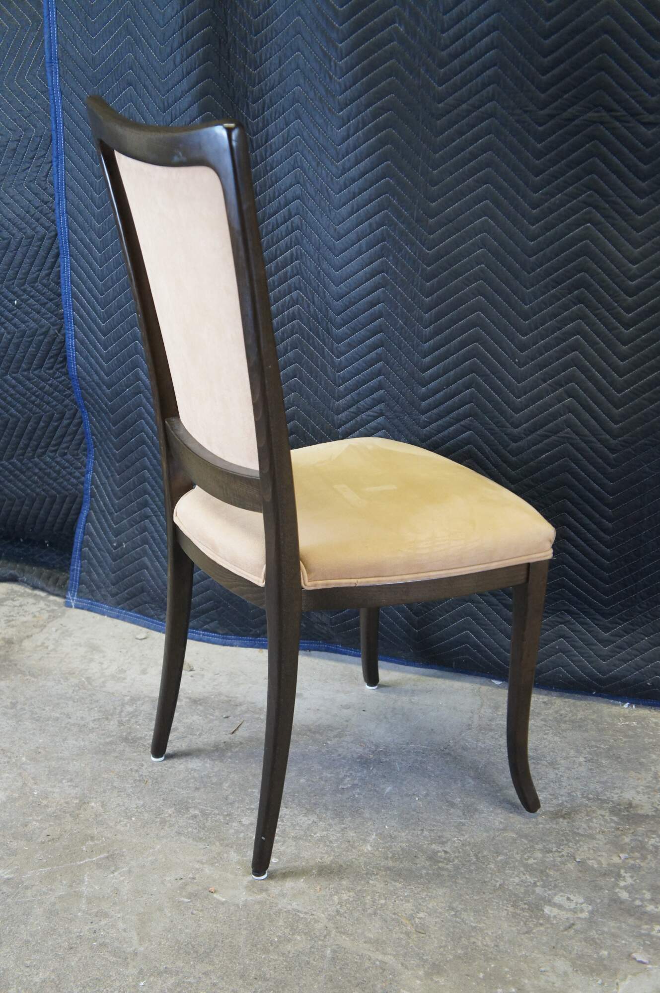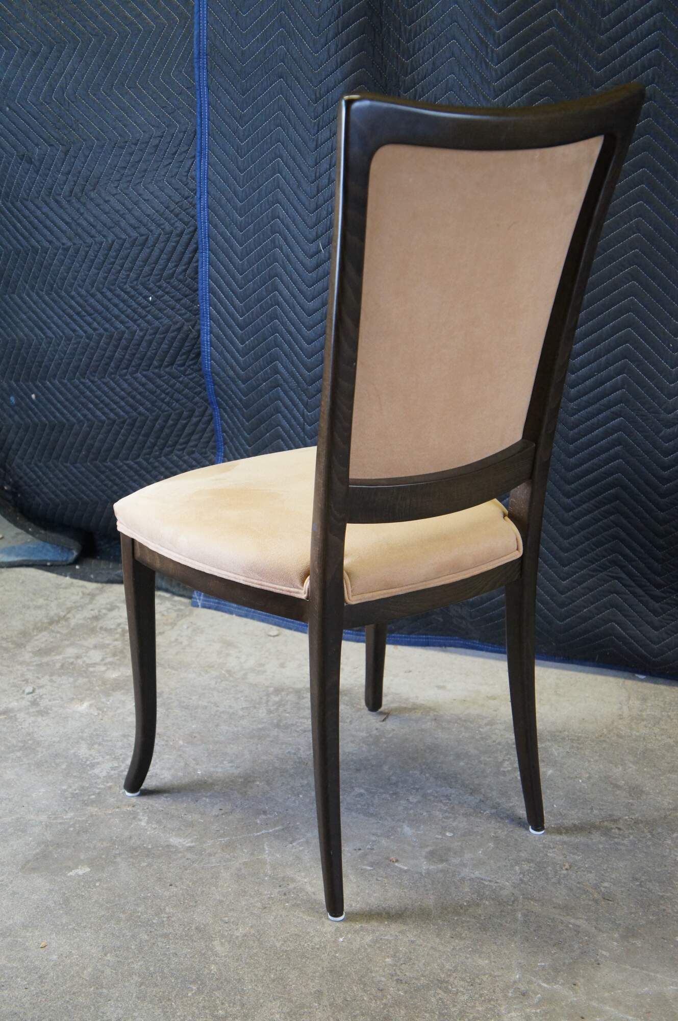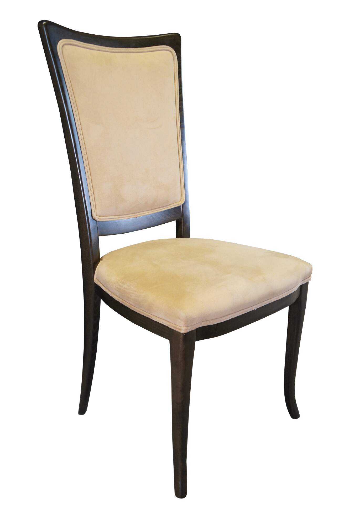 Four vintage modern Italian Parsons dining chairs featuring dark oak frame with suede upholstery. Made in Italy.