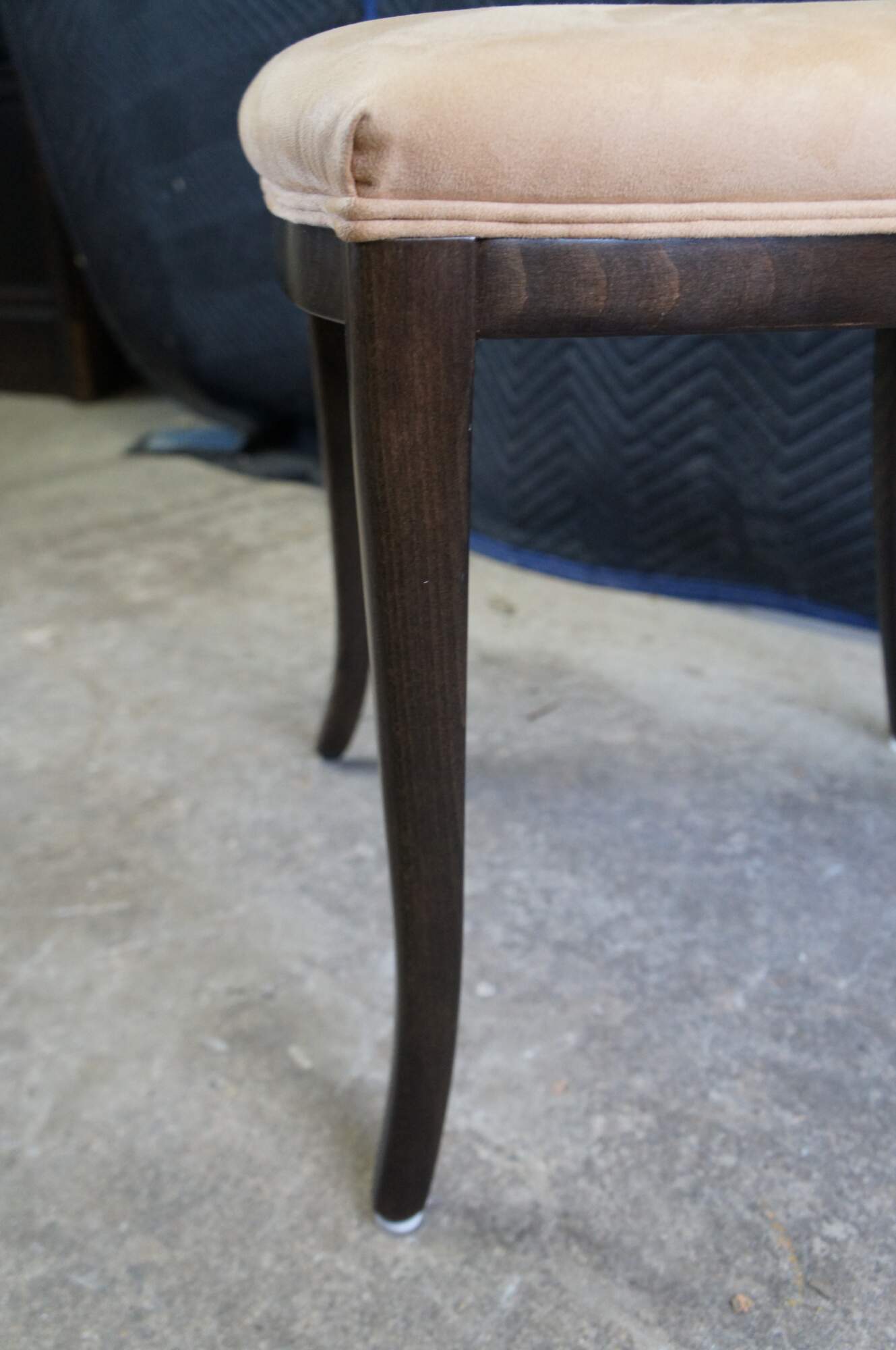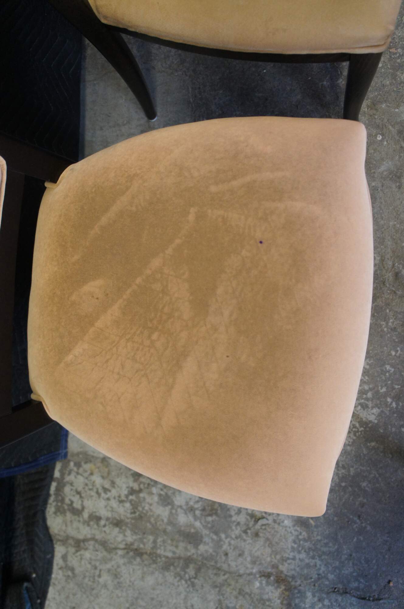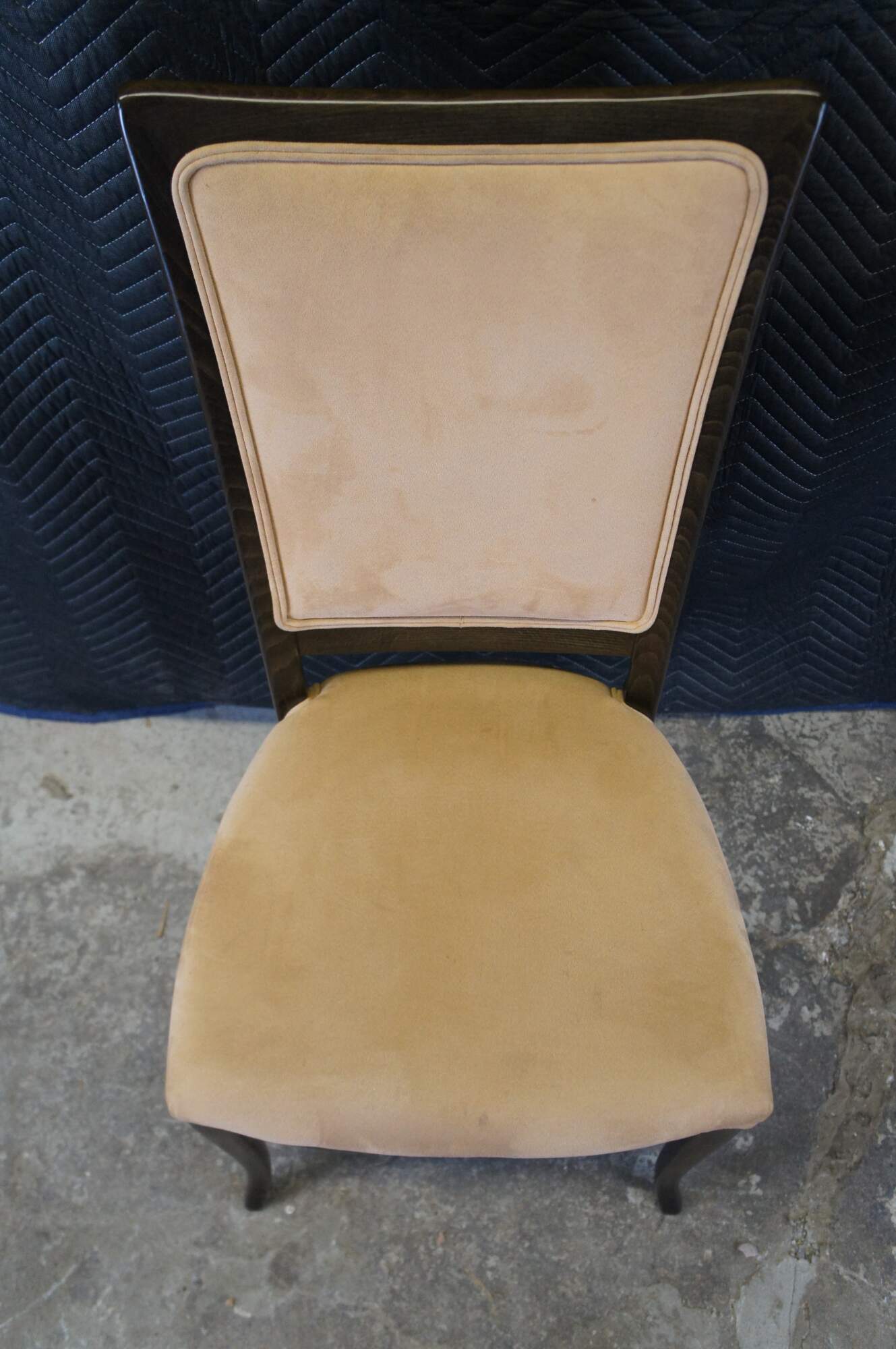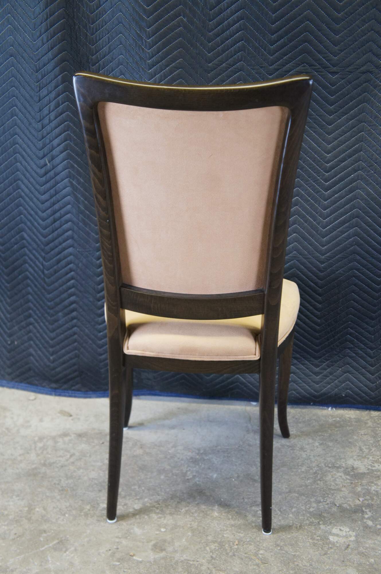 Four vintage modern Italian Parsons dining chairs featuring dark oak frame with suede upholstery. Made in Italy.