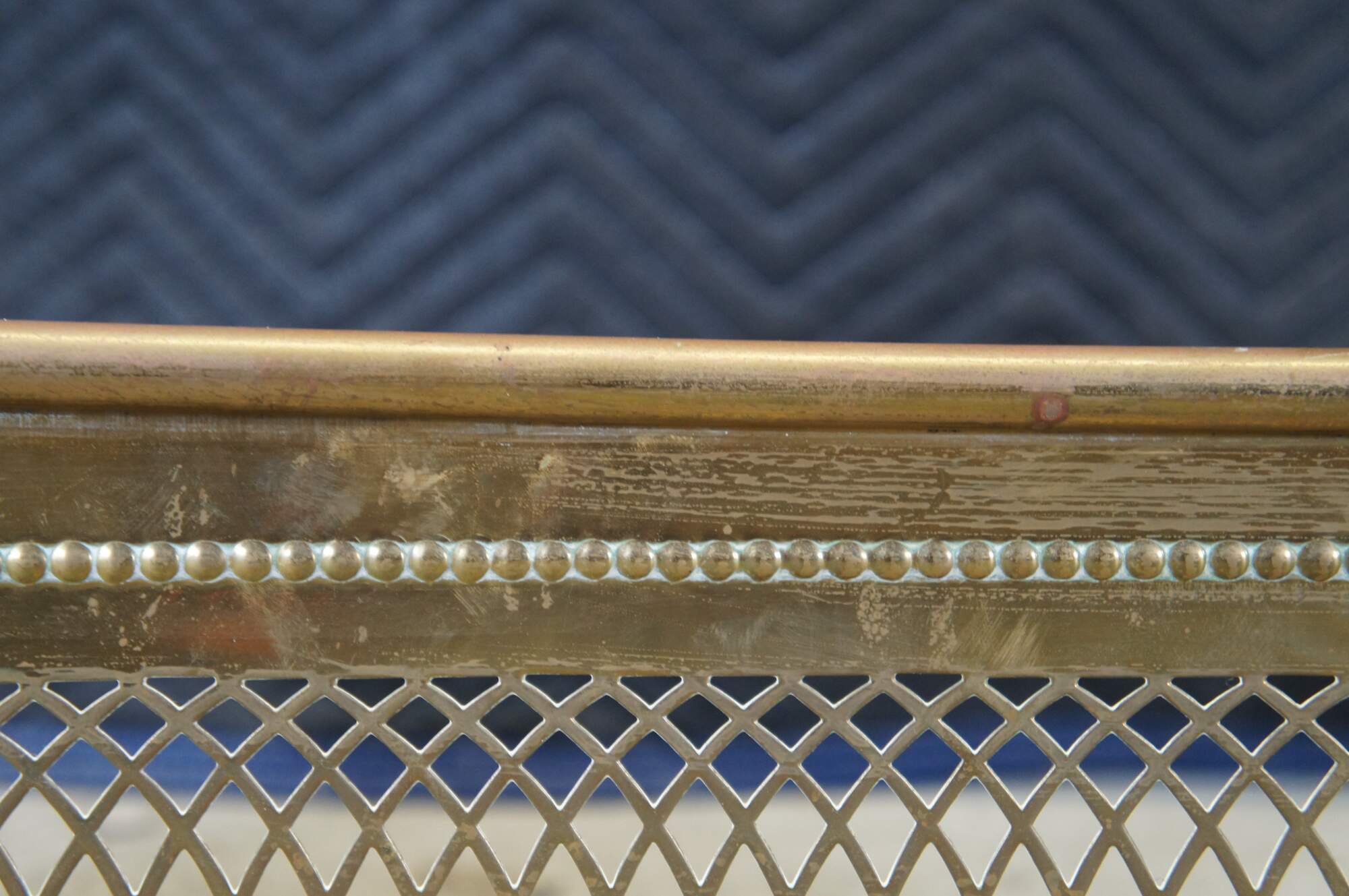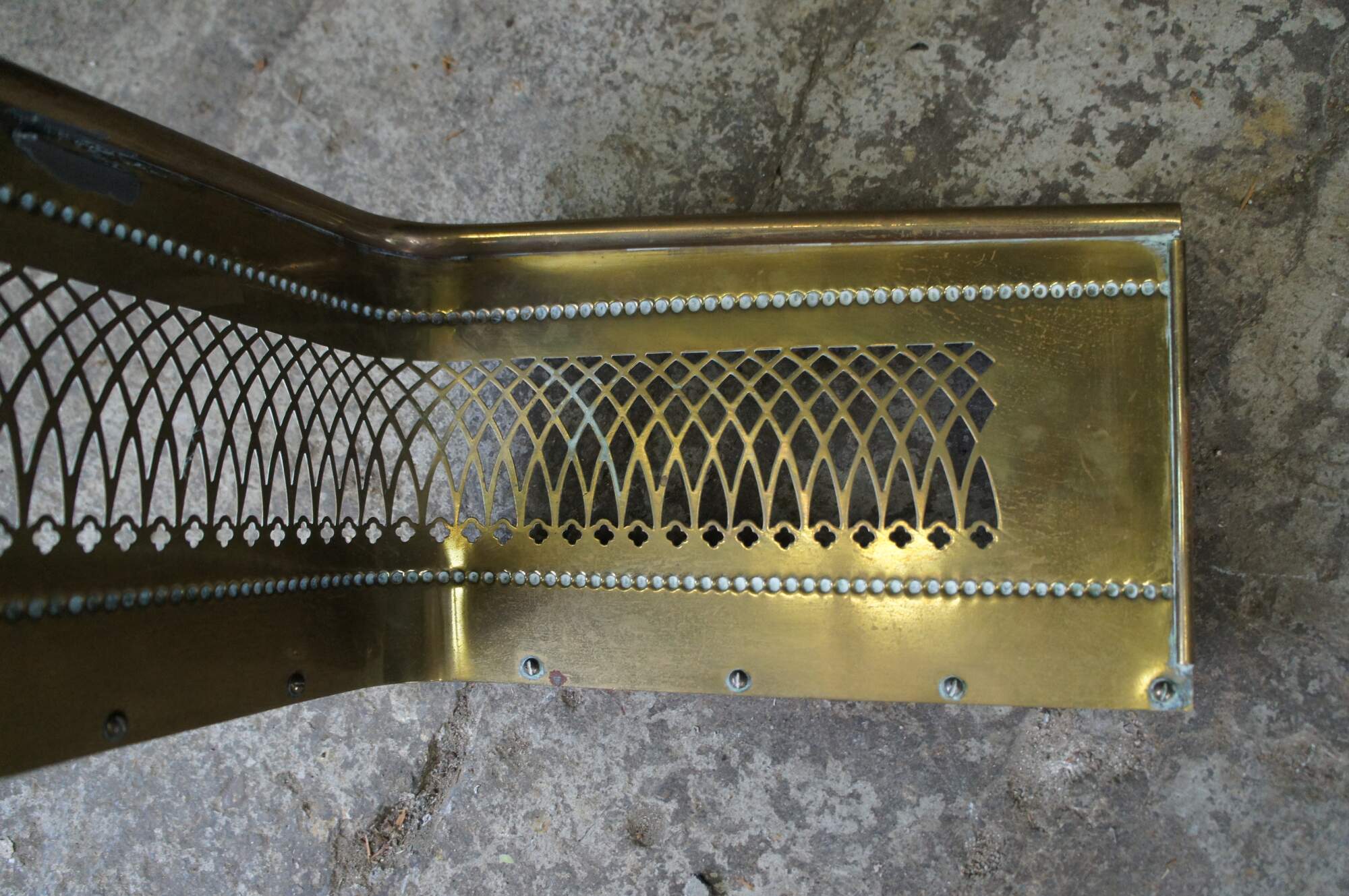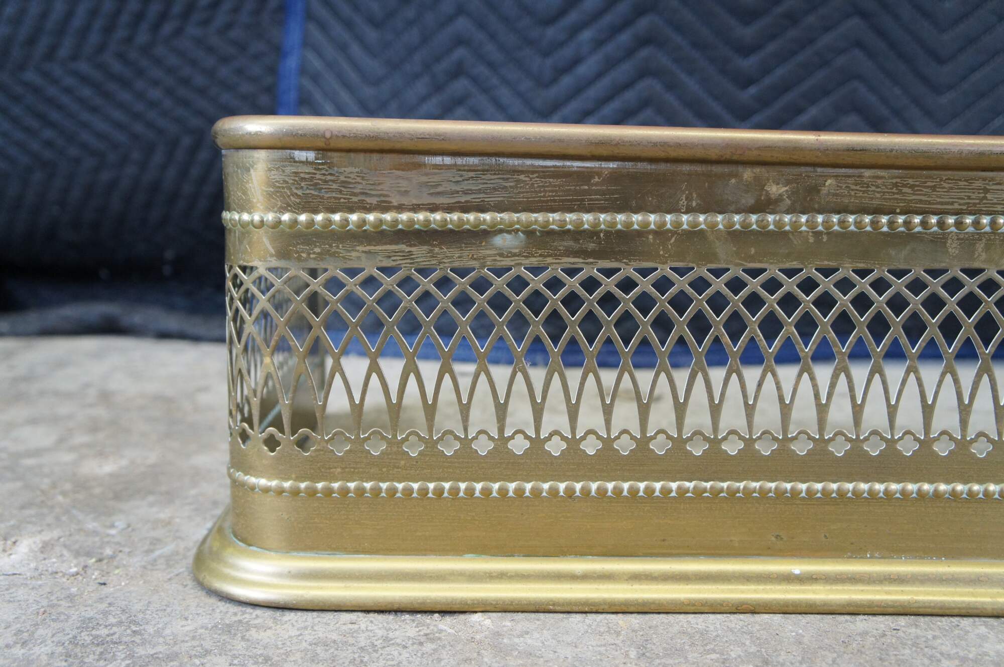 Antique Victorian brass fireplace fender featuring a pierced / reticulated Colonial design with a beaded accent.