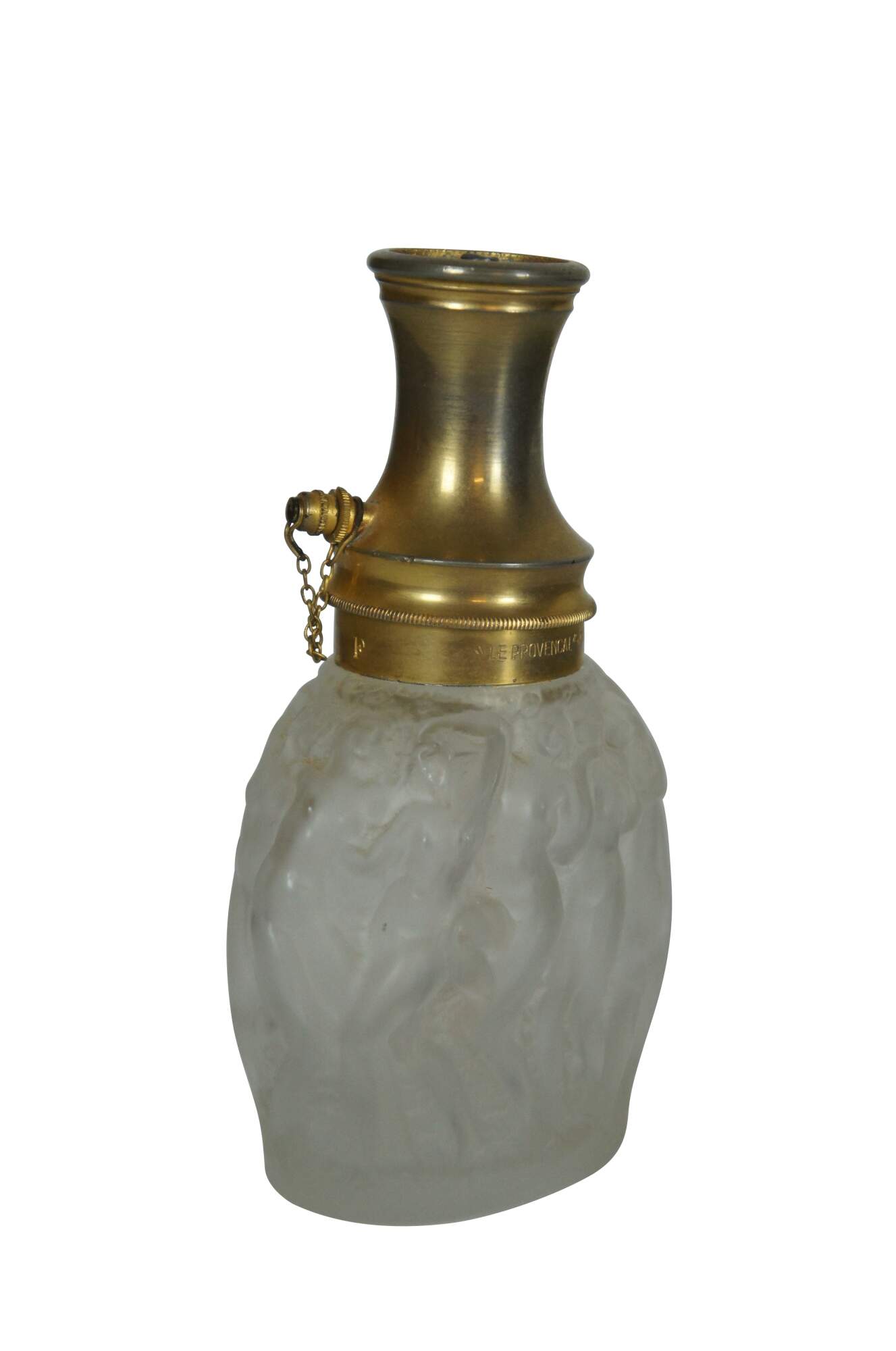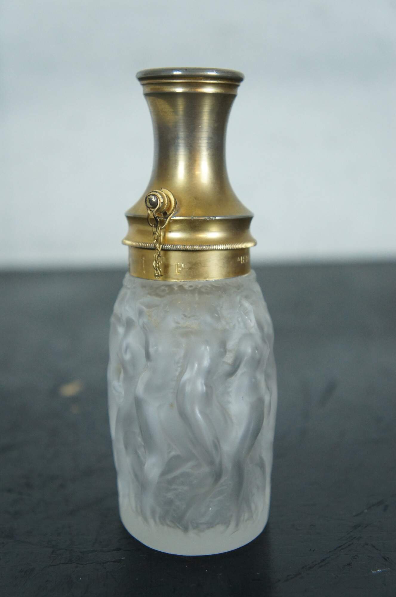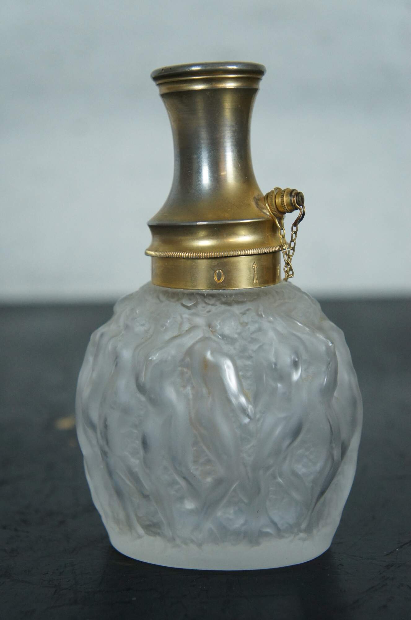 Late 20th century Lalique for Molinard "Le Provencal" frosted crystal perfume bottle with brass top / atomizer. Oval base is decorated with a flurry of nude figures having a bacchanal. Signed on base.