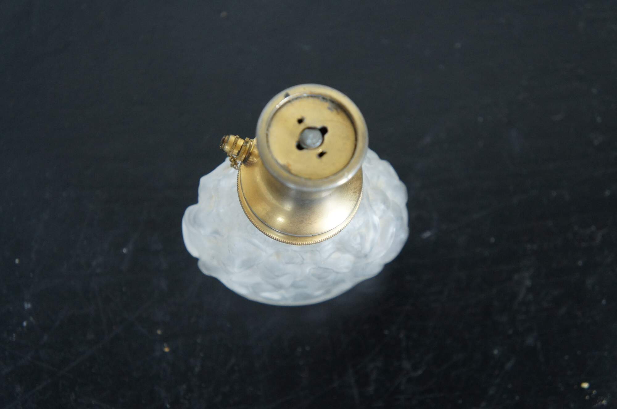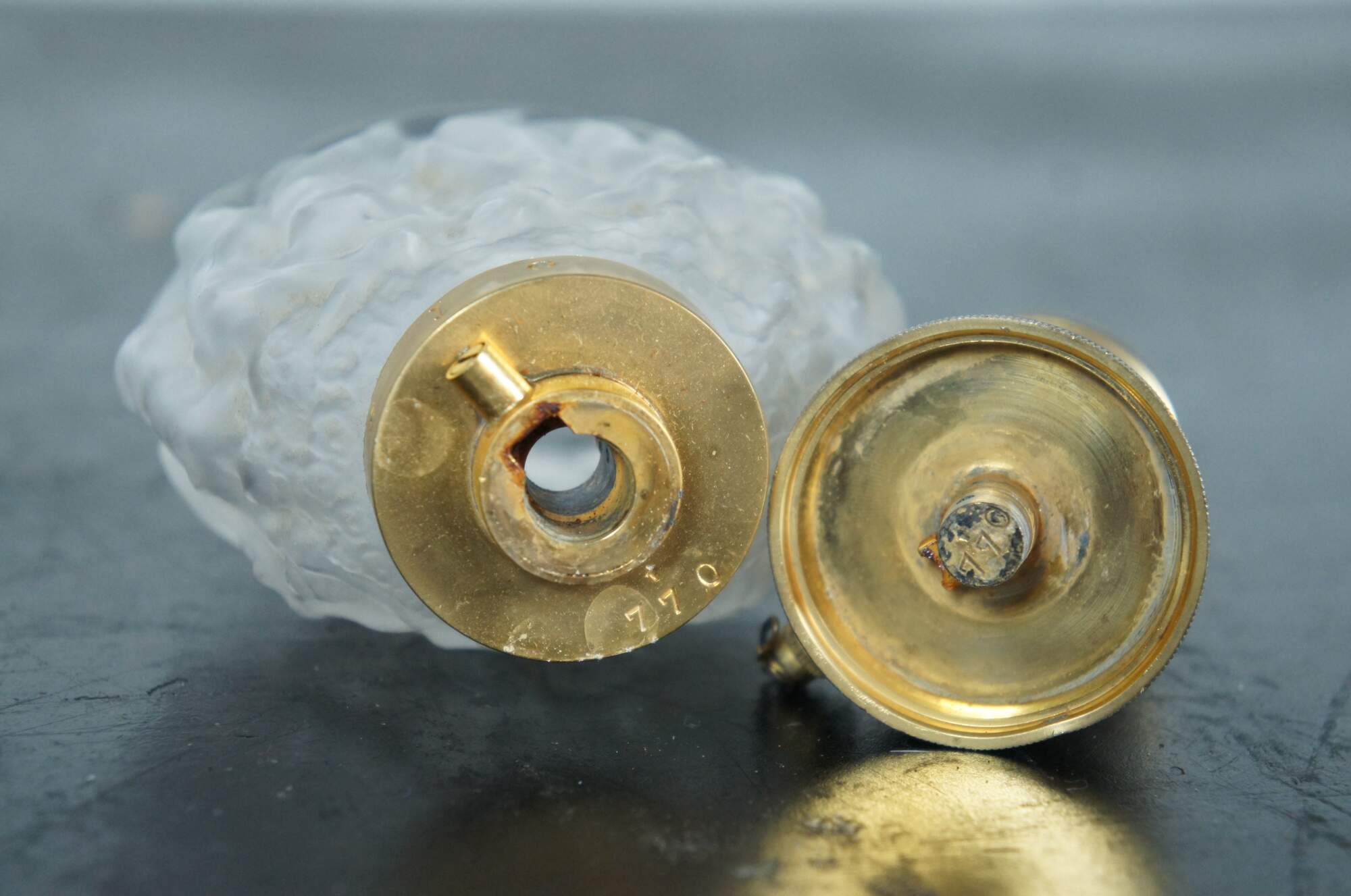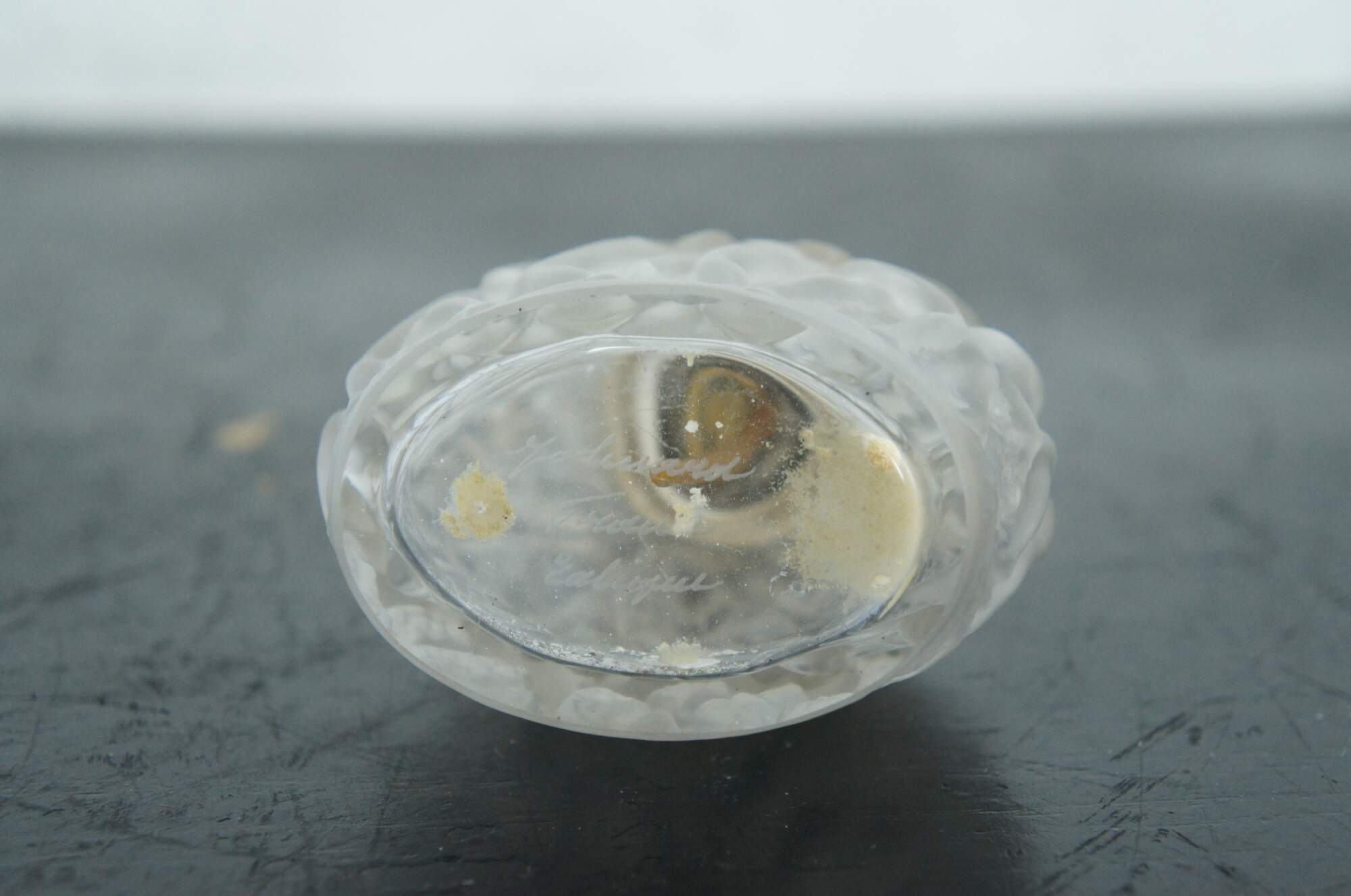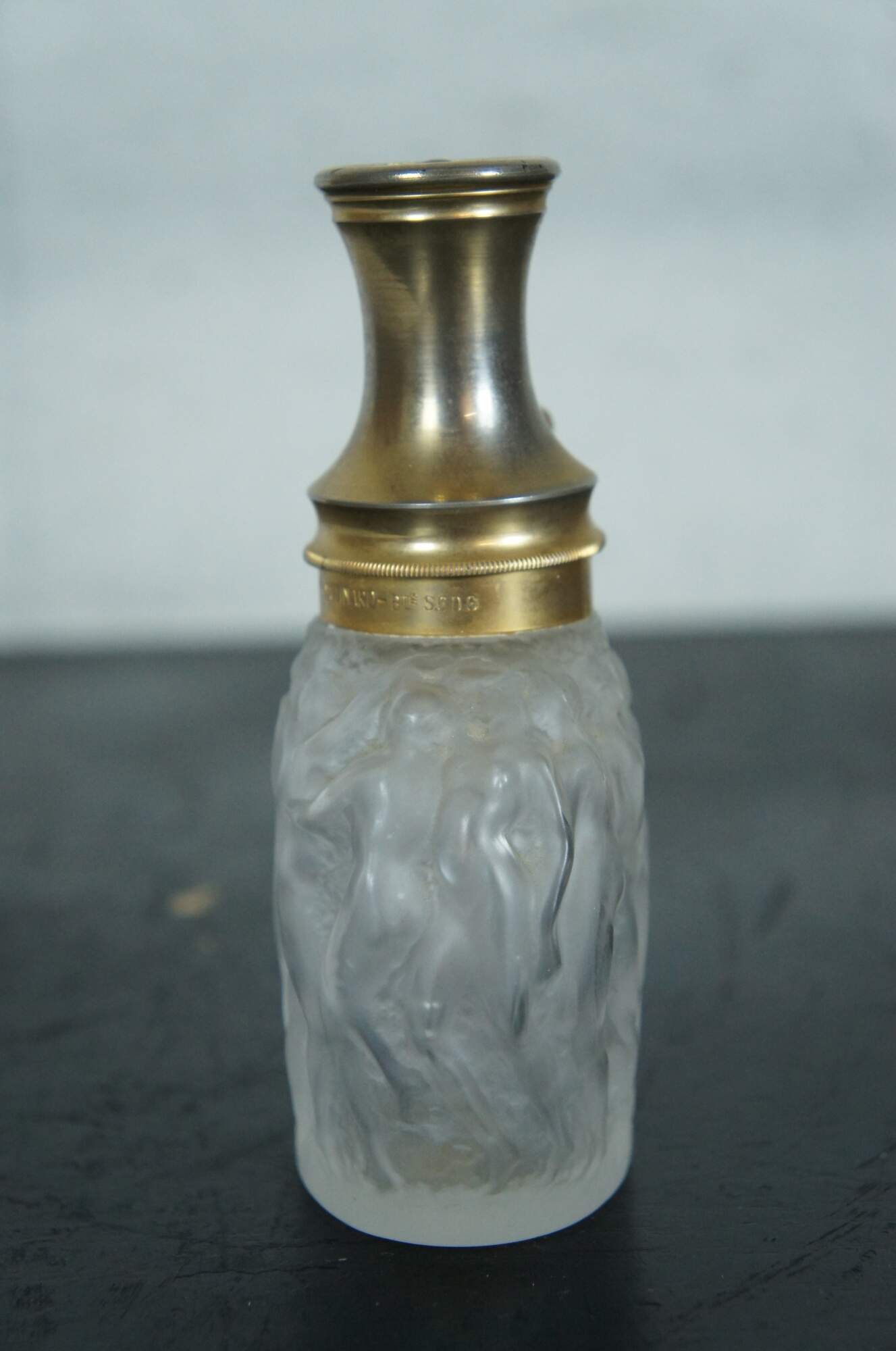 Late 20th century Lalique for Molinard "Le Provencal" frosted crystal perfume bottle with brass top / atomizer. Oval base is decorated with a flurry of nude figures having a bacchanal. Signed on base.