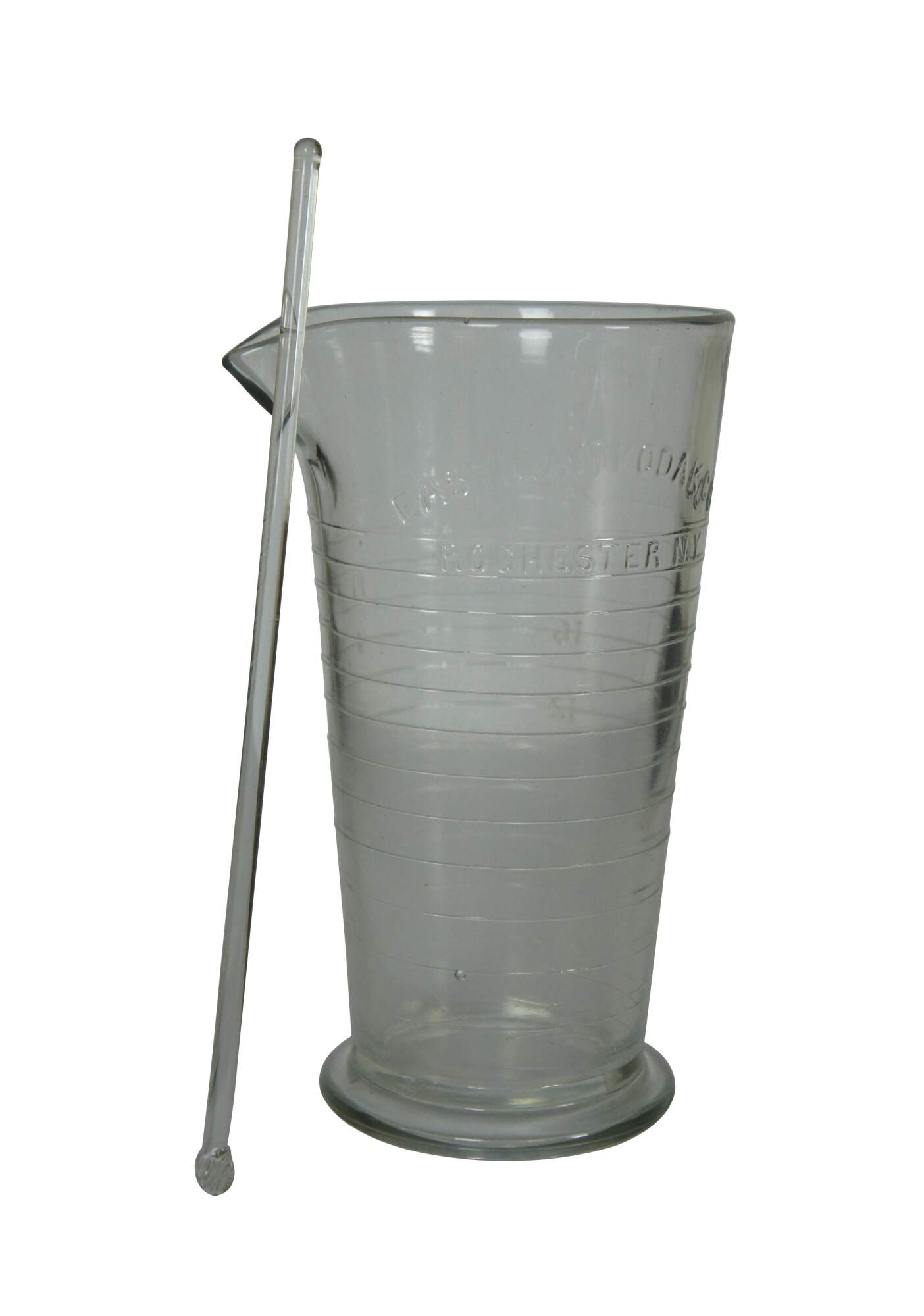 Circa 1940's Eastman Kodak 24 ounce glass mixing / measuring beaker and glass stirring rod / swizzle stick.