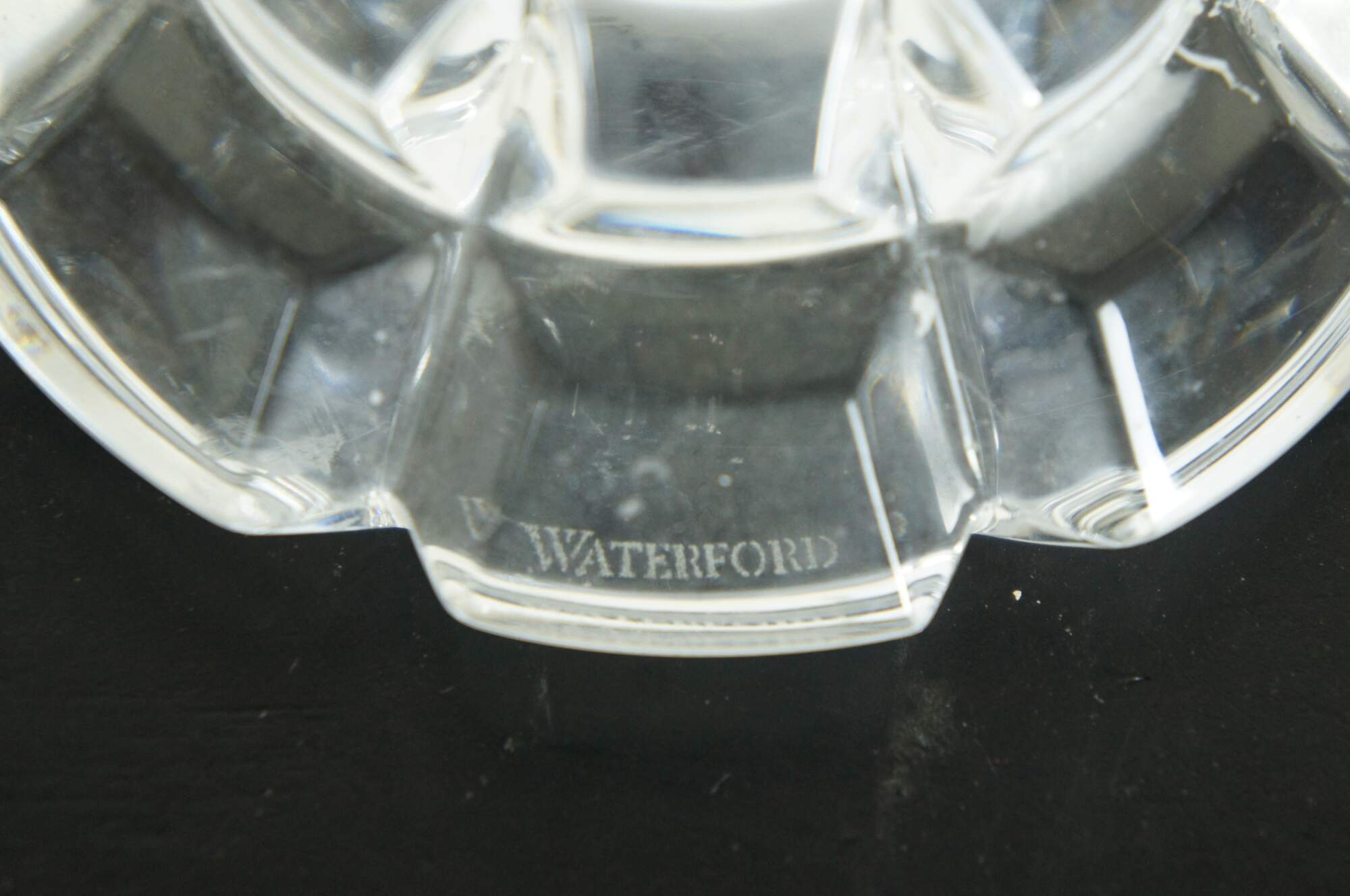 Set of four late 20th century Waterford cut crystal Luma / Illuminology candlesticks. Column design with splayed bases, cut in a modern geometric stone / brick pattern.