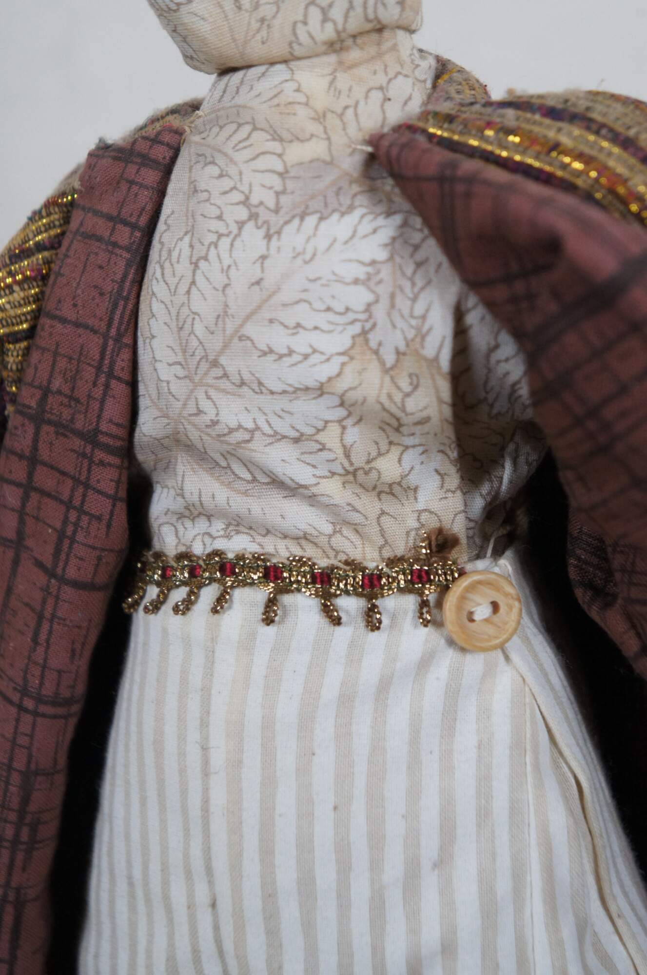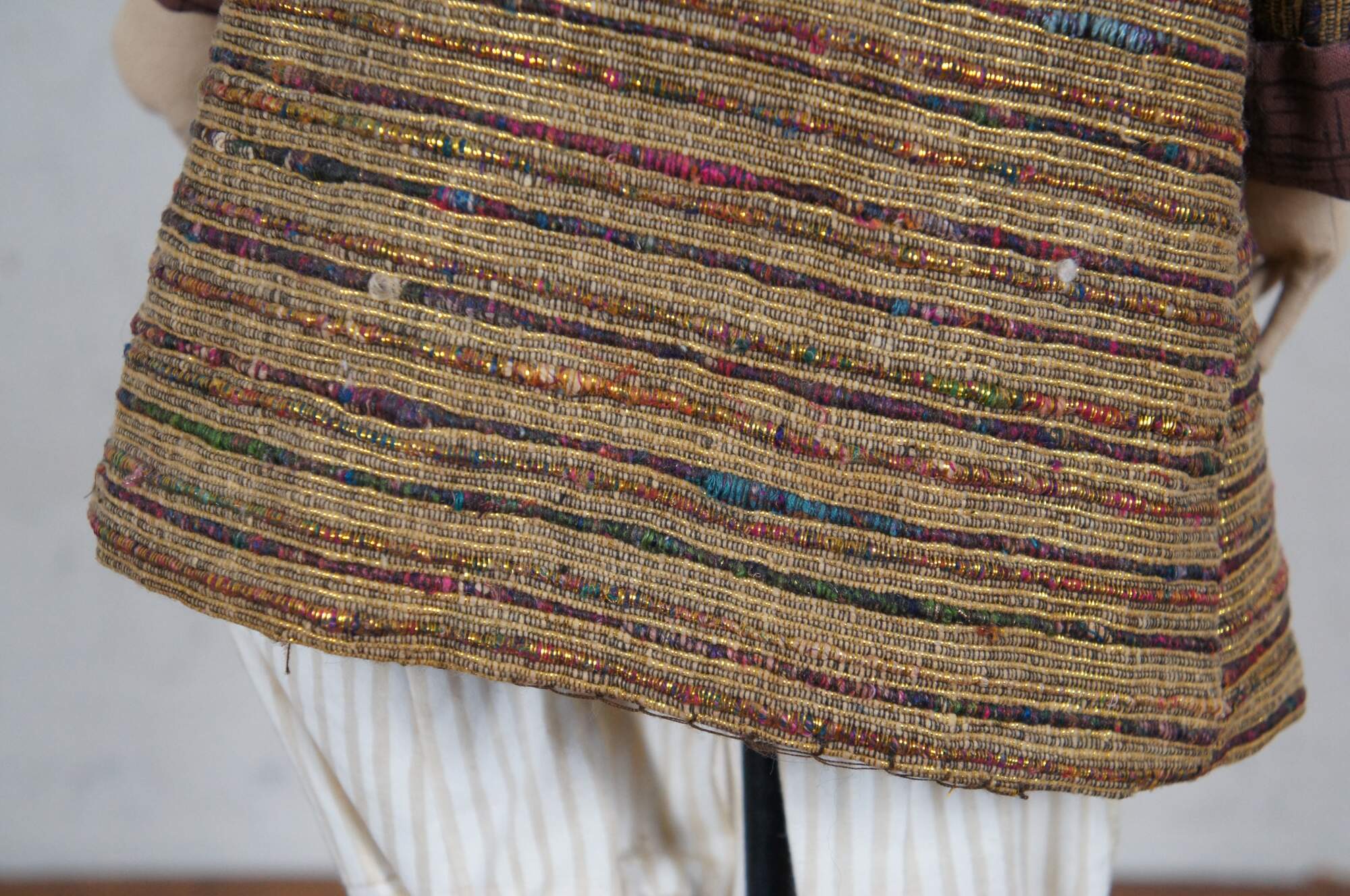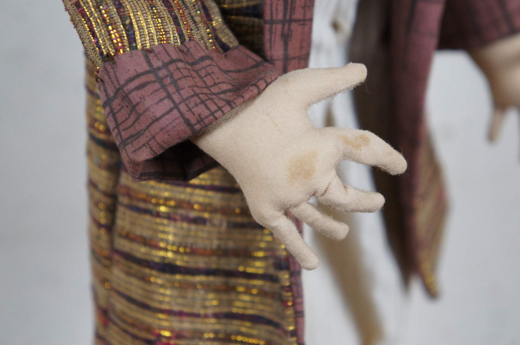 Vintage 20th century cotton needle sculpted nativity creche doll / puppet with wire armature , wearing a floral top, striped pants, metallic robe / jacket, orange heeled shoes / feet and a spotted cap. Partially stiched, partially painted features with a large nose and stuck out tongue / lower lip and curly white hair.