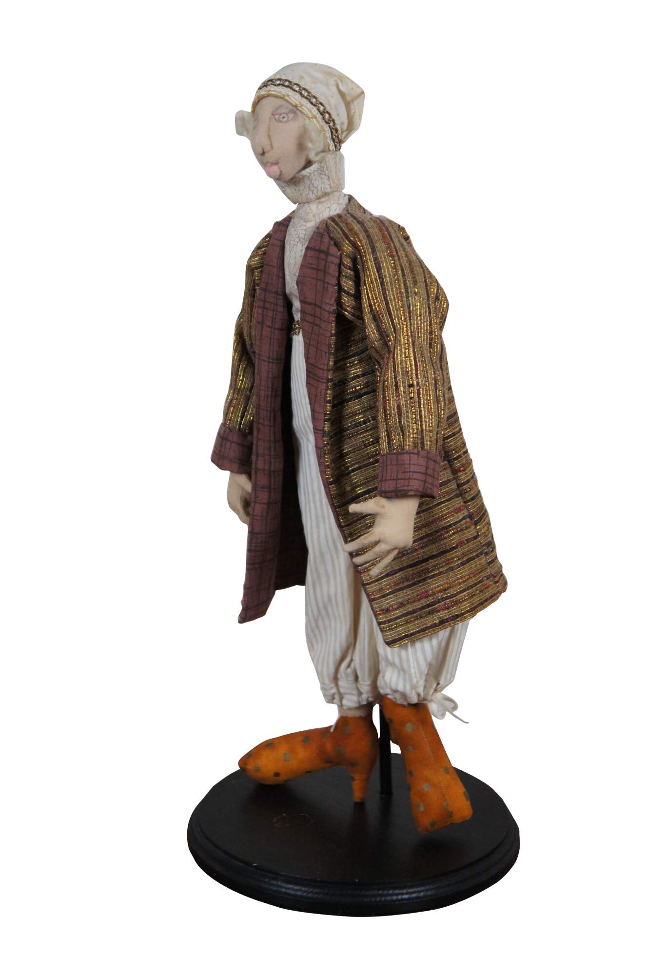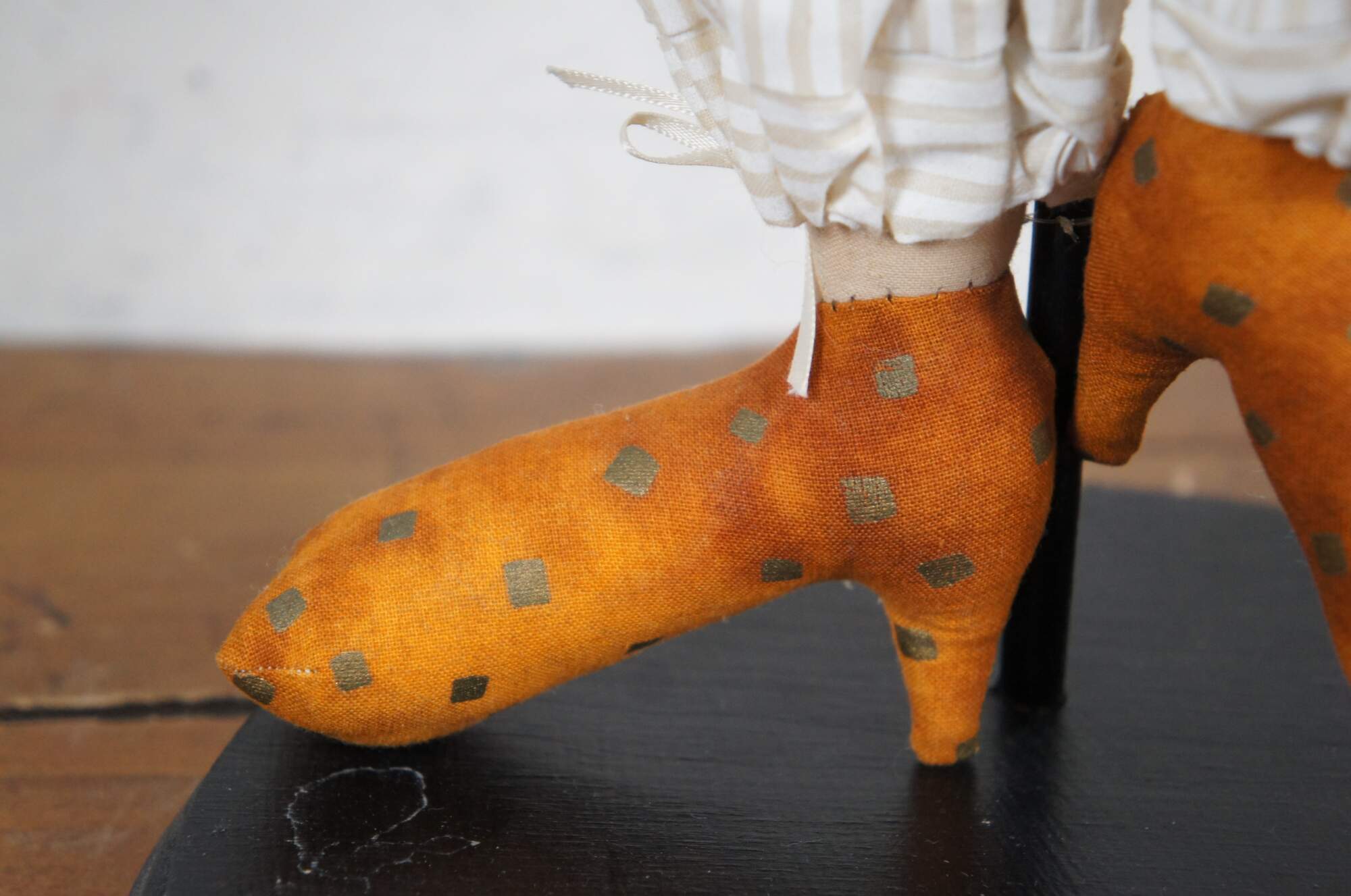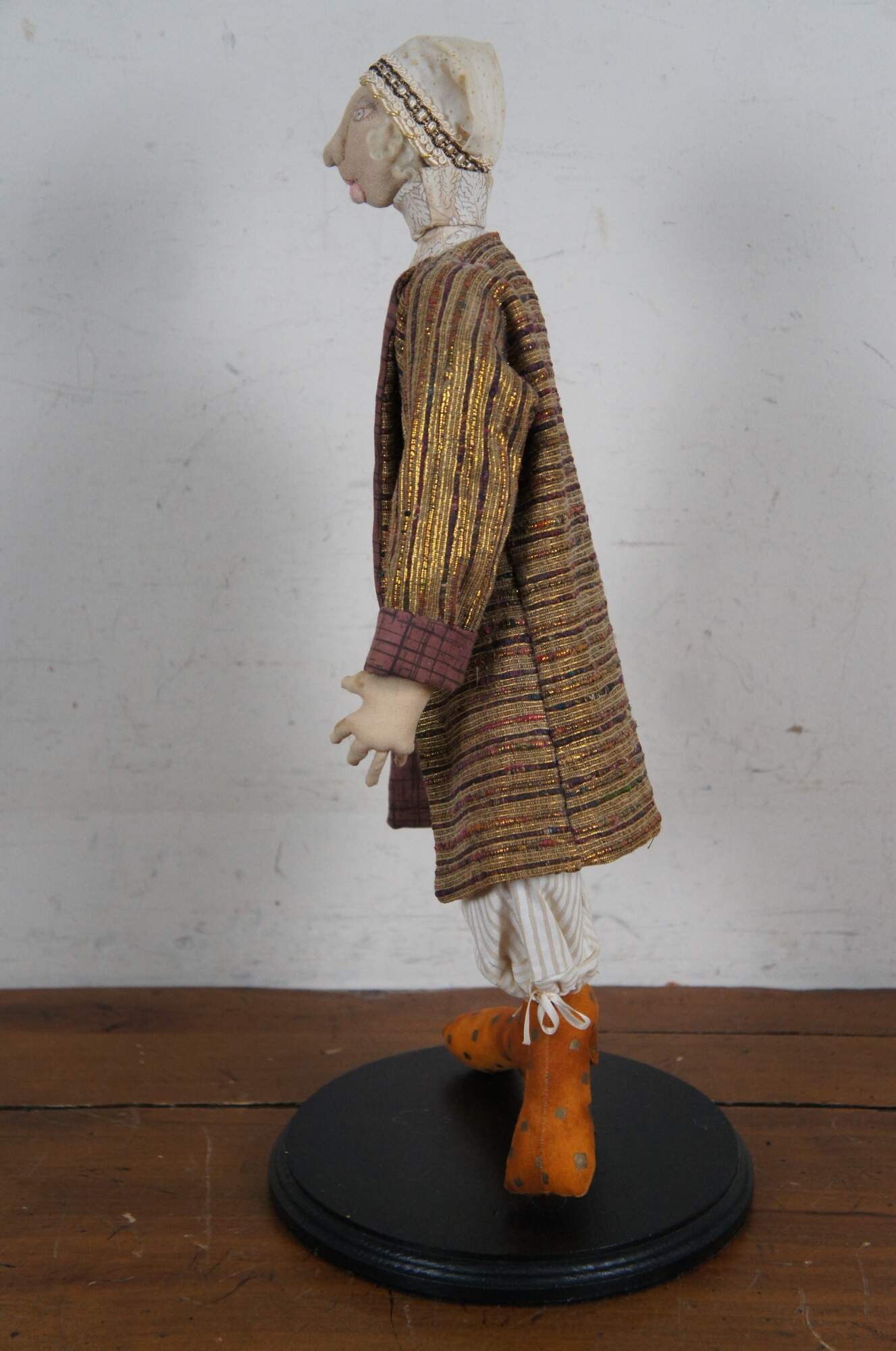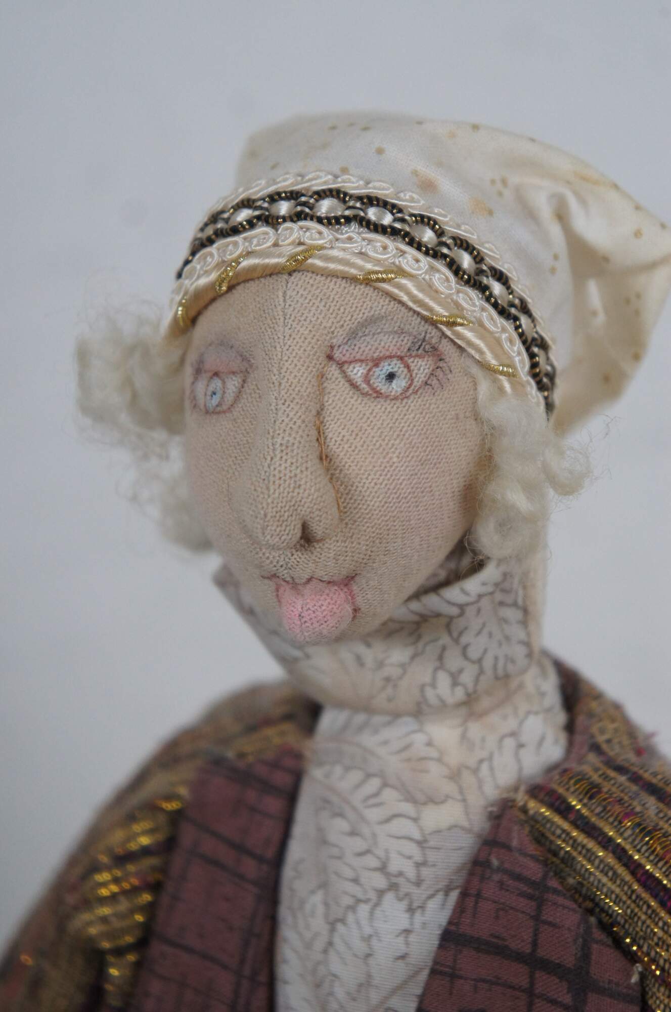 Vintage 20th century cotton needle sculpted nativity creche doll / puppet with wire armature , wearing a floral top, striped pants, metallic robe / jacket, orange heeled shoes / feet and a spotted cap. Partially stiched, partially painted features with a large nose and stuck out tongue / lower lip and curly white hair.