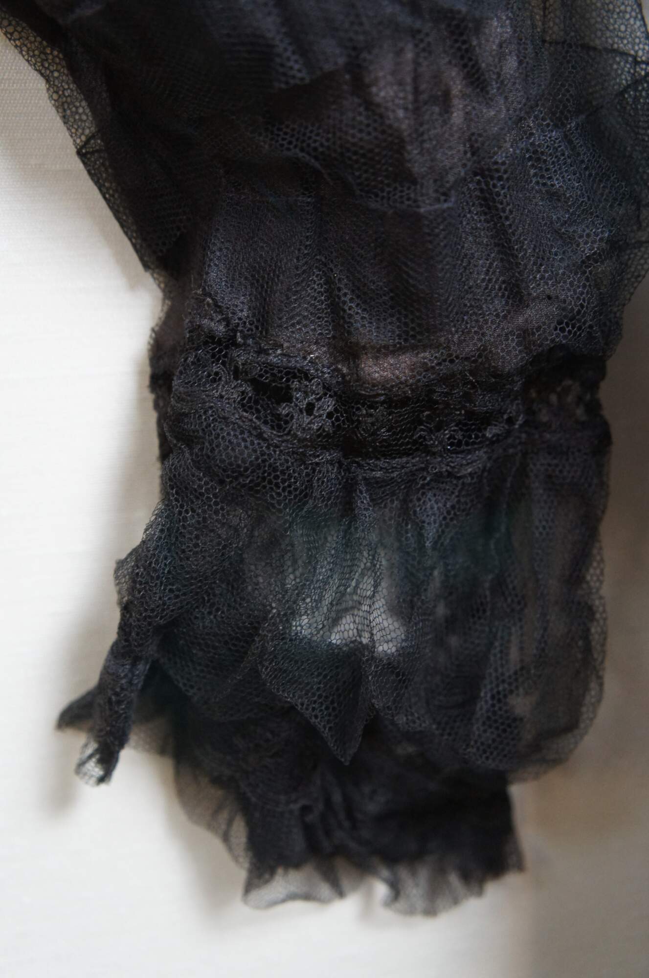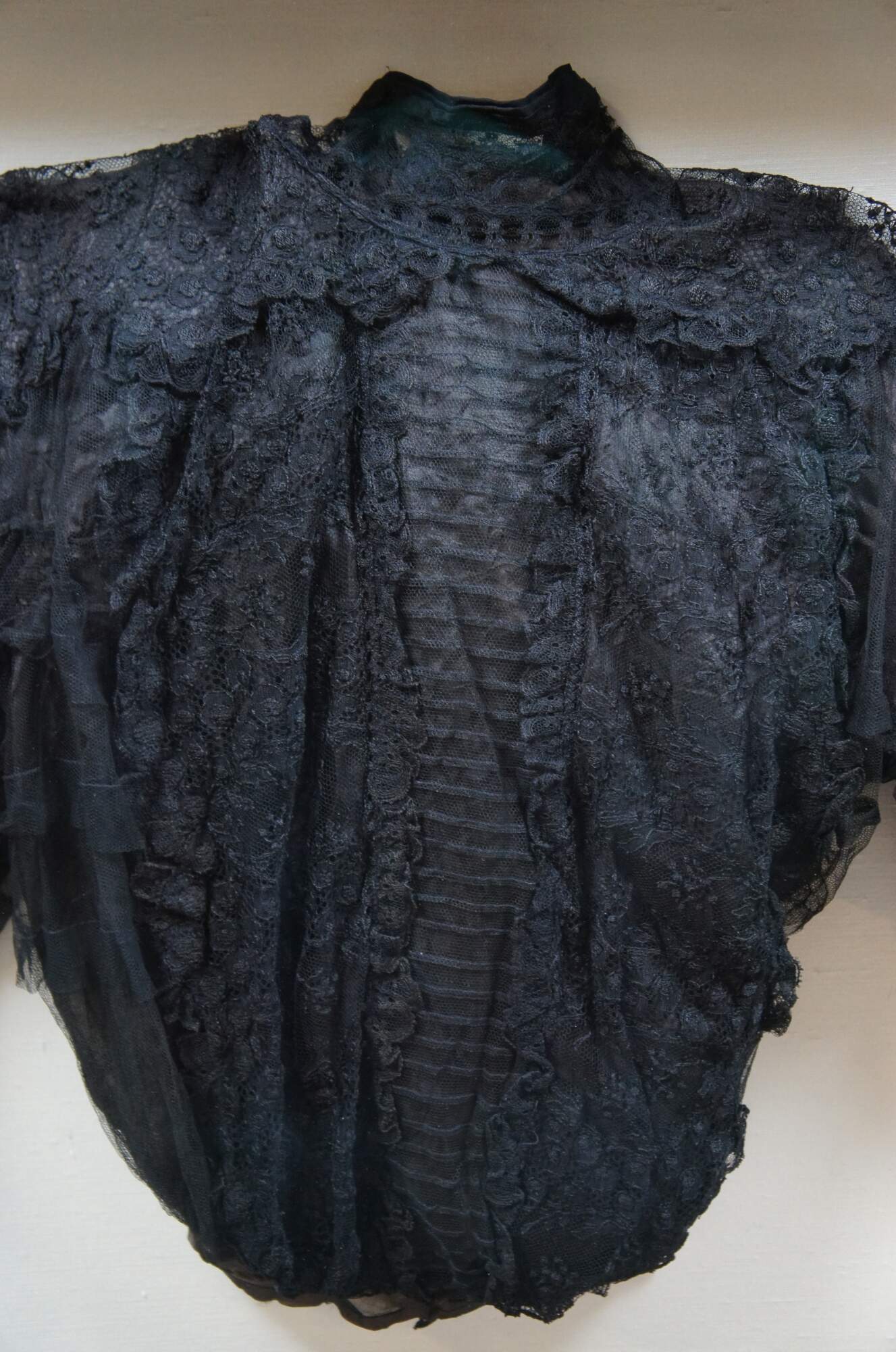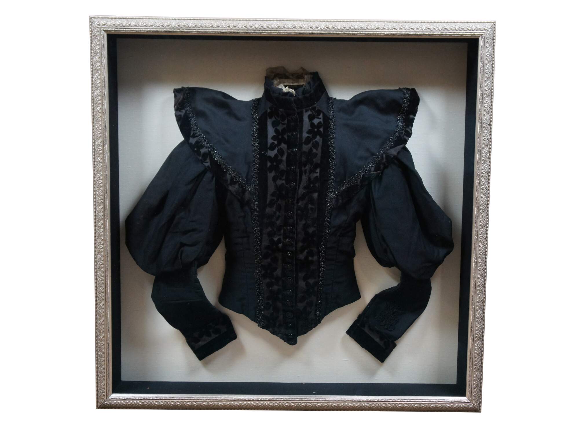 Impressive pair of circa 1890's Victorian women's dress tops. One elaborately layered black lace / mesh shirtwaist with leg og mutton / gigot sleeve. And one black bodice / jacket in cotton with floral burnt velvet accents at the cuffs, collar and placket, corded foliate detail at the cuffs, waving beaded trim and shiny black buttons. Mounted on off white fabric in contemporary carved champagne gilt shadowbox frames.