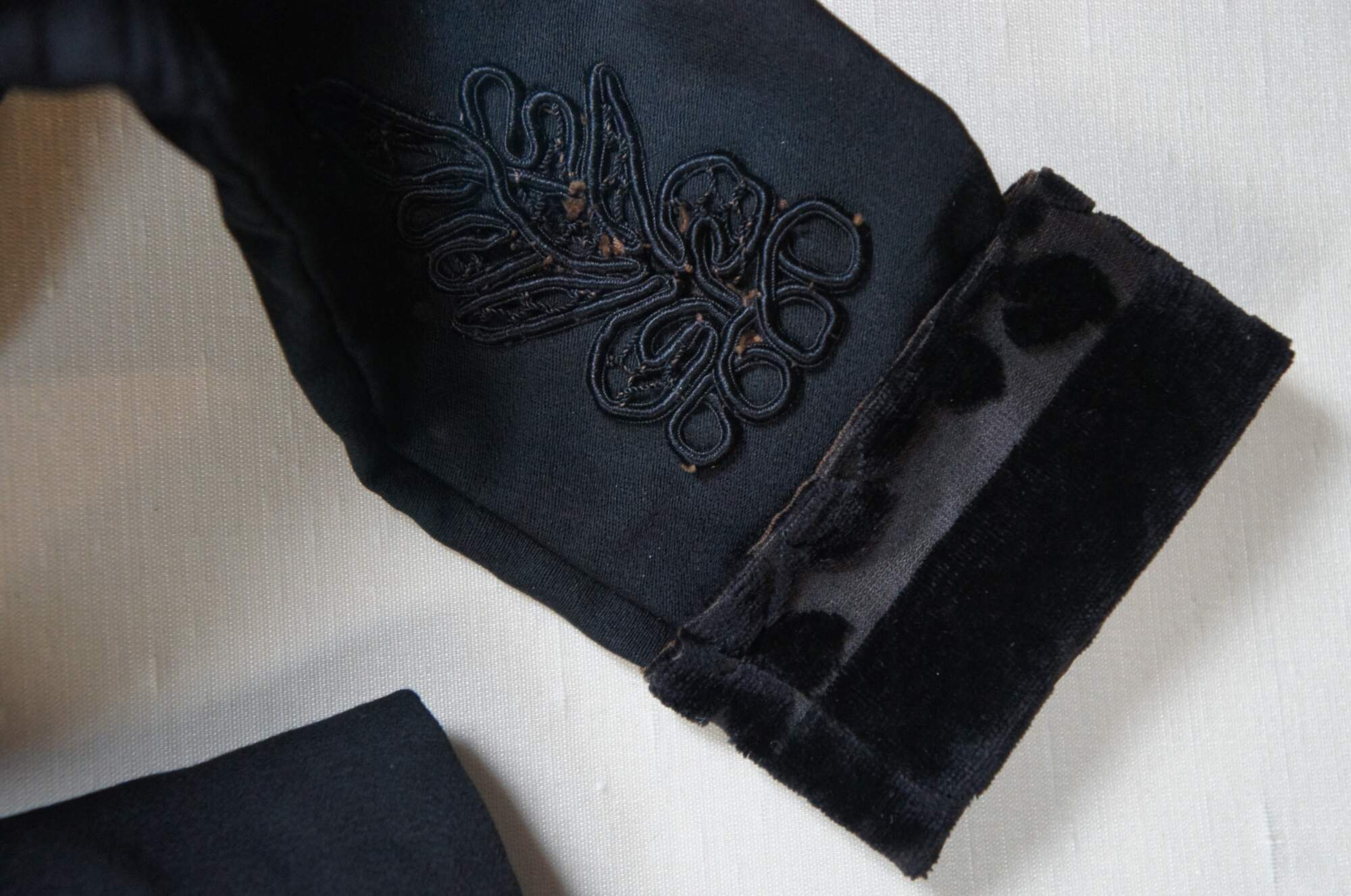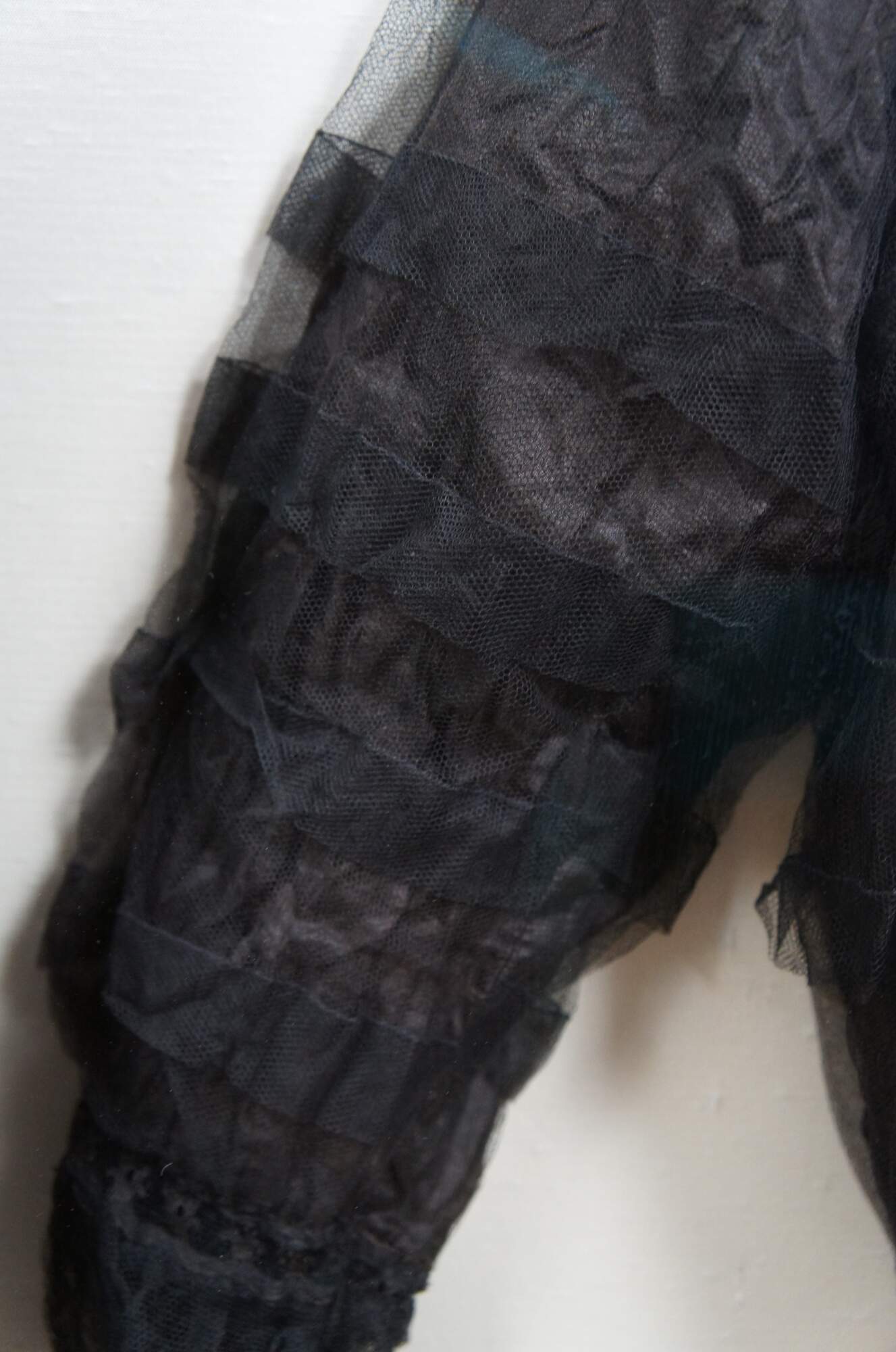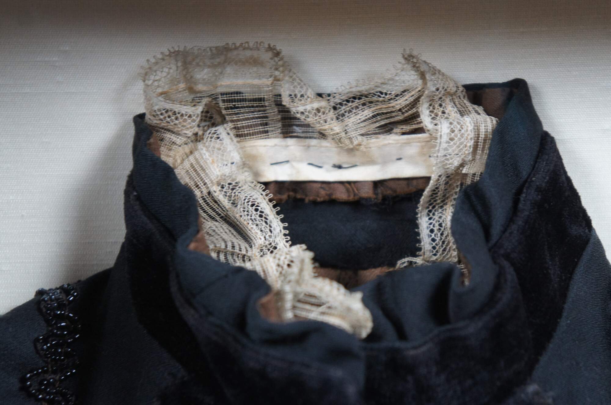 Impressive pair of circa 1890's Victorian women's dress tops. One elaborately layered black lace / mesh shirtwaist with leg og mutton / gigot sleeve. And one black bodice / jacket in cotton with floral burnt velvet accents at the cuffs, collar and placket, corded foliate detail at the cuffs, waving beaded trim and shiny black buttons. Mounted on off white fabric in contemporary carved champagne gilt shadowbox frames.