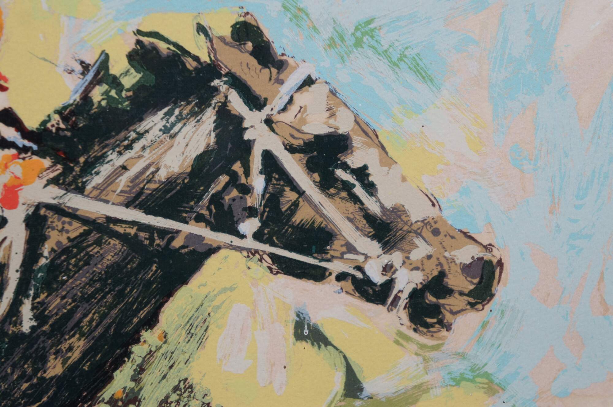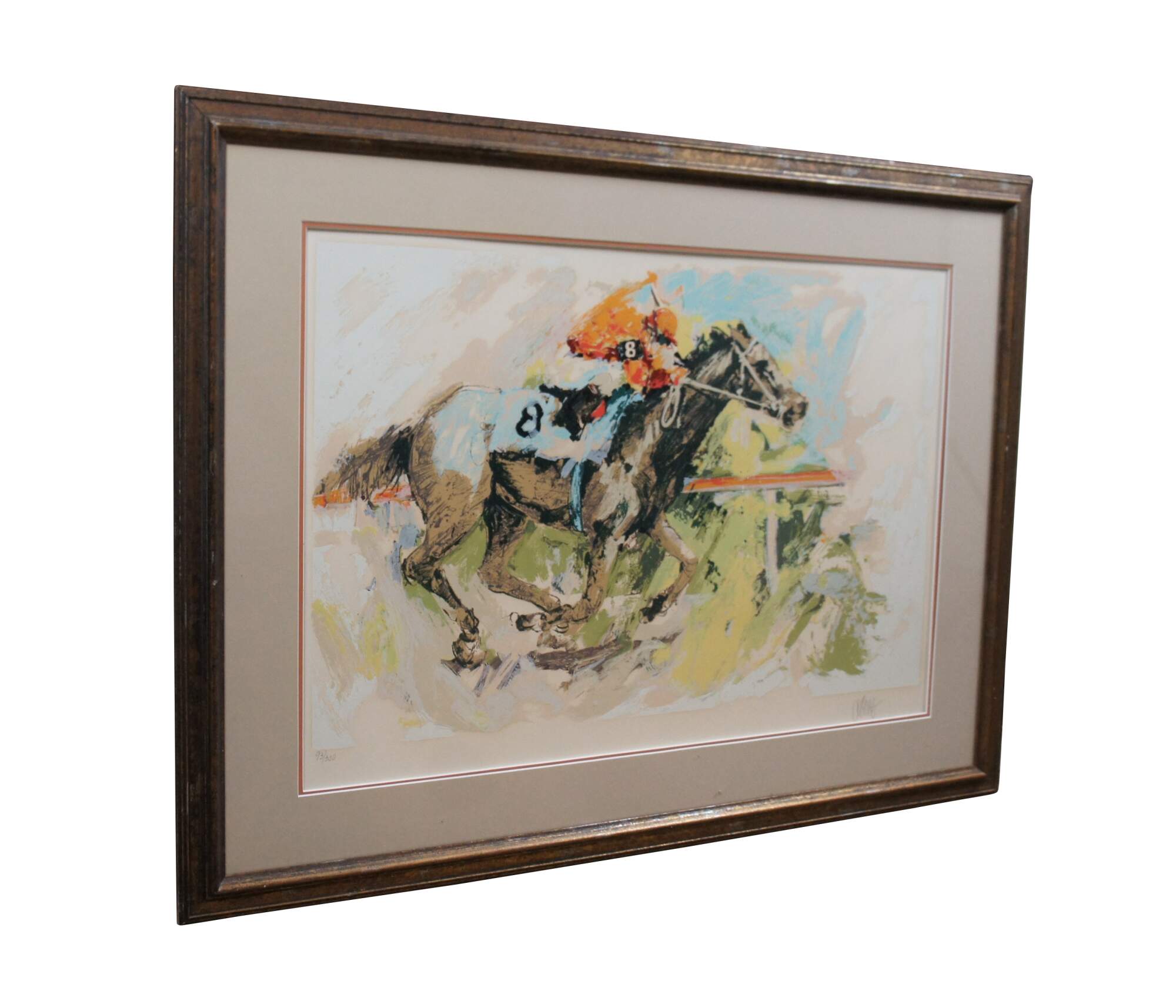 Late 20th century serigraph print titled "Horse Race" by Wayland Moore, featuring a Number 8 horse and jockey in the midst of a race. Pencil signed and numbered 93/300 along the lower edge.