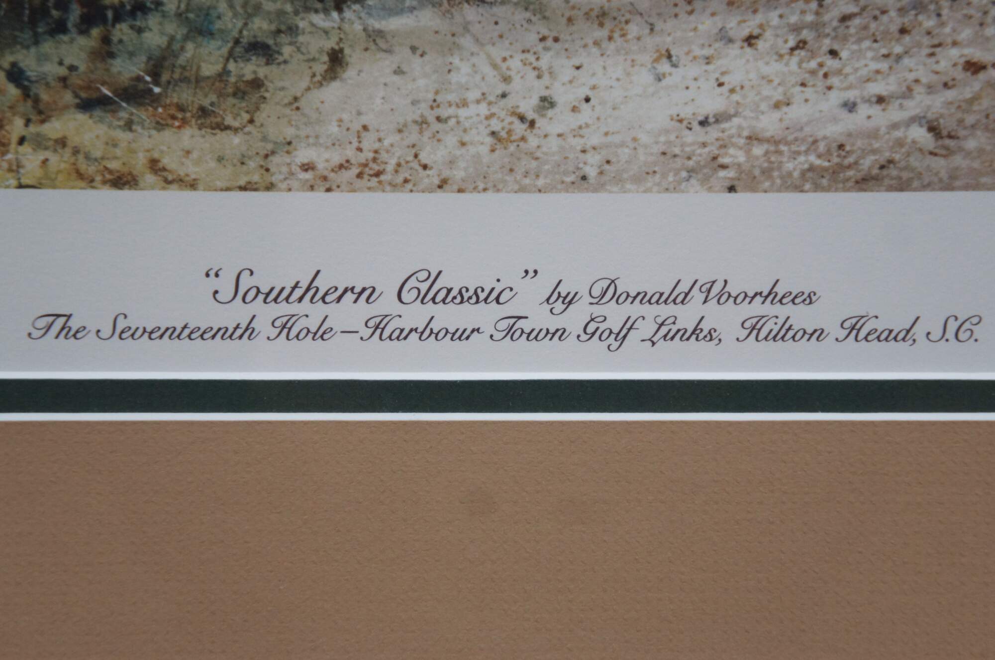 Late 20th century limited edition, signed digital press print of "Southern Classic" golf tournament by Donald Voorhees - The Seventeenth Hole - Harbour Town Golf Links, Hilton Head, S.C. Pencil signed and numbered 190/950 in lower right corner. Beveled / grooved giltwood frame; beige and dark green layered mat.