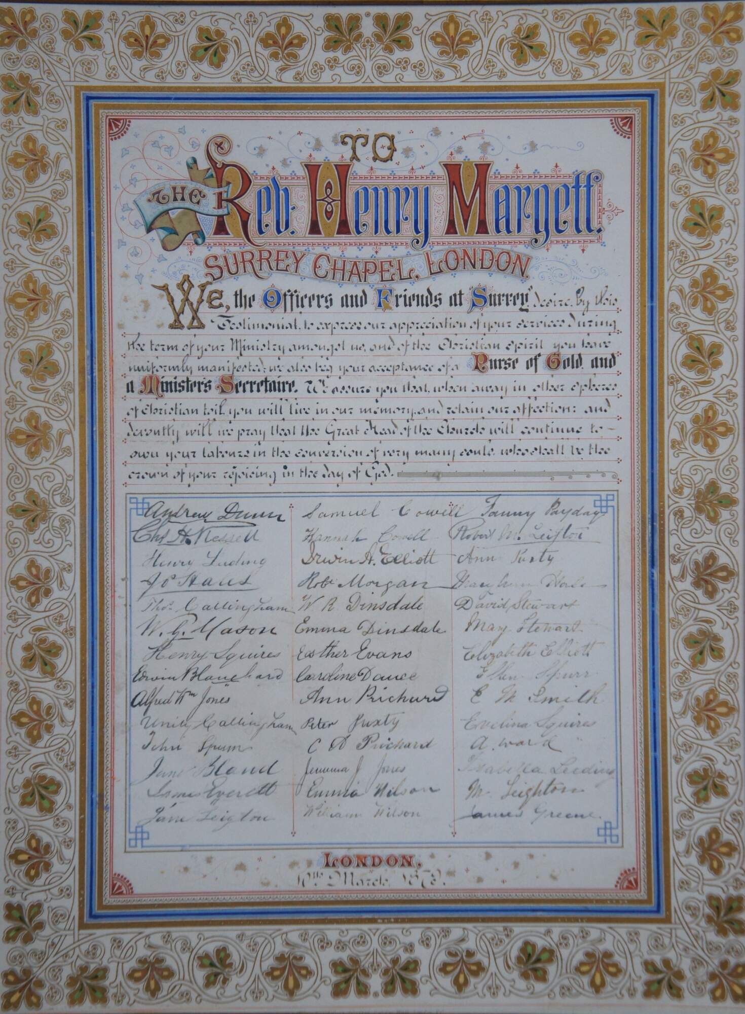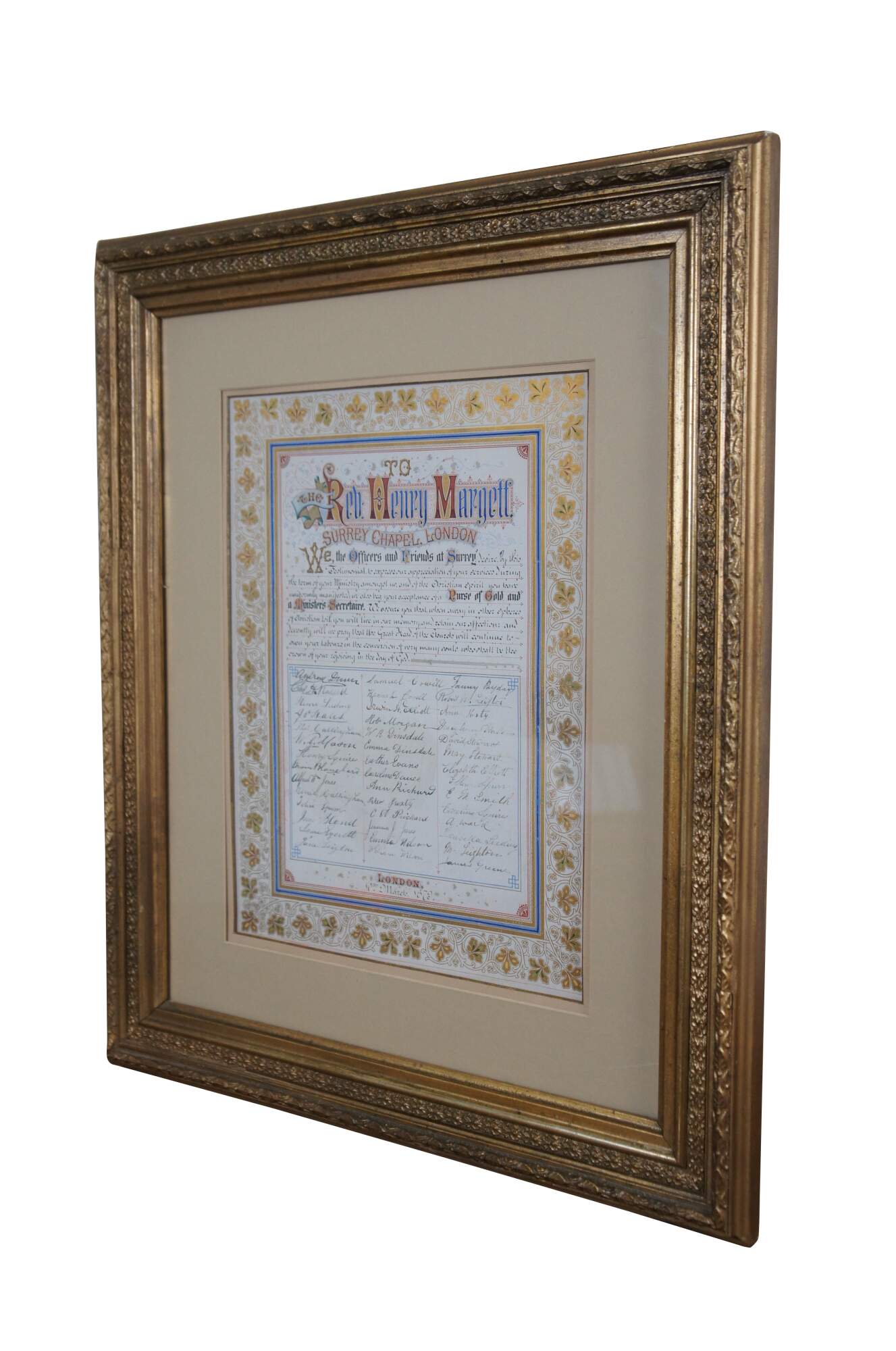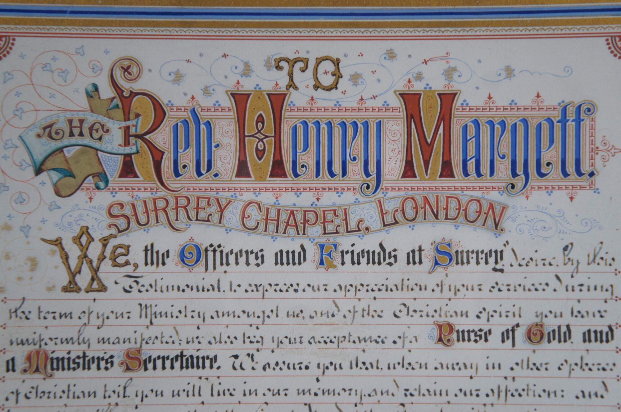 Rare antique illuminated fraktur style, illustrated certificate / address "To The Rev. Henry Margett, Surrey Chapel, London (England)" appearing to commemorate his time at the chapel with the gift of a "Purse of Gold and a Ministers Secretaire." Signed below the address by the Officers and Friends of Surrey. Dated 10th March 1879.