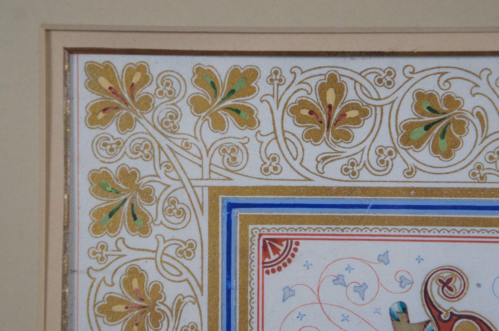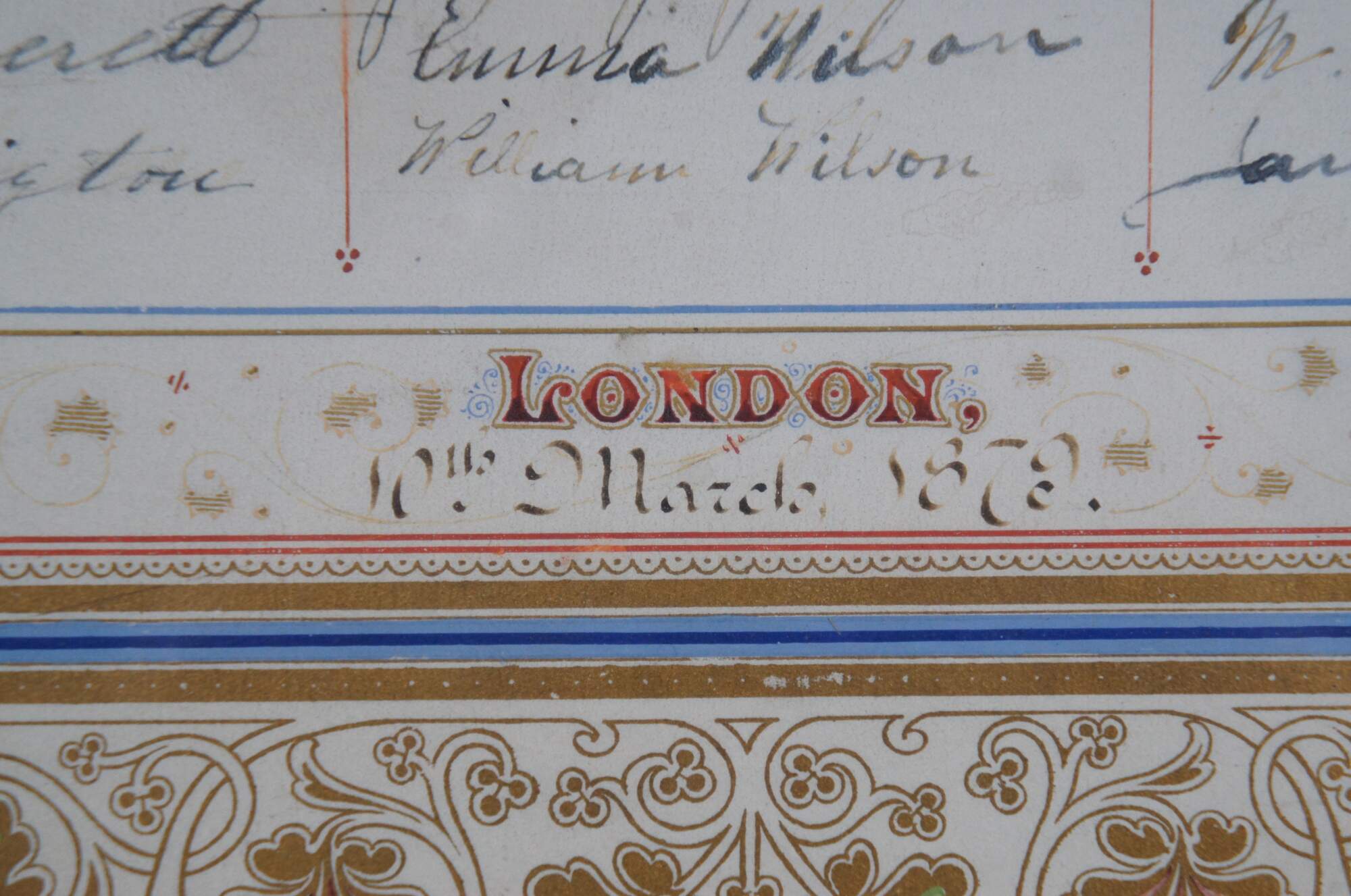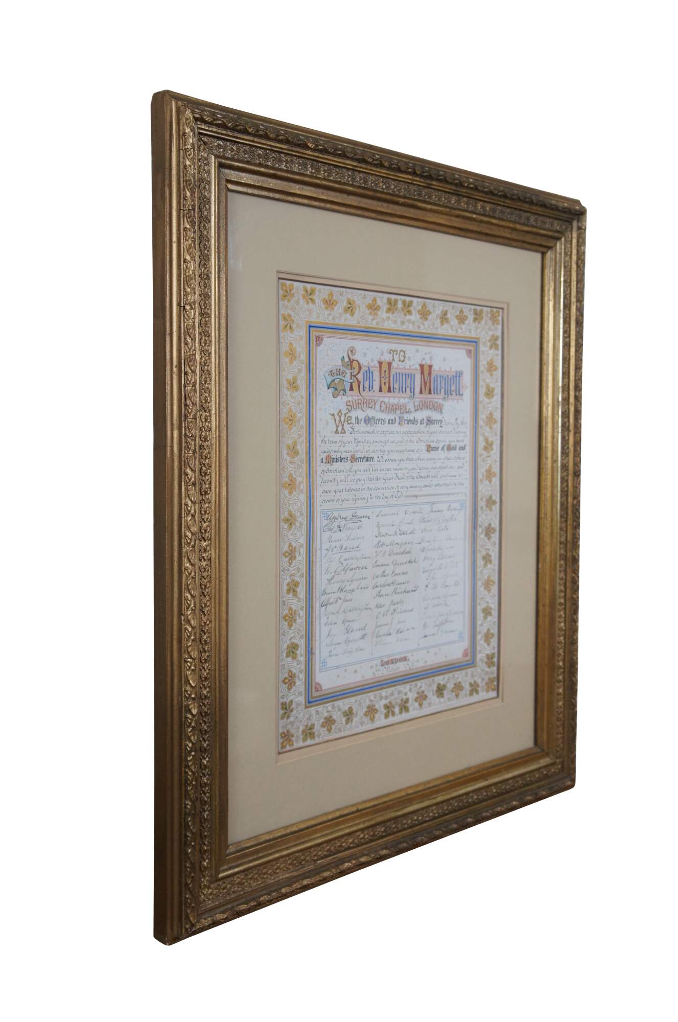 Rare antique illuminated fraktur style, illustrated certificate / address "To The Rev. Henry Margett, Surrey Chapel, London (England)" appearing to commemorate his time at the chapel with the gift of a "Purse of Gold and a Ministers Secretaire." Signed below the address by the Officers and Friends of Surrey. Dated 10th March 1879.