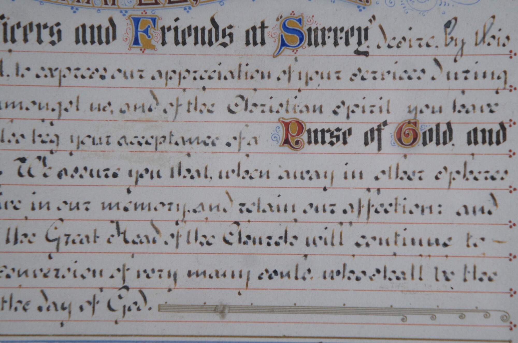 Text reads: "We, the Officers and Friends at Surrey desire by this Testimonial to express our appreciation of your services during the term of your Ministry amongst us, and of the Christian spirit you have uniformly manifested; we also beg your acceptance of a Purse of Gold and a Ministers Secretaire. We assure you that when away in other spheres of Christian toil you will live in our memory and retain our affection: and devoutly will we pray that the Great Head of the Church will continue to own your labors in the conversion of very many souls who shall be the crown of your rejoicing in the day of God.