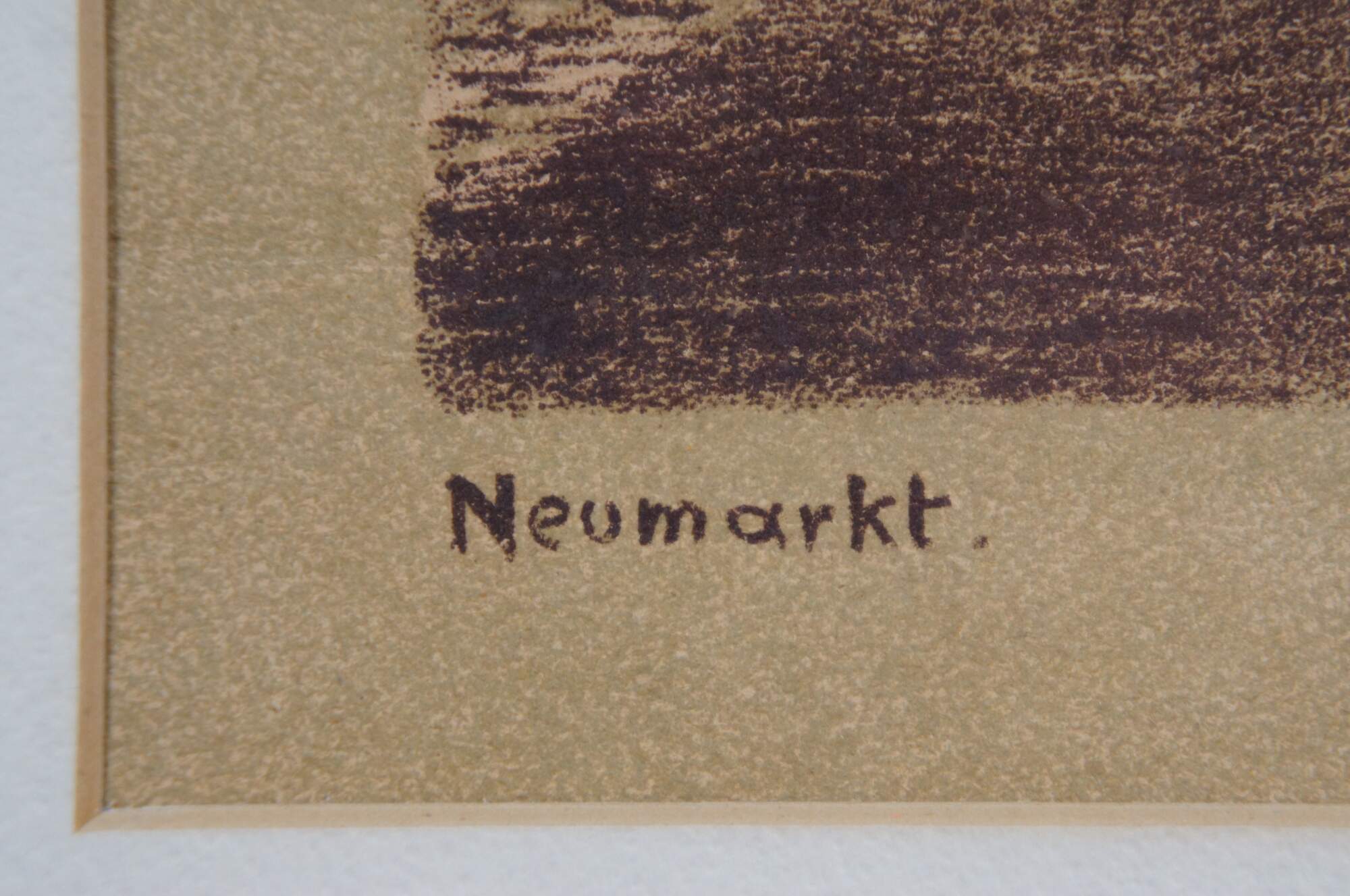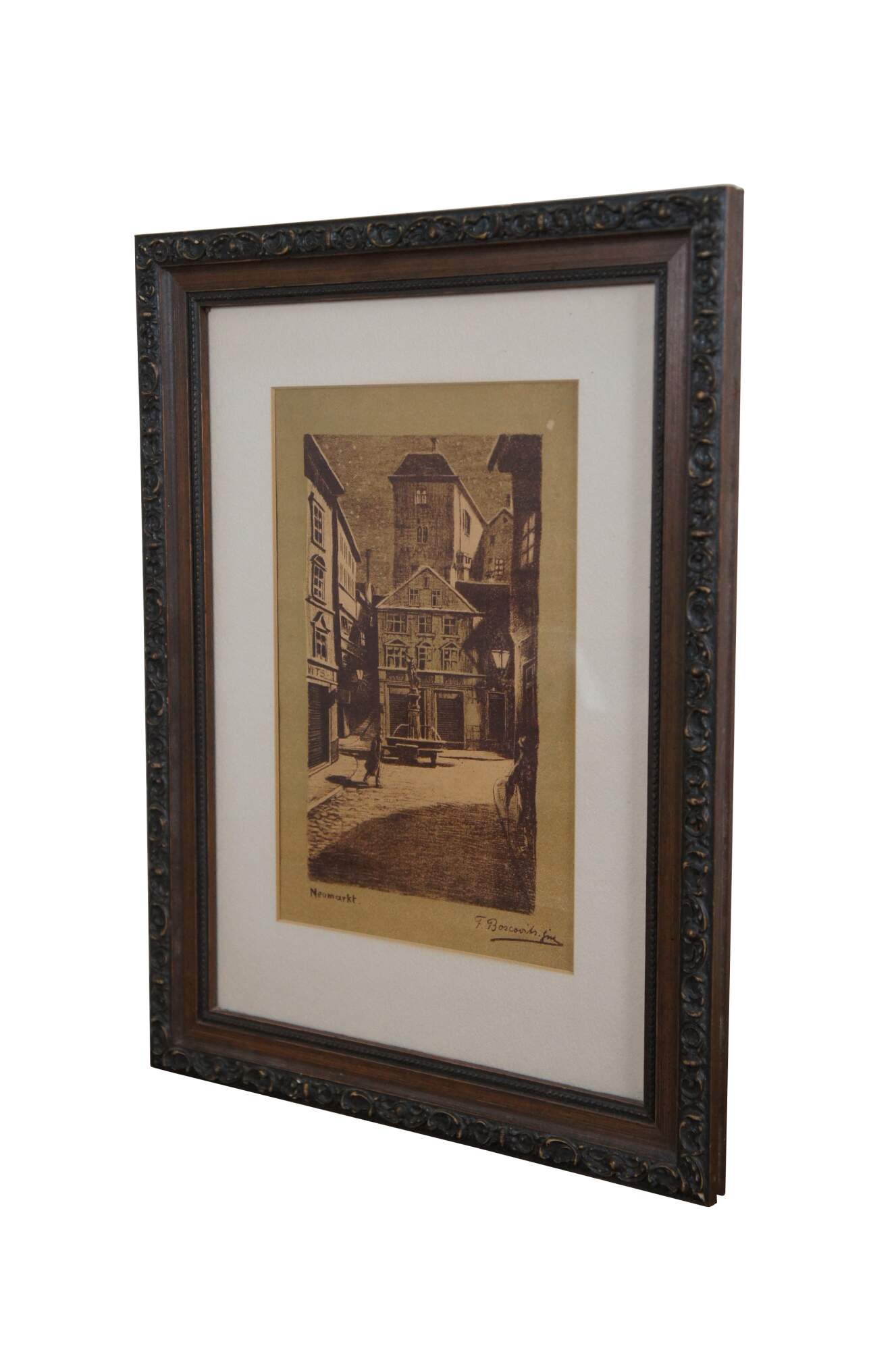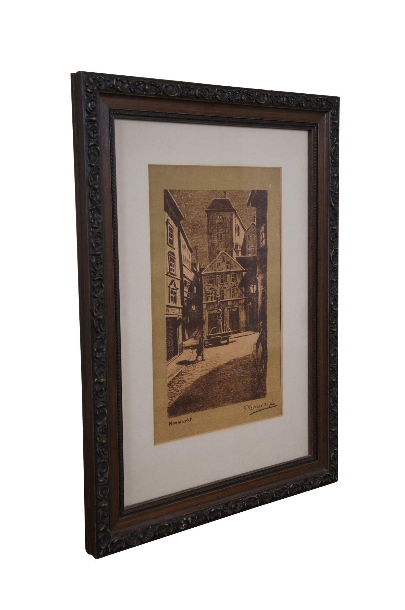 Mid to late 20th century German print depisting Neumarkt Germany's city square with a fountain and figure walking through. Titled "Neumarkt." Floral carved and beaded wood frame; white mat.