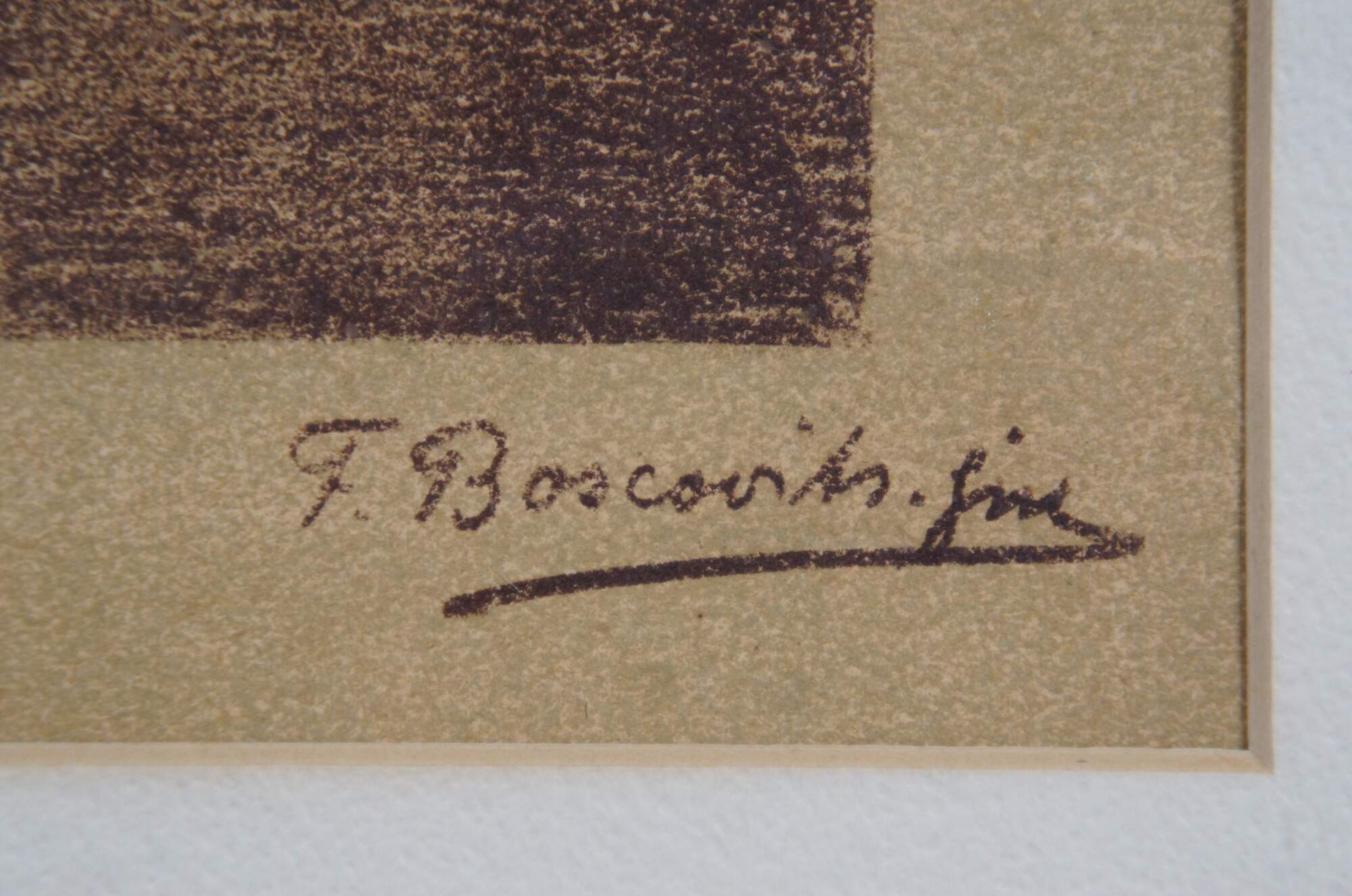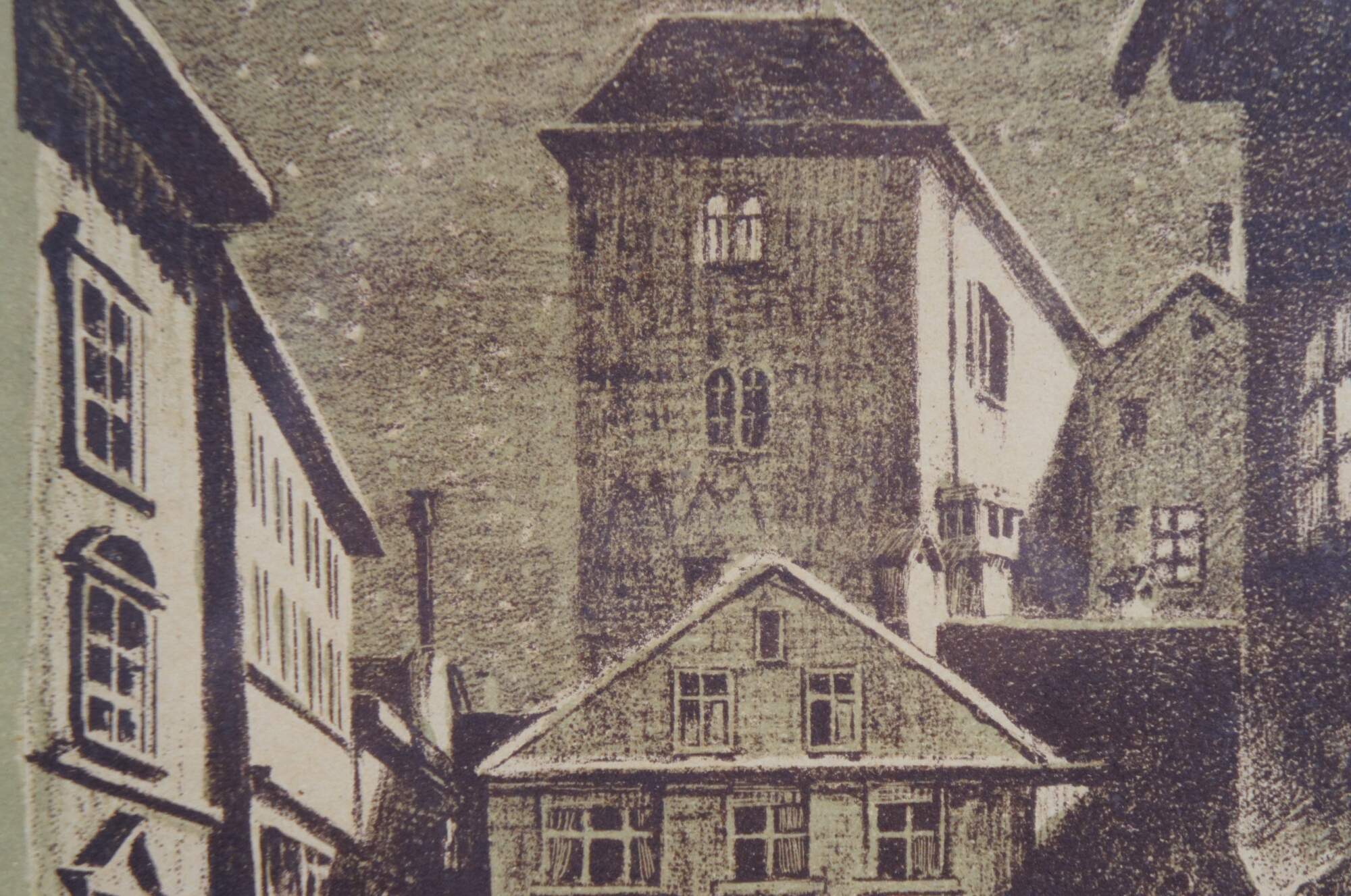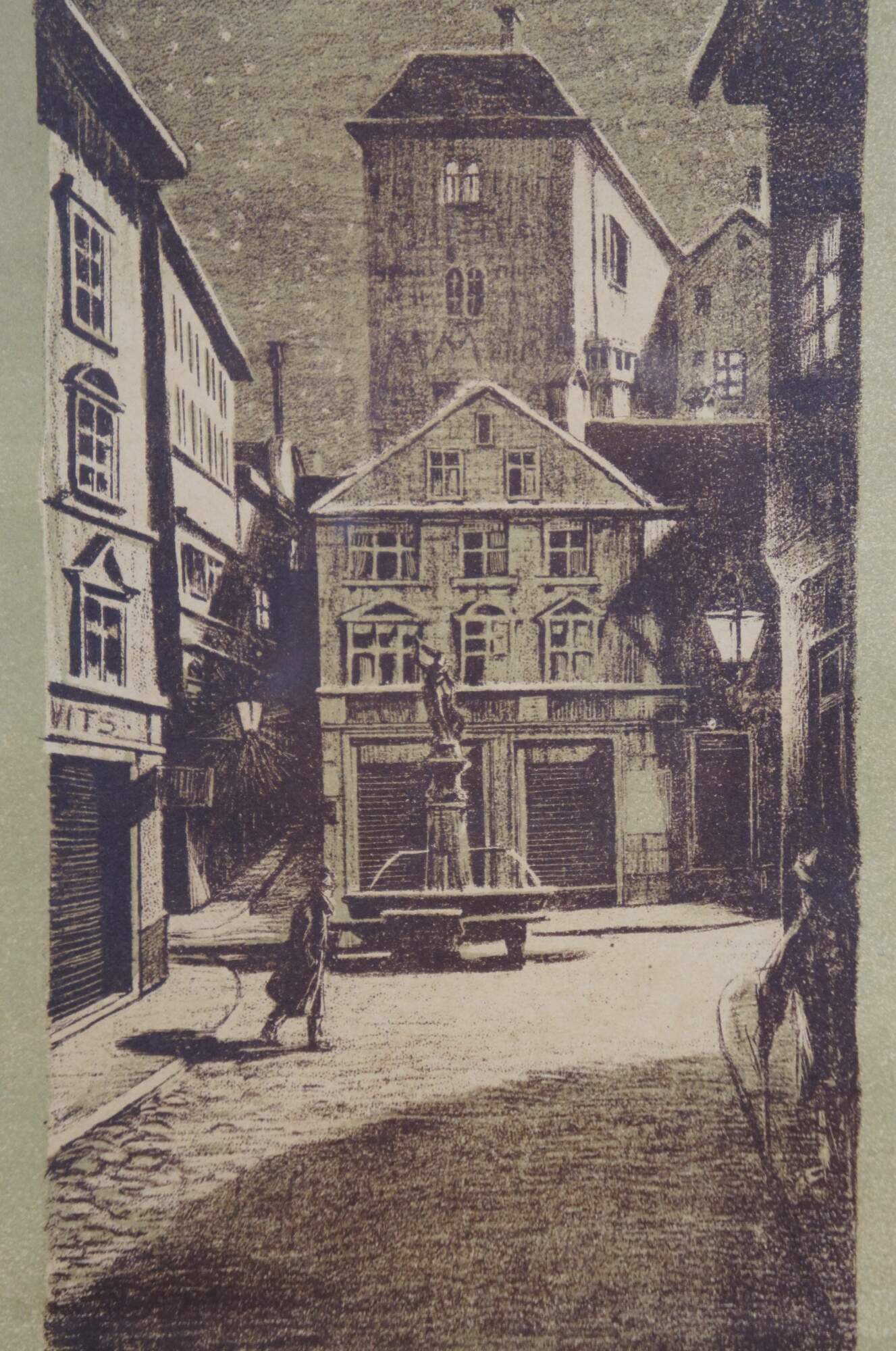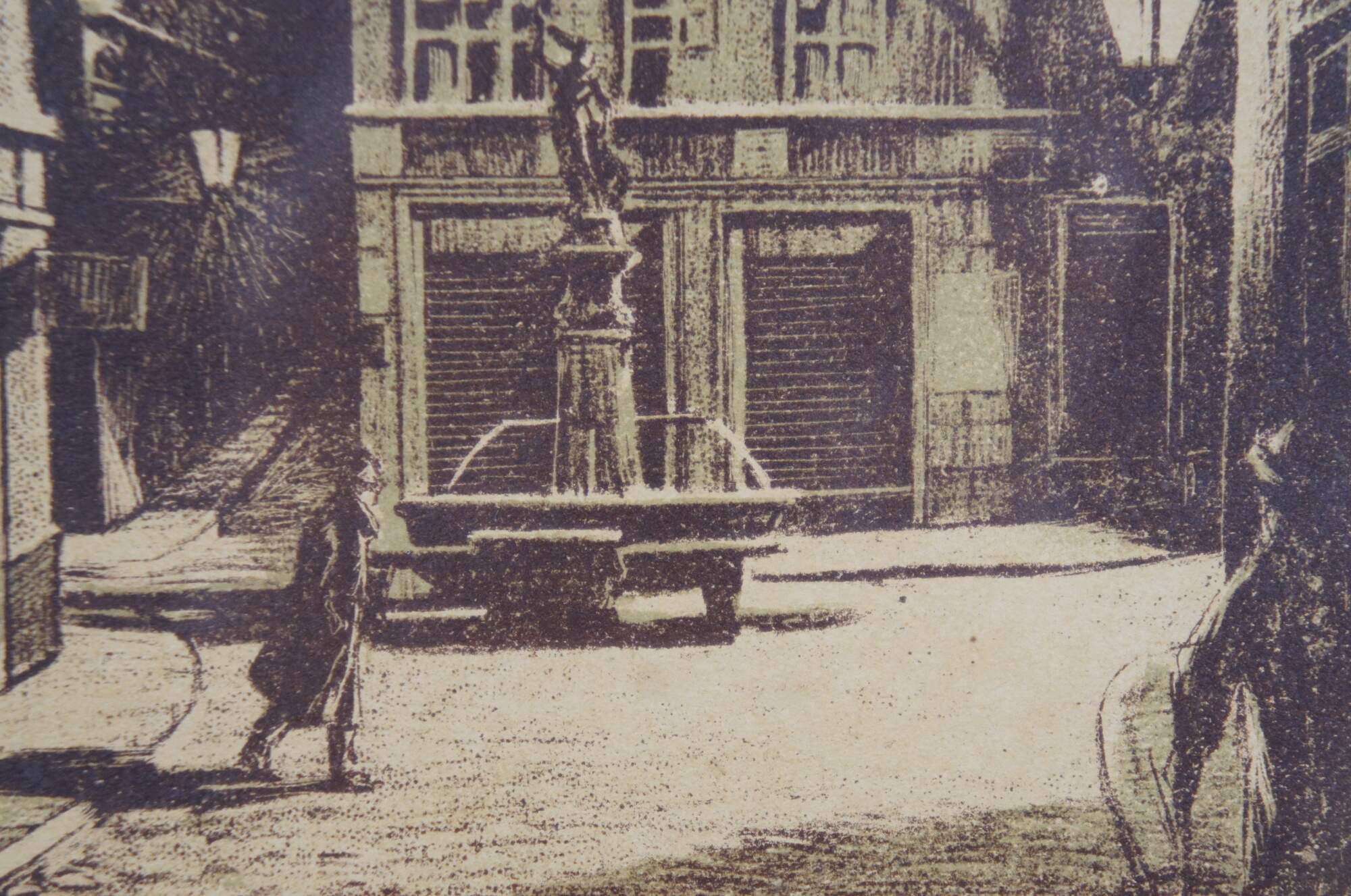Mid to late 20th century German print depisting Neumarkt Germany's city square with a fountain and figure walking through. Titled "Neumarkt." Floral carved and beaded wood frame; white mat.
