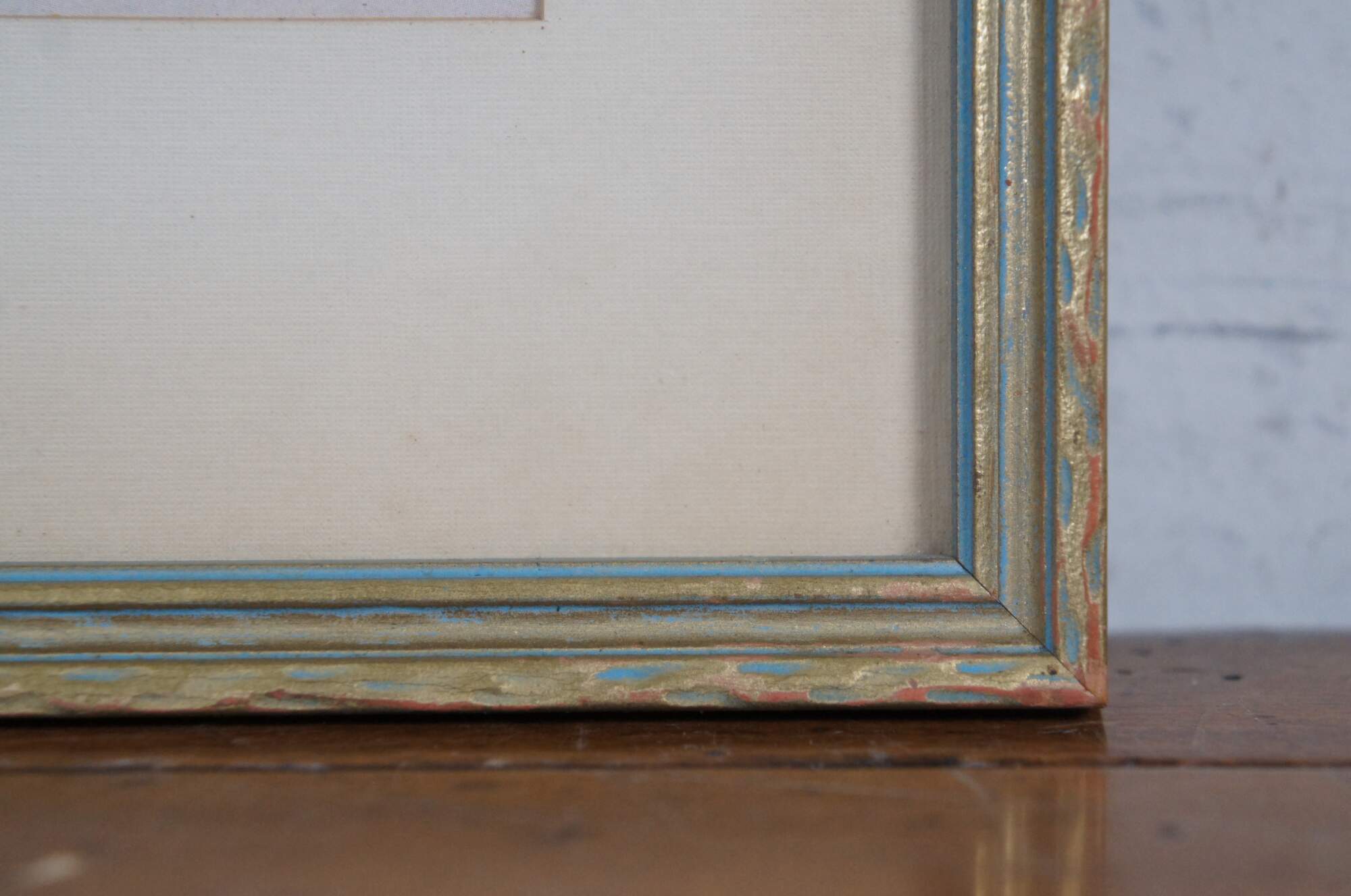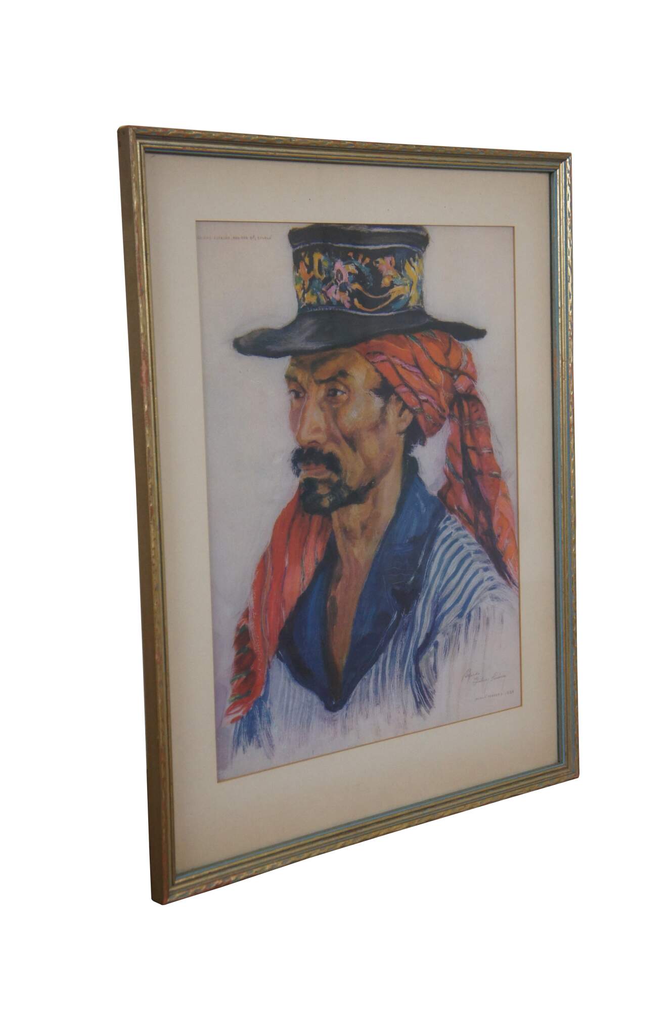 Late 20th century digital press print depicting "The Alderman (Regidor) Mariano Ajcalon" of Solola, Guatemala, painted in 1938 by Alfredo Galvez Suarez. Shows the alderman in an outfit denoting his rank as leader, wearing a blue stripe shirt, red scarf, and floral top hat. From the art portfolio Guatemala Indians, which included 10 of his most famous Native American works. Lightly carved giltwood frame; off white mat.